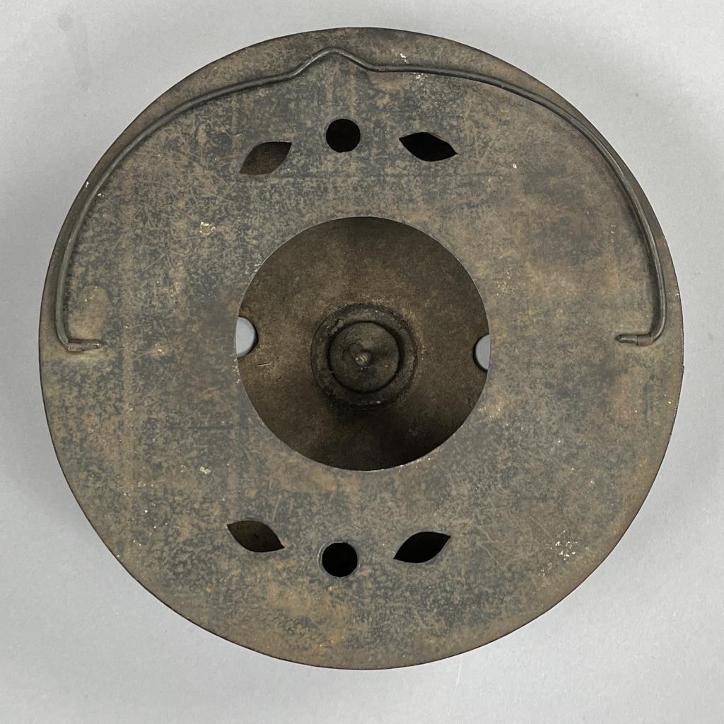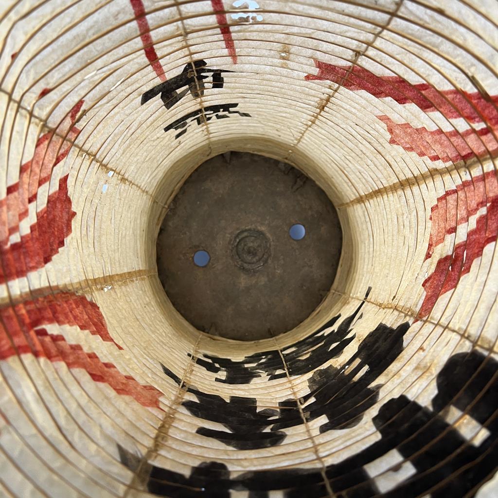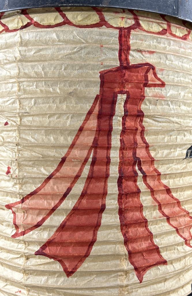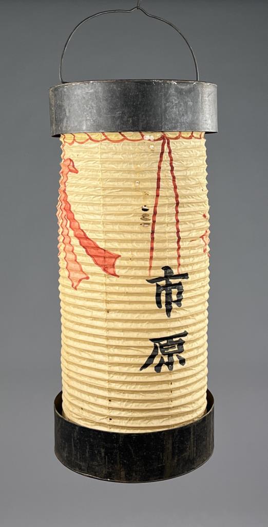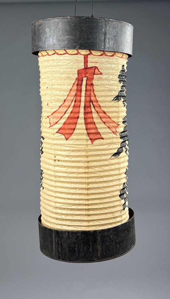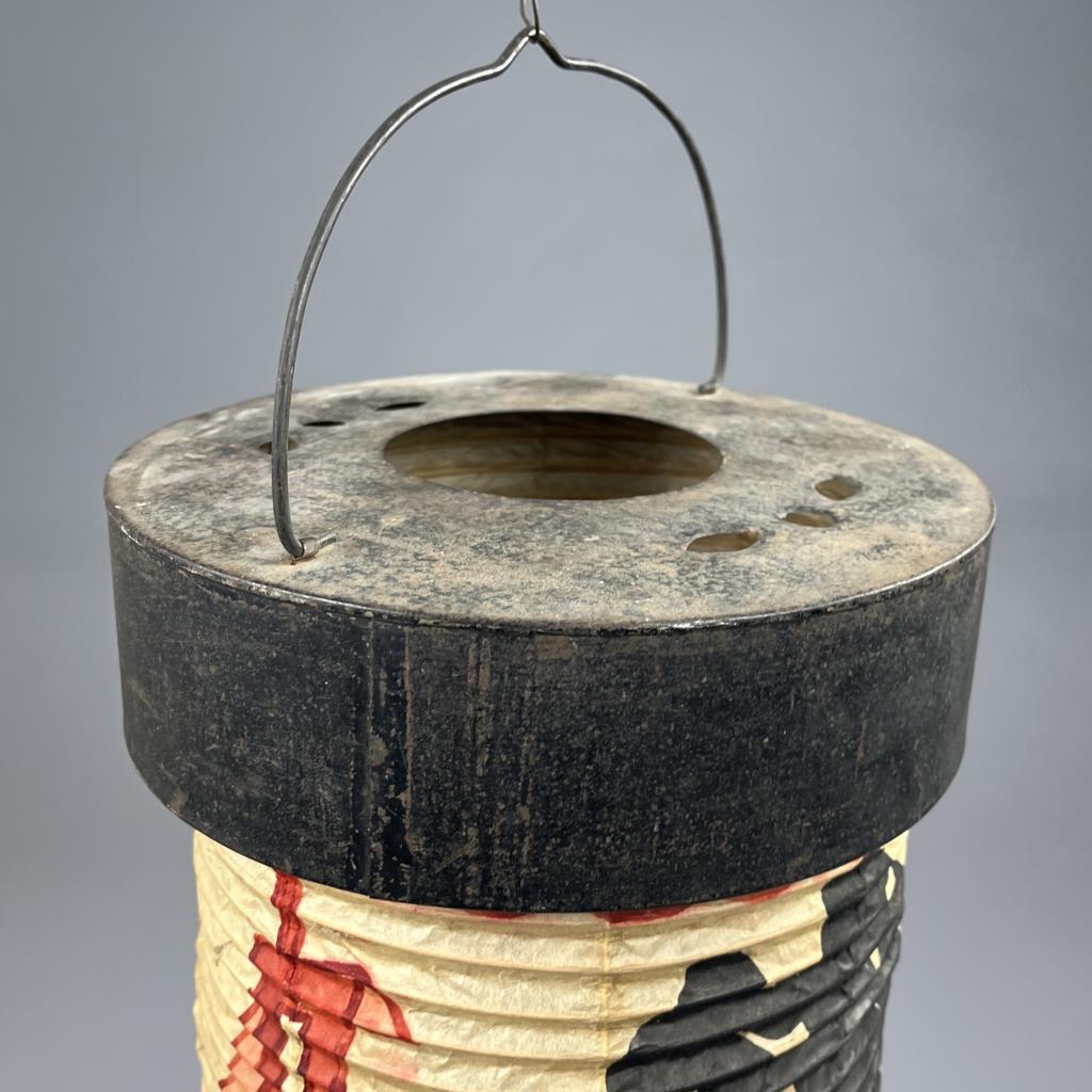 Japanese Chochin, Shinto temple or shrine hanging candle lantern, accordion style washi paper and painted metal frame, 20th Century, approximately 20″ (H) when fully extended.