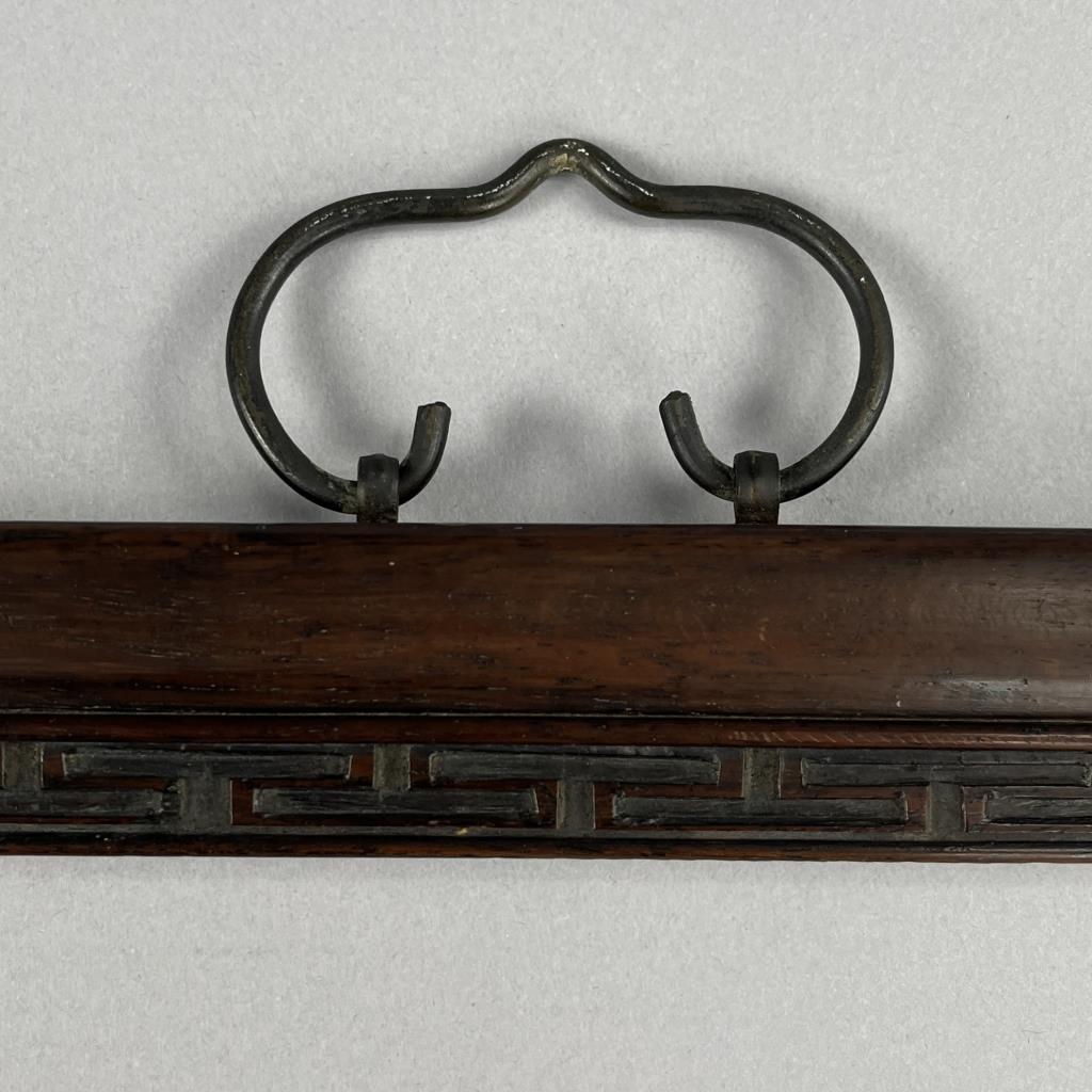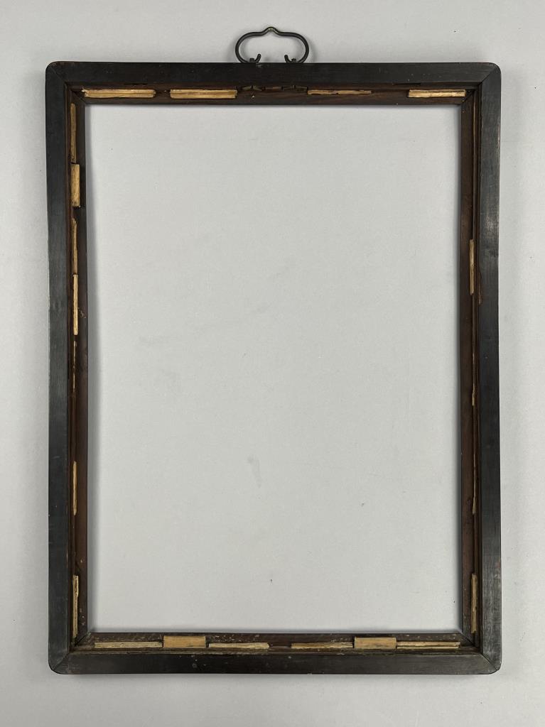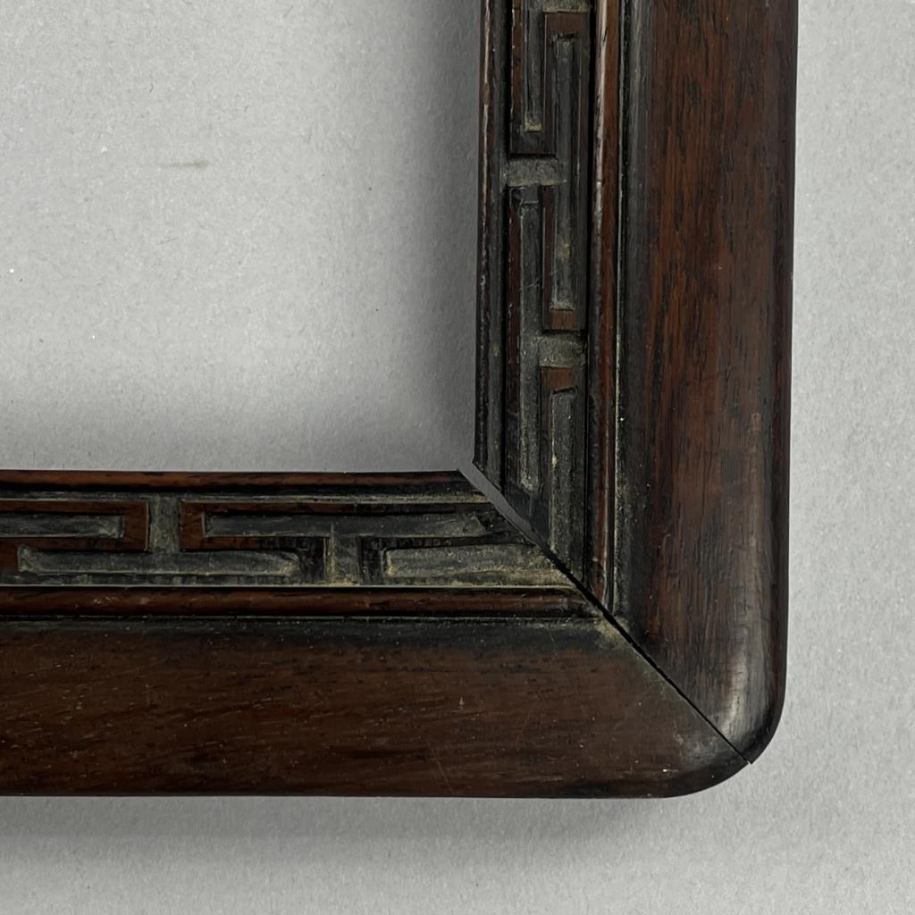 Chinese carved rosewood picture frame, either late Qing Dynasty or early Republic Era, with bronze bail style hanger, circa late 19th / early 20th Century, 26″ x 29-1/4″.
