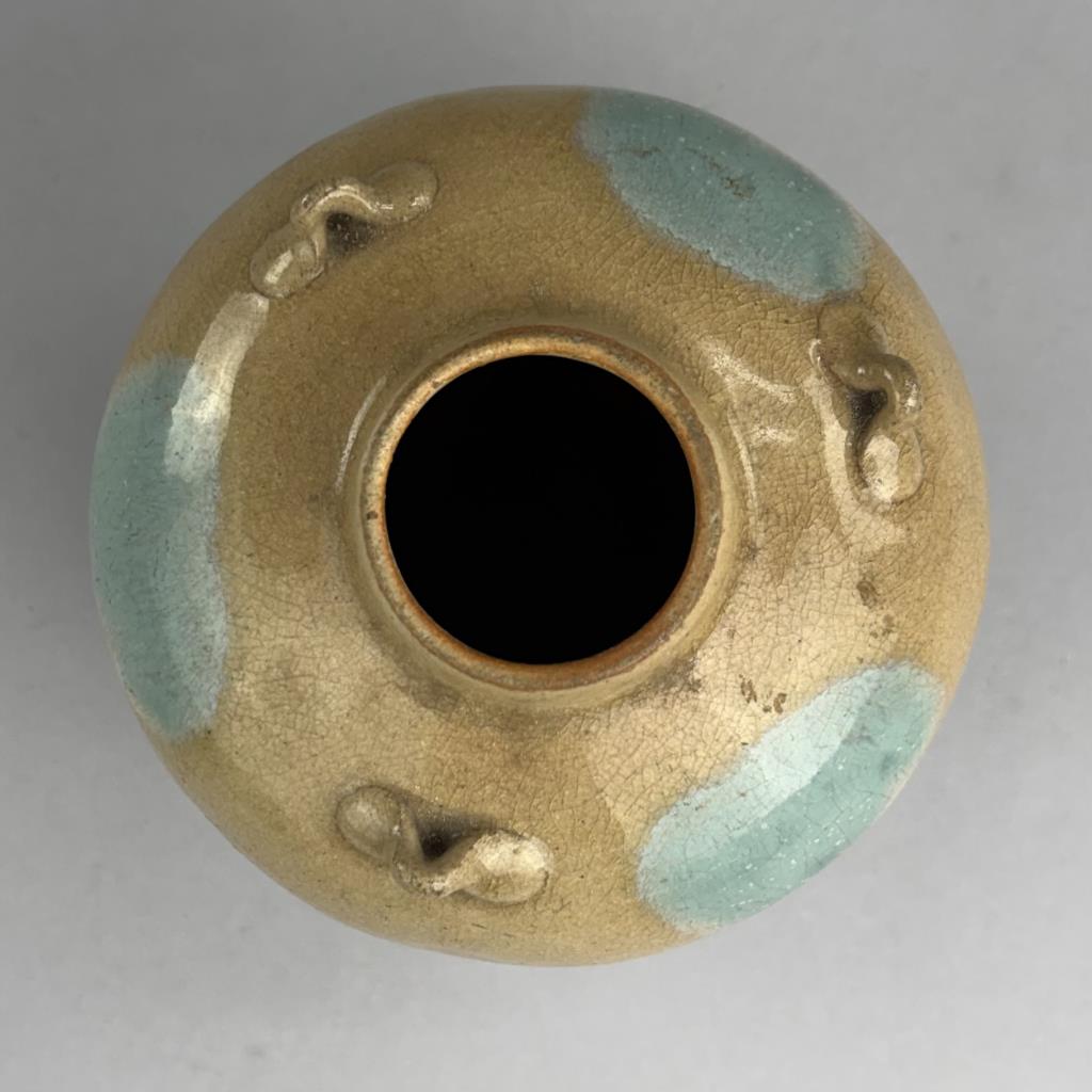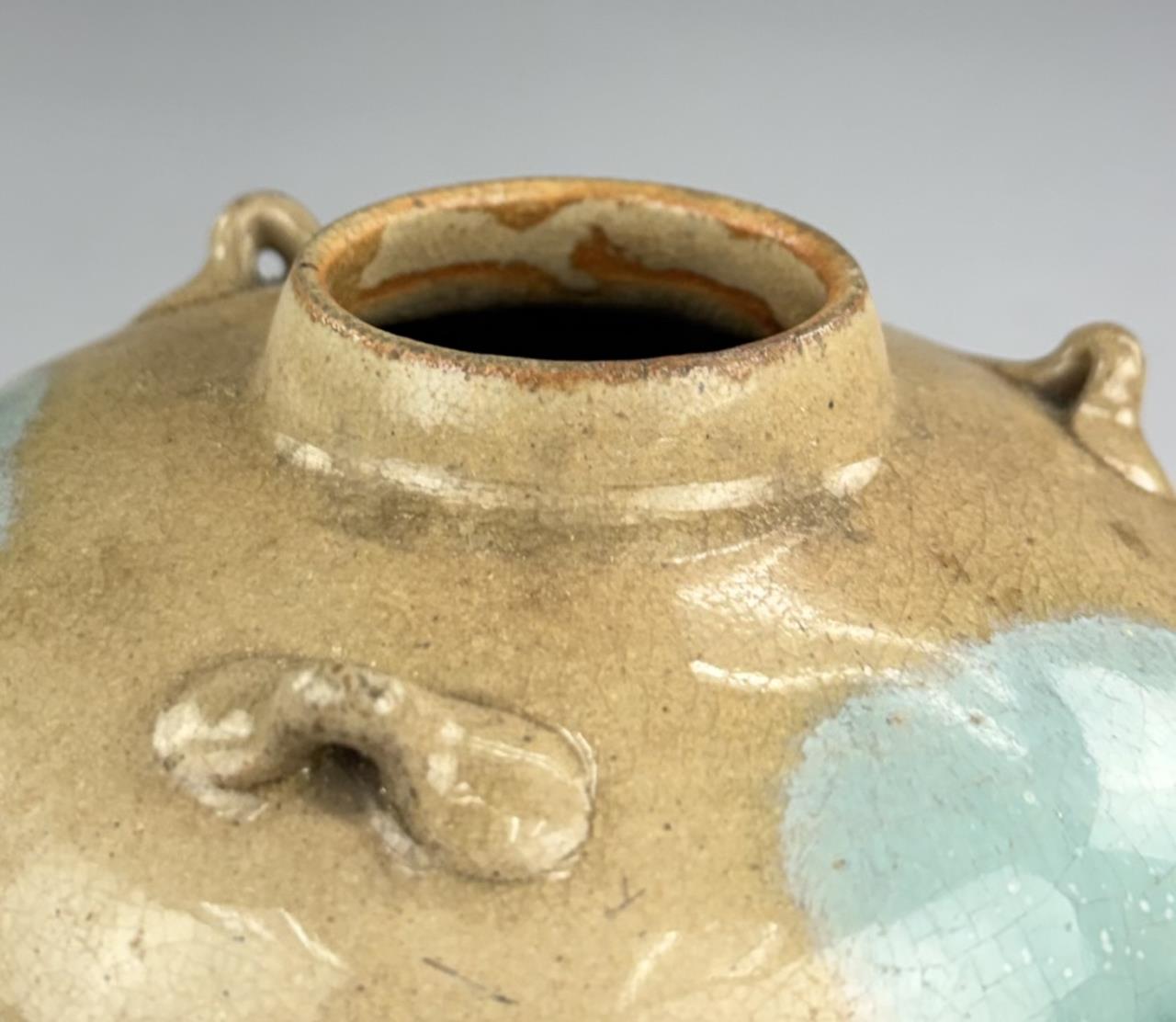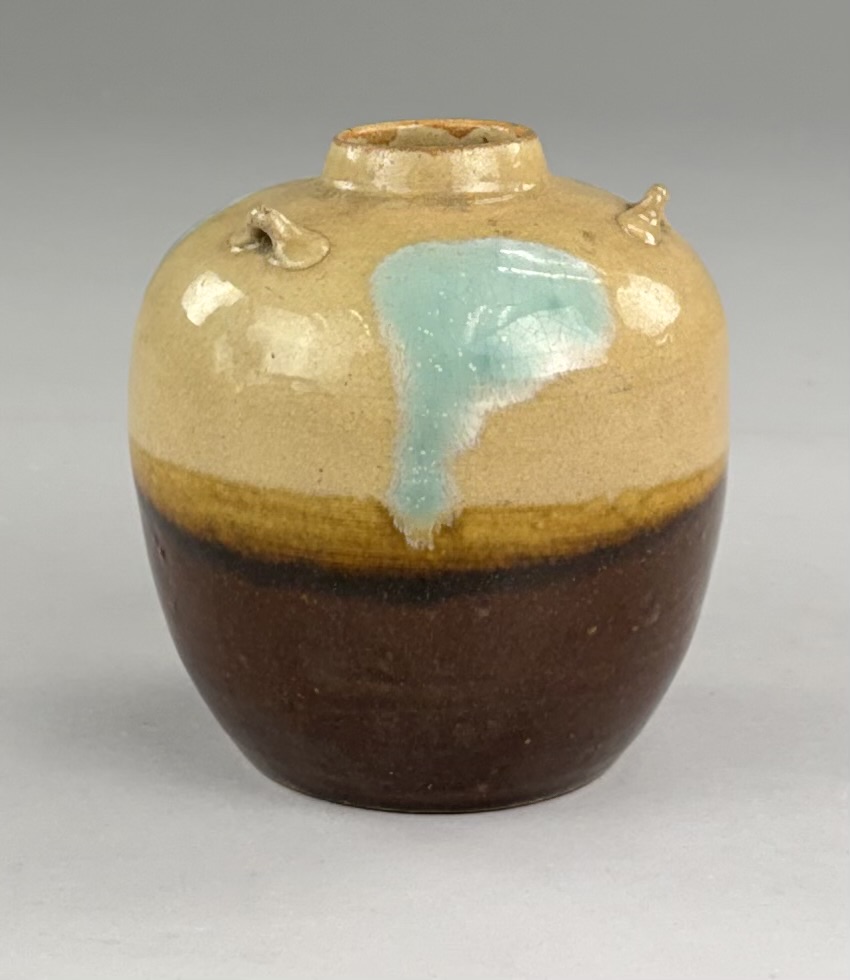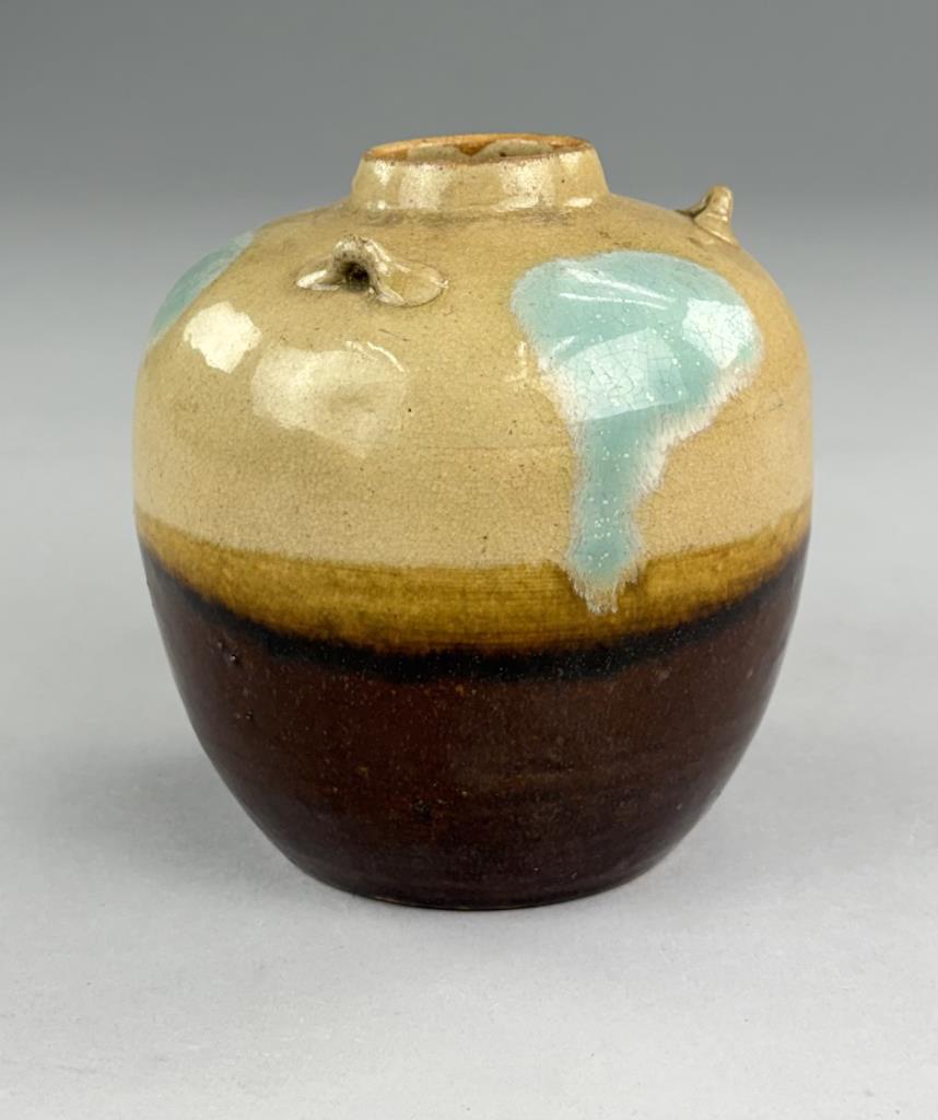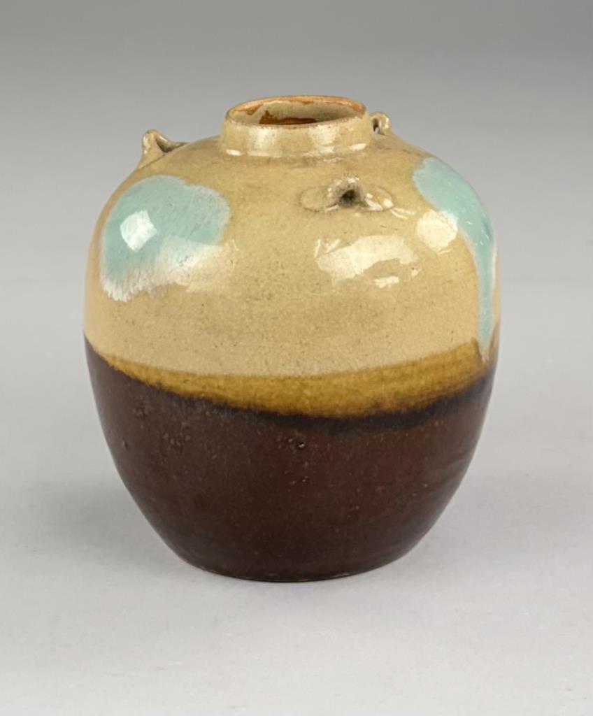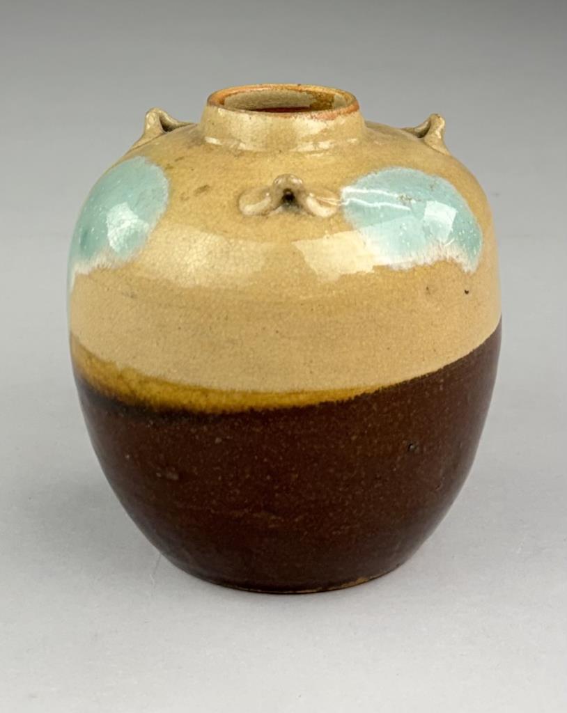 Japanese Shigaraki bulbous pottery vase or jar, with three small lugs or “ears” and multicolor glaze, 5-1/4″ (H).