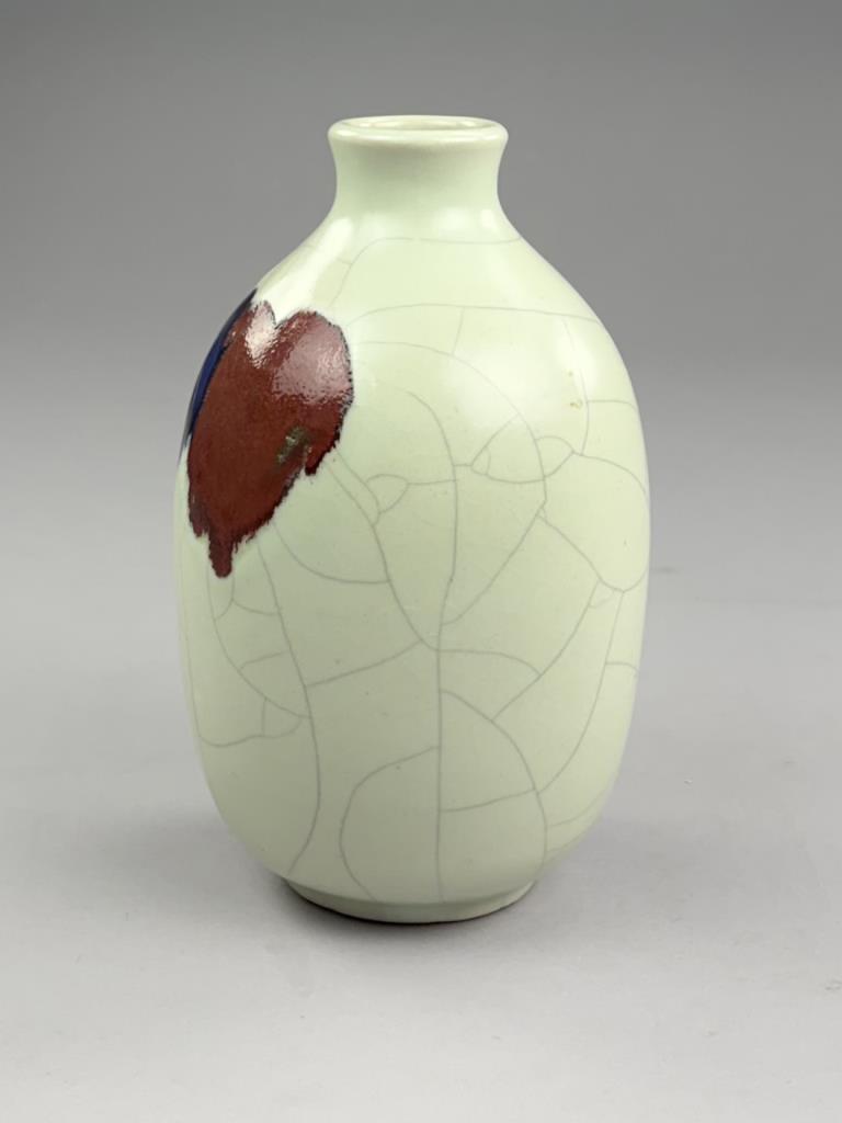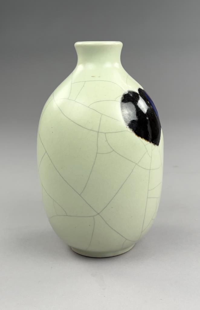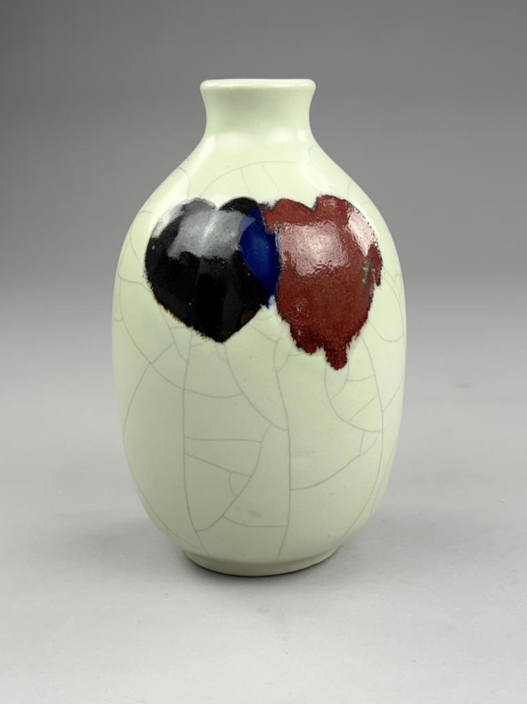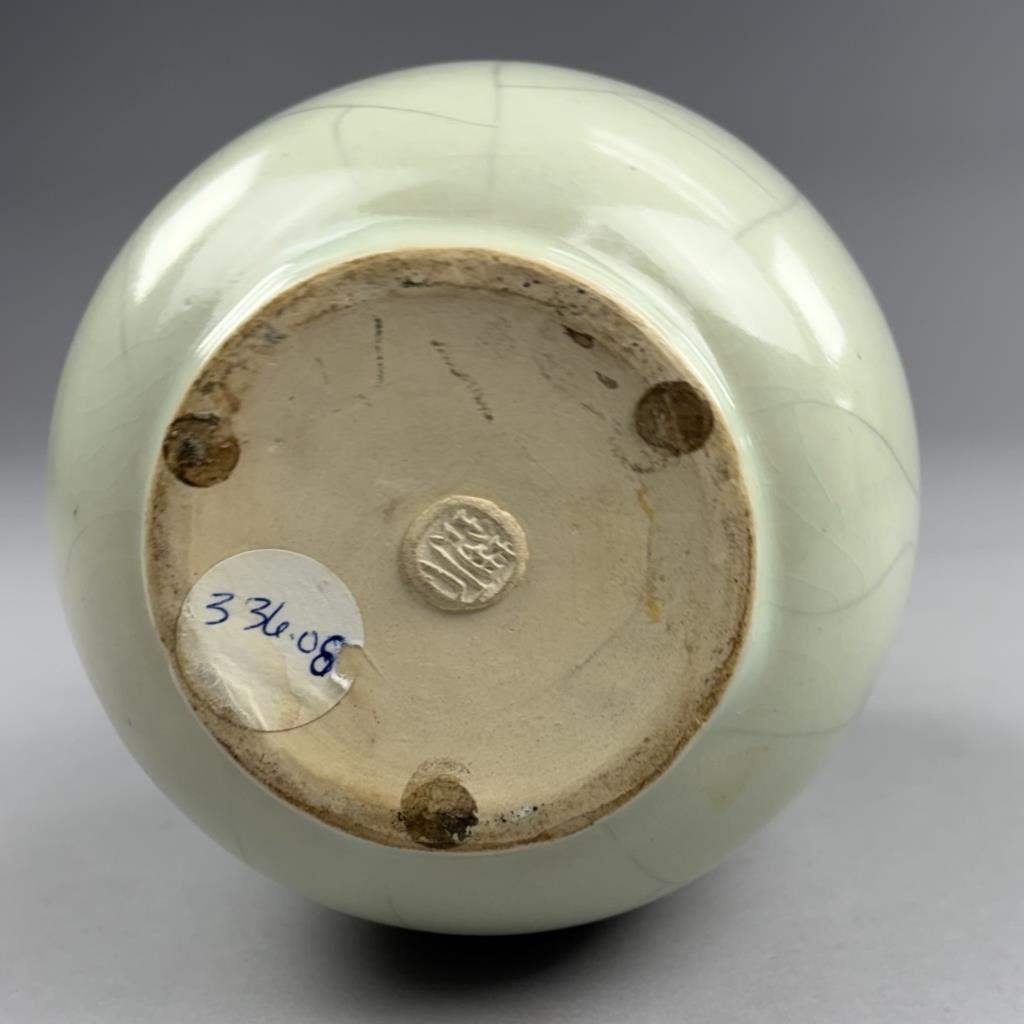 Chinese baluster form bottle vase, crackle glazed pottery decorated with two stylized interlocking hearts, impressed button mark on underside, contemporary, approximately 9-7/8″ (H).