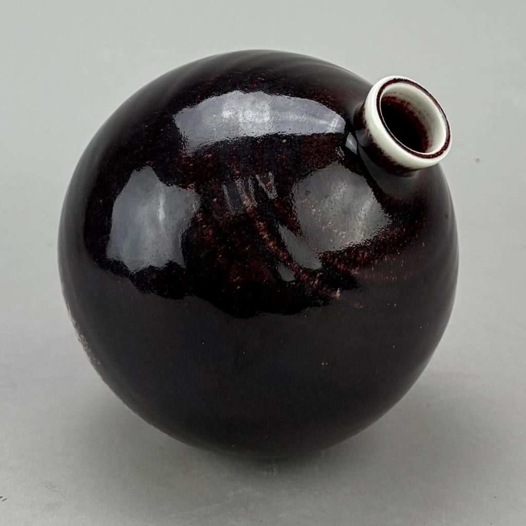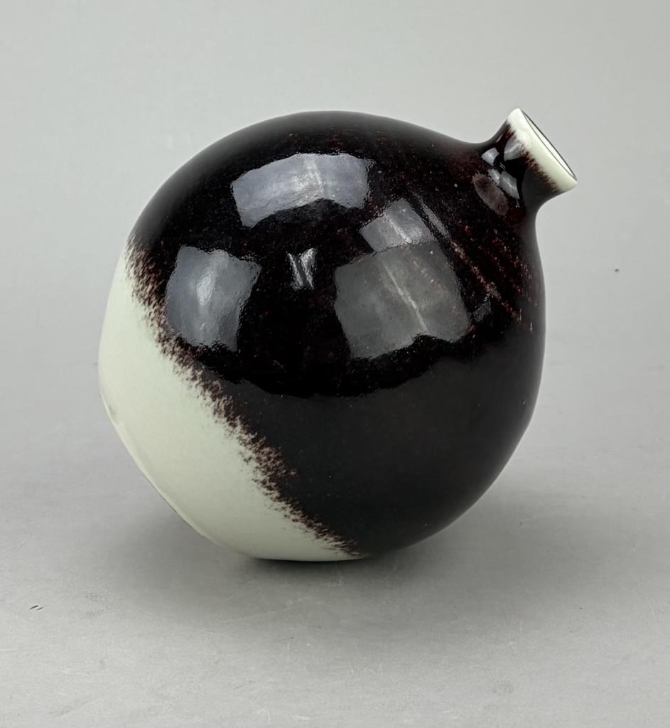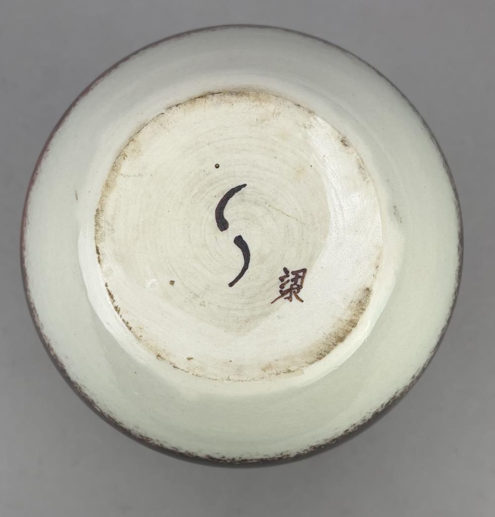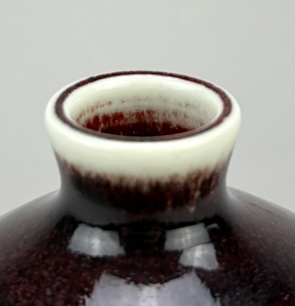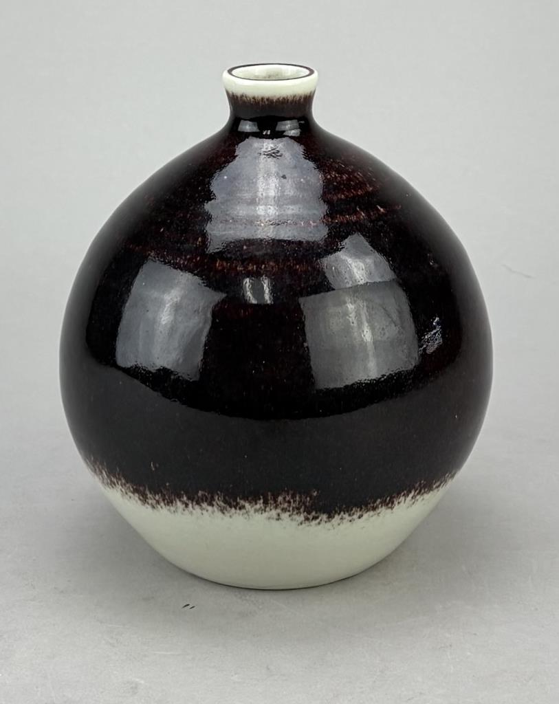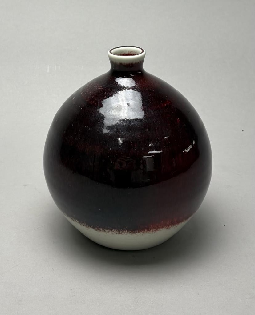 Japanese whiteware bulbous form bottle vase, porcelain with white and deep ox blood red glaze, signed on bottom, contemporary, 6-3/8″ (H).