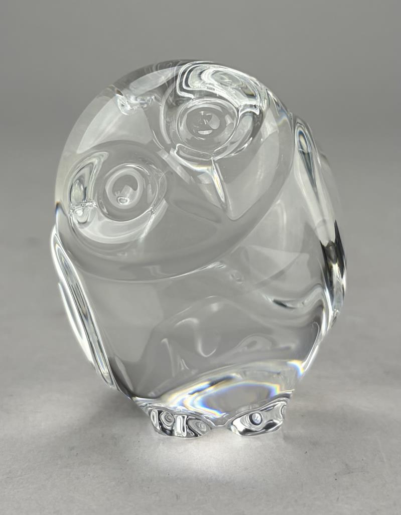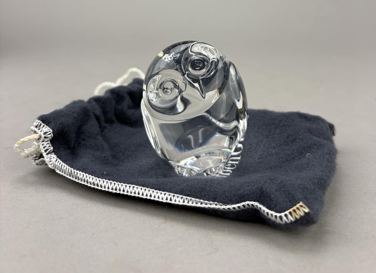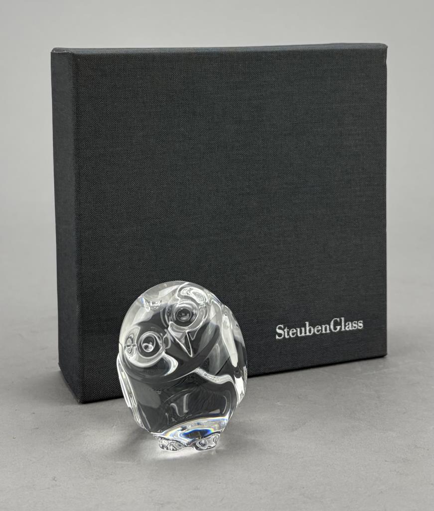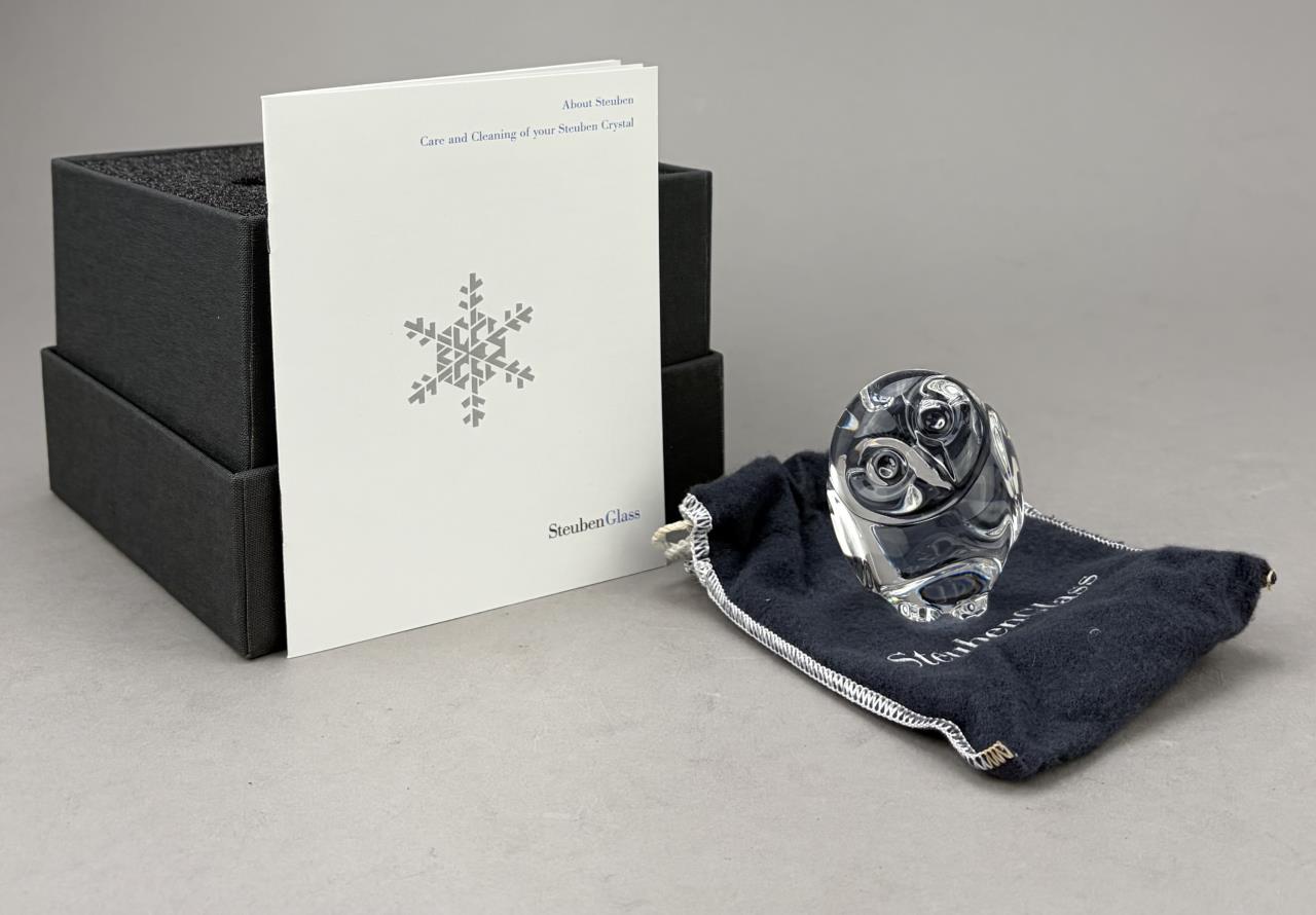 Lloyd Atkins (American, 1922-2002) for Steuben (American), crystal handcooler, in the form of an owl, introduced in 1980, etched signature on underside, 2-1/2″ (H), includes original box, felt pouch, and paperwork.