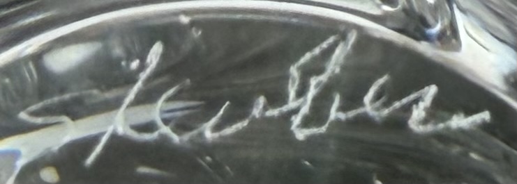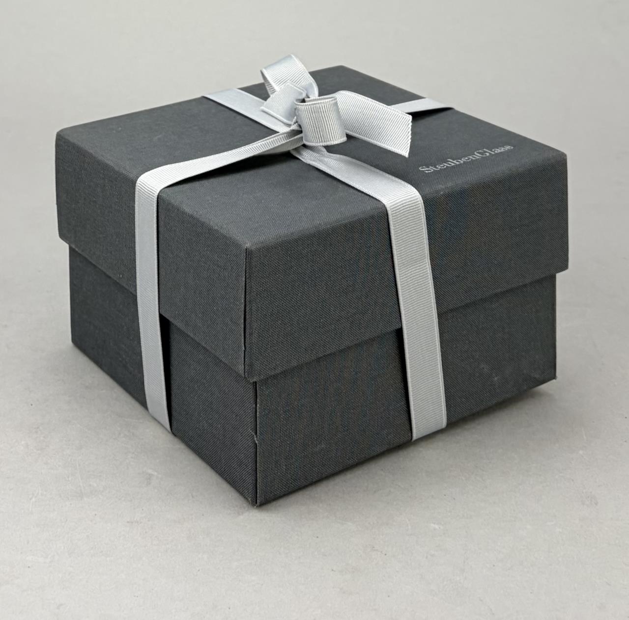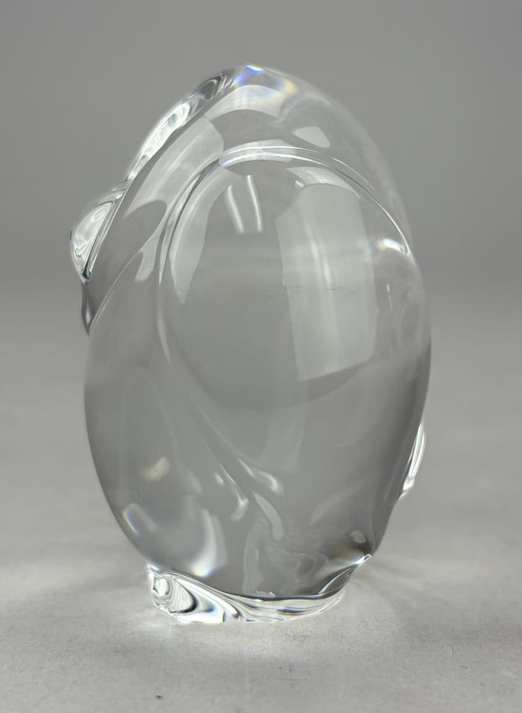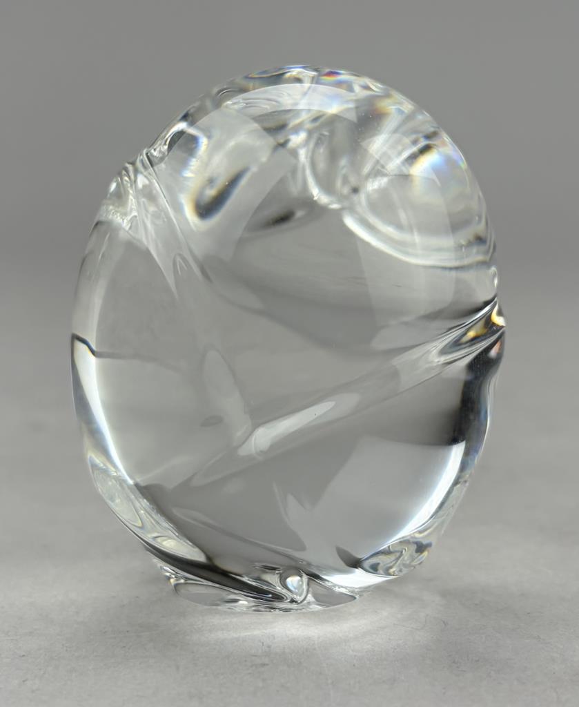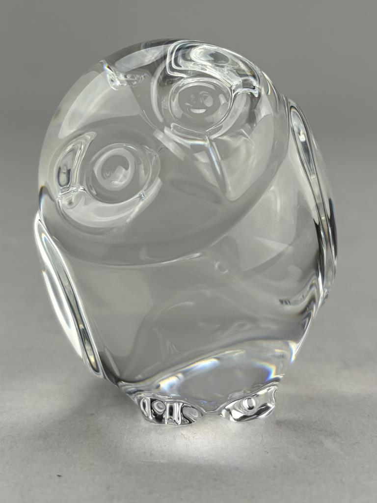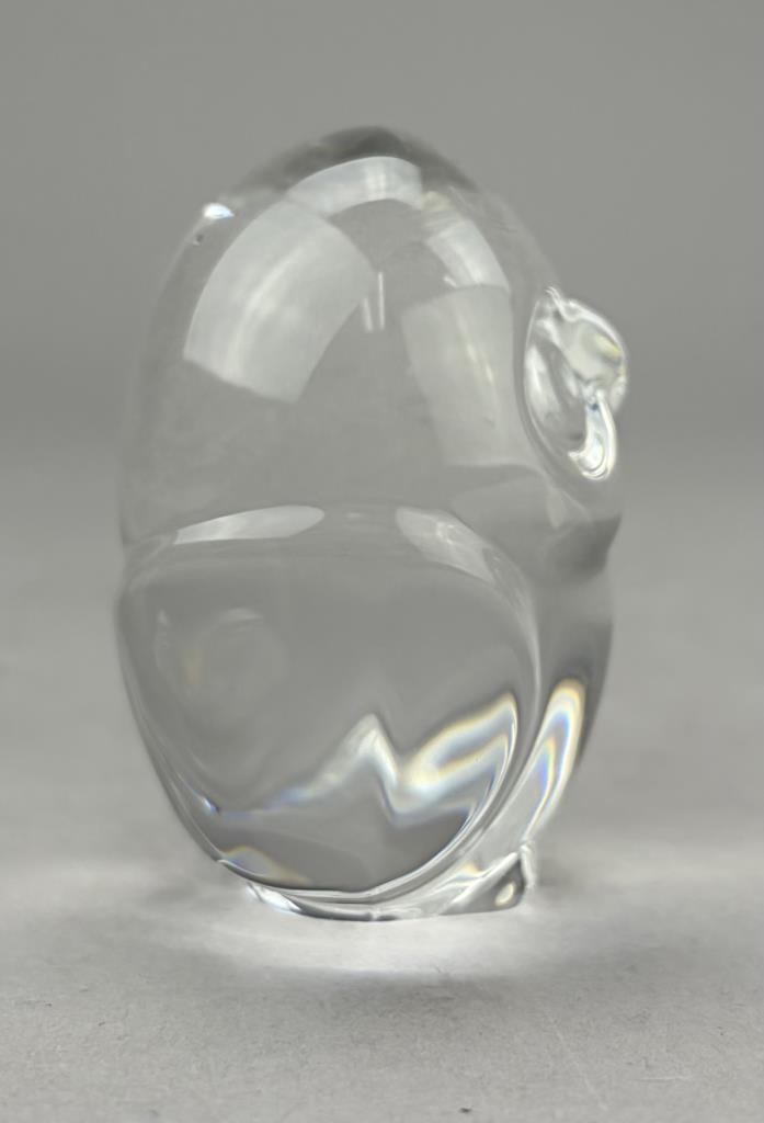 Lloyd Atkins (American, 1922-2002) for Steuben (American), crystal handcooler, in the form of an owl, introduced in 1980, etched signature on underside, 2-1/2″ (H), includes original box, felt pouch, and paperwork.