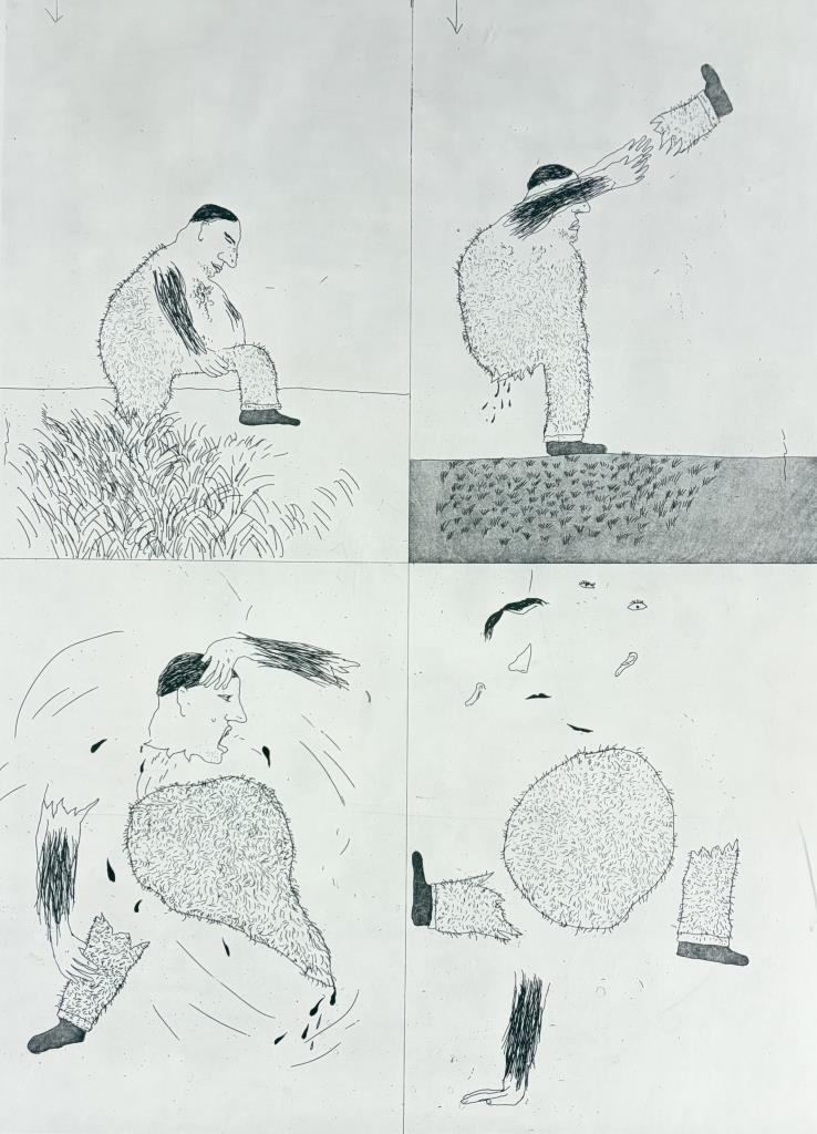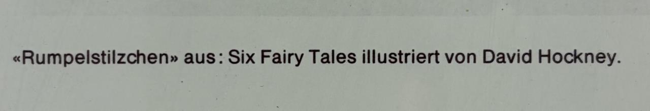 David Hockney (English, b. 1937), 1971 Swiss exhibition poster featuring an image of his etching “He Tore Himself in Two”, from his 1969 series “Six Fairy Tales from the Brothers Grimm”, lithograph on paper, 35-12/16″ x 25″.