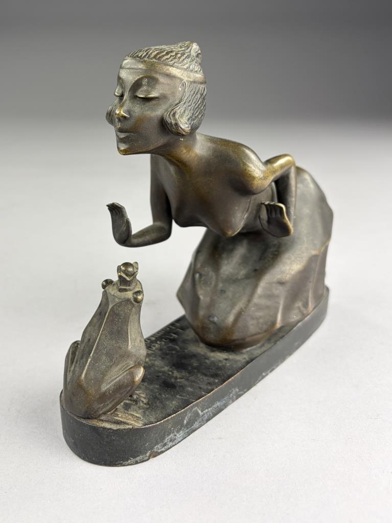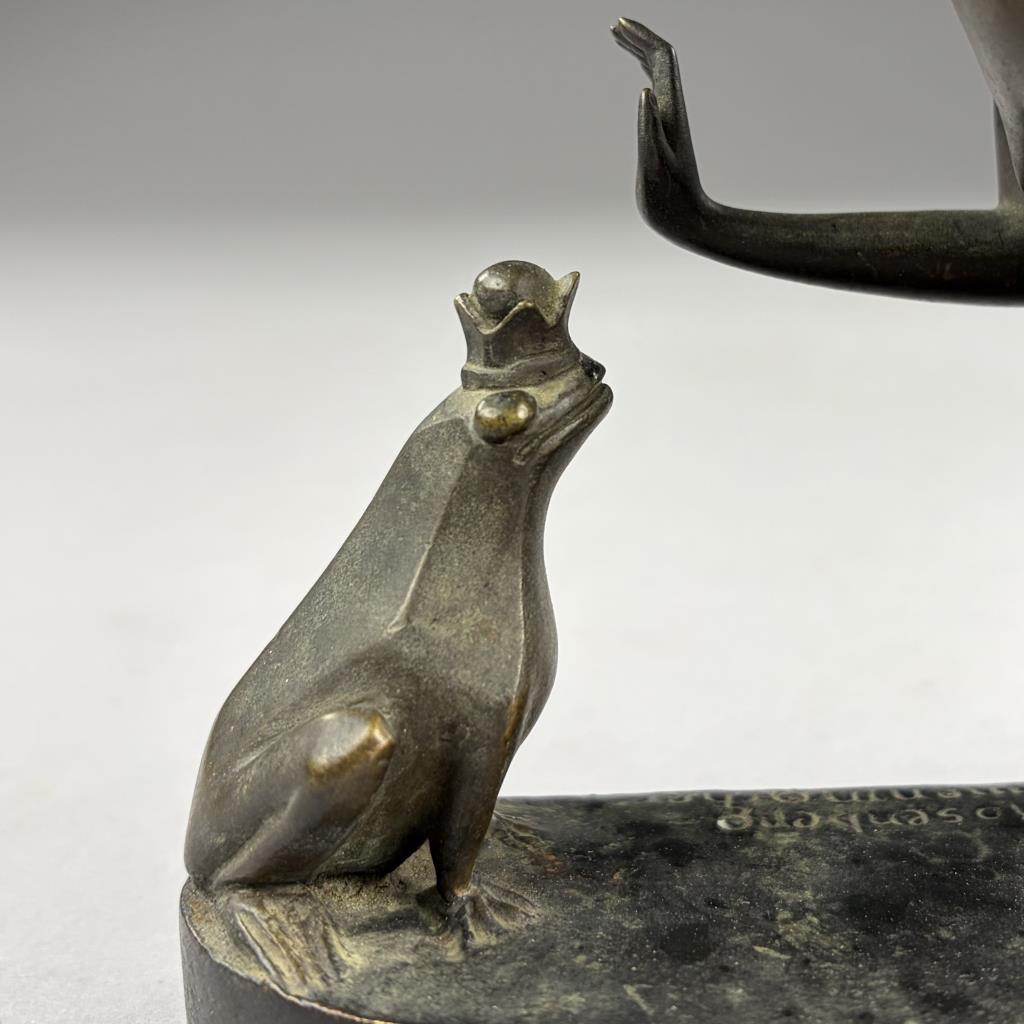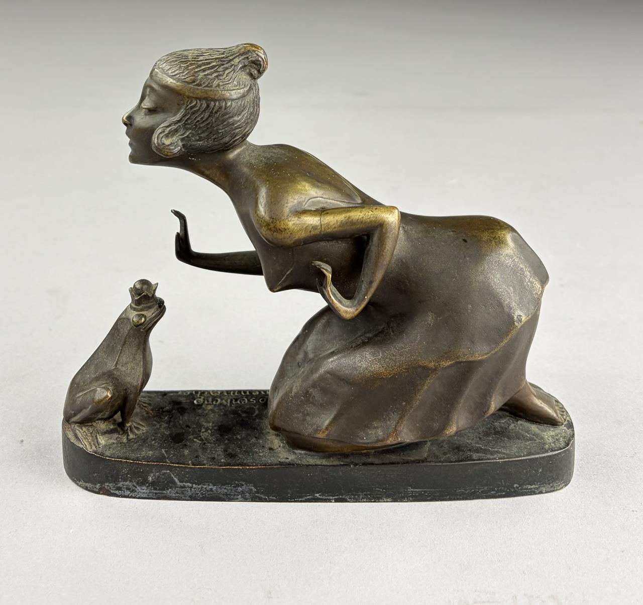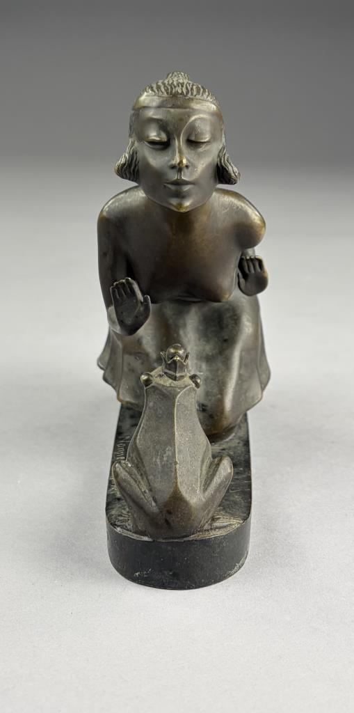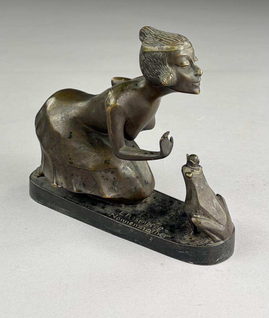 Erna Rosenberg Nonnenmacher (German/English, 1889-1980), Art Deco bronze, titled “Girl with Frog”, depicting a young woman or princess about to kiss the The Frog King, greenish patinated bronze on oblong plinth, signed on base, 3″ x 7-1/2″ x 5-5/8″.
