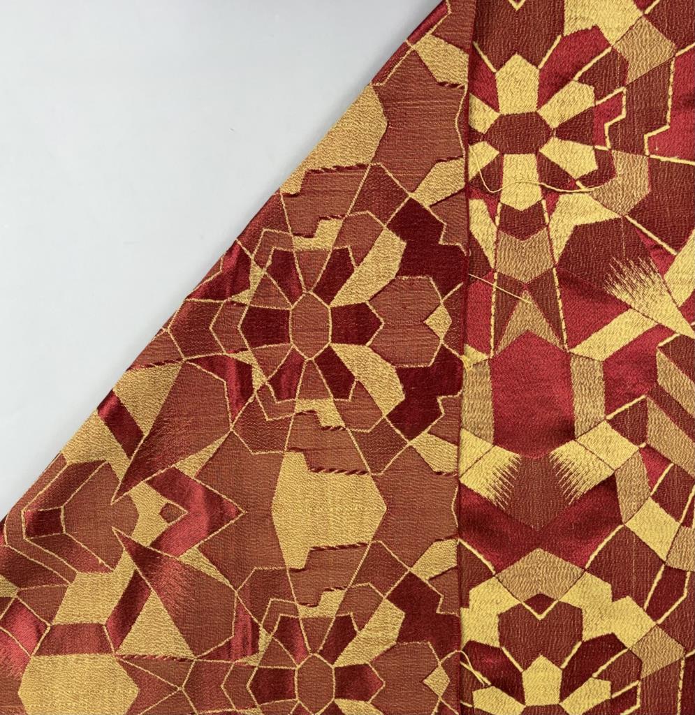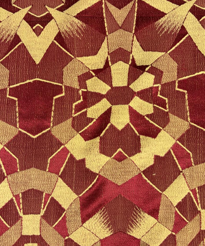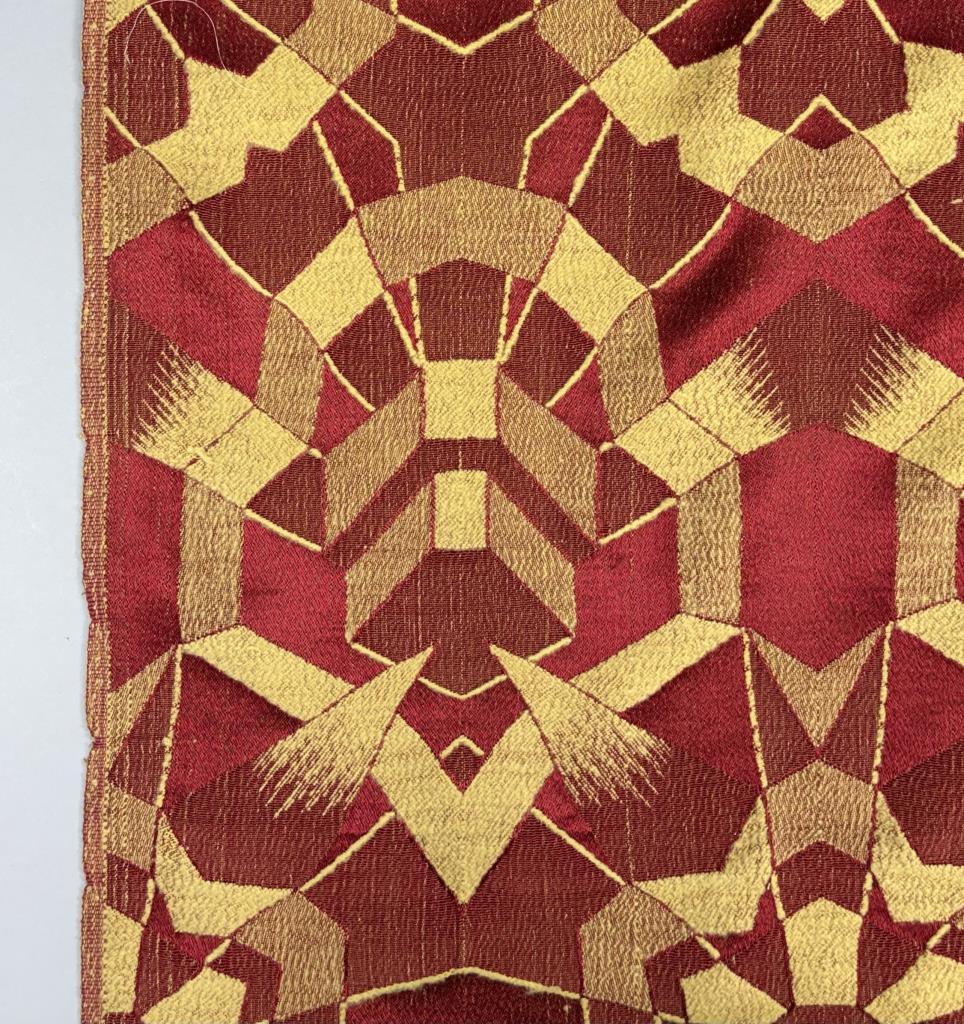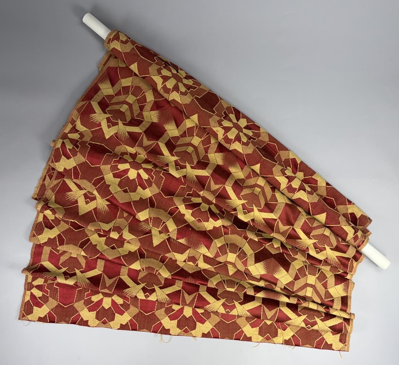 Two pieces of woven Art Deco Period fabric, featuring a bold geometric design, circa 1920s / 1930s, almost 5 yards combined, with one piece measuring 96″ x 54″ and the other 80″ x 54″.