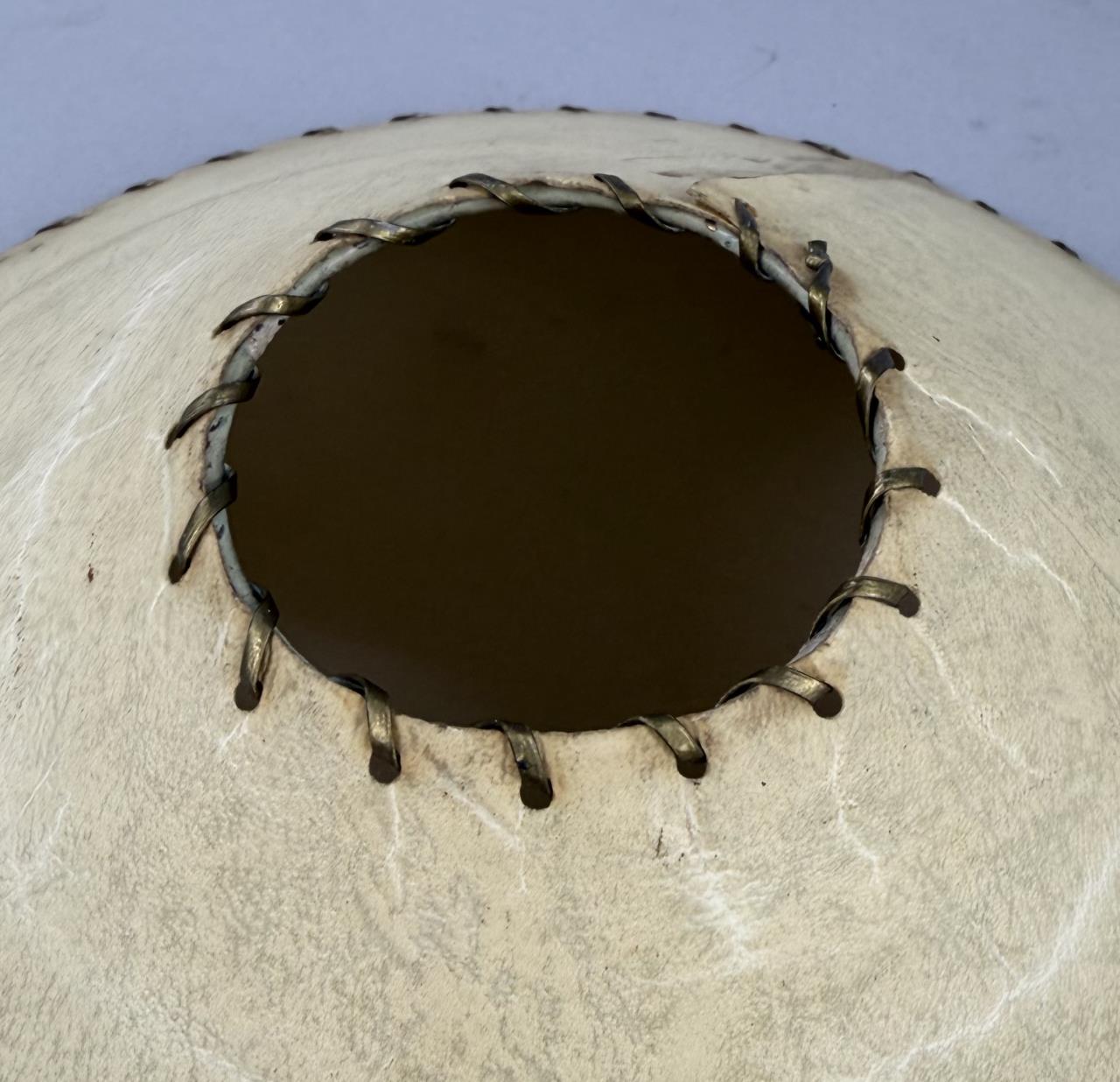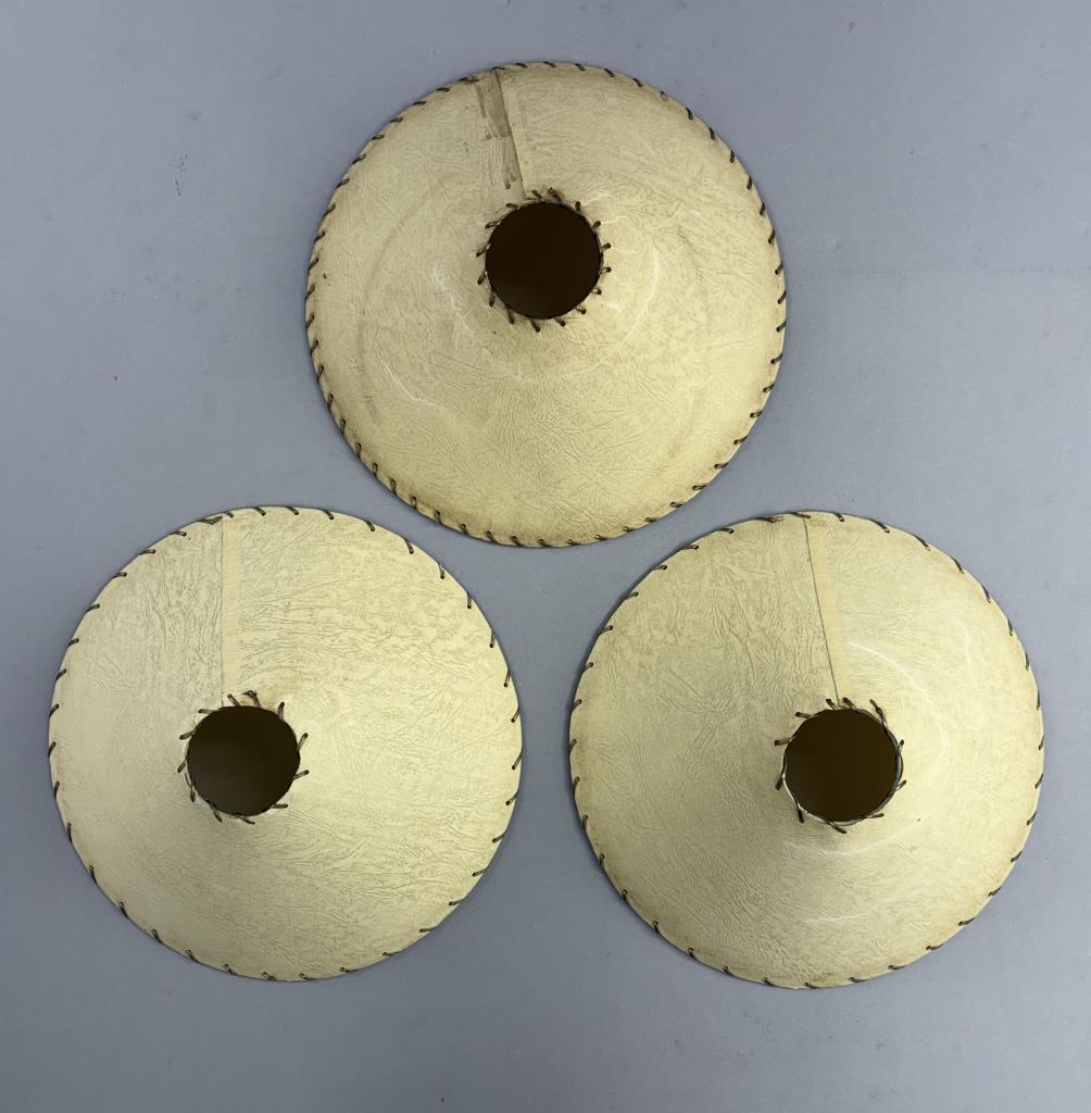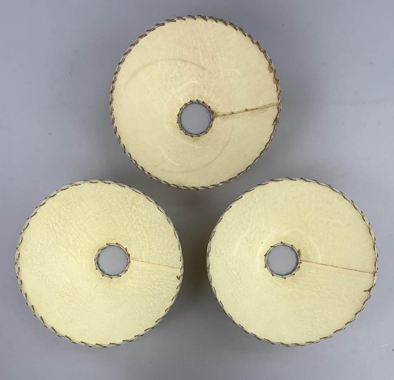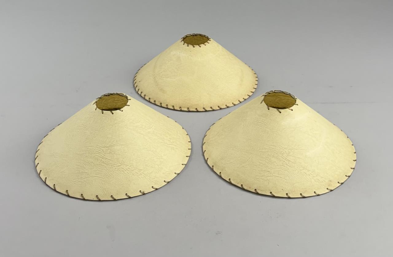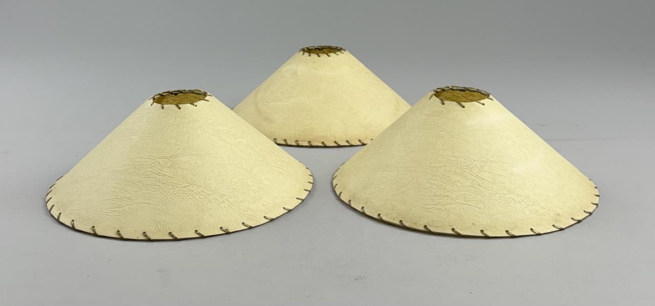 Set of 3 Mid Century Modern open stitched parchment lamp shades, mid 20th Century, 11-1/4″ x 3-3/4″.