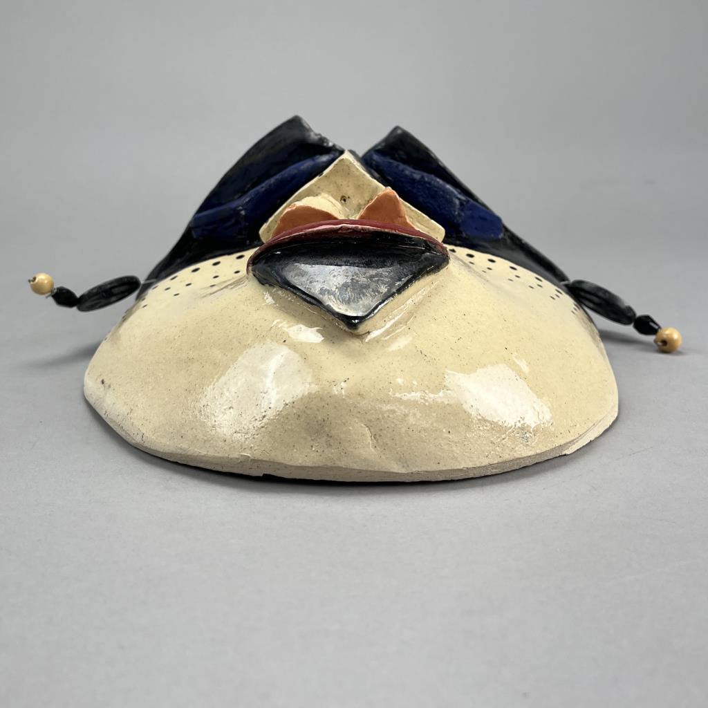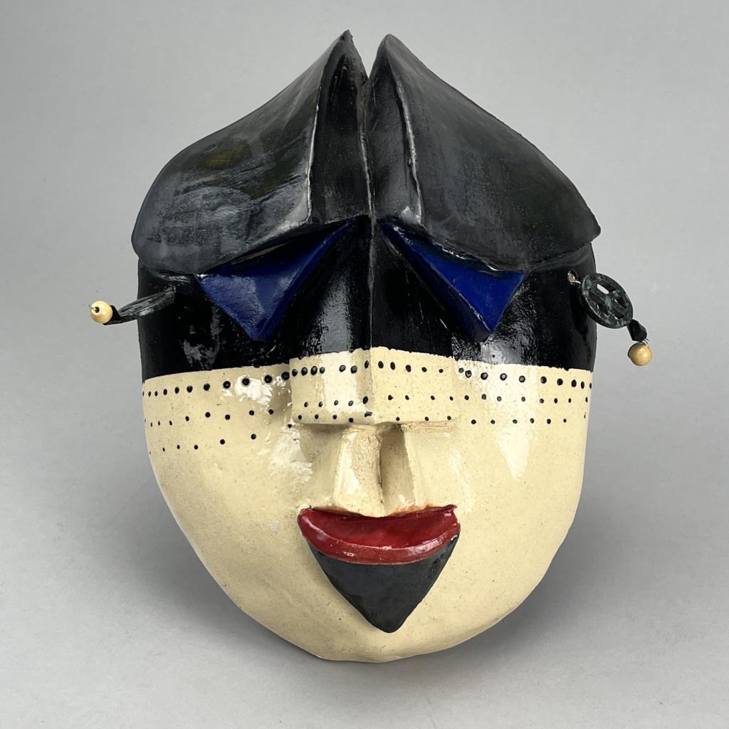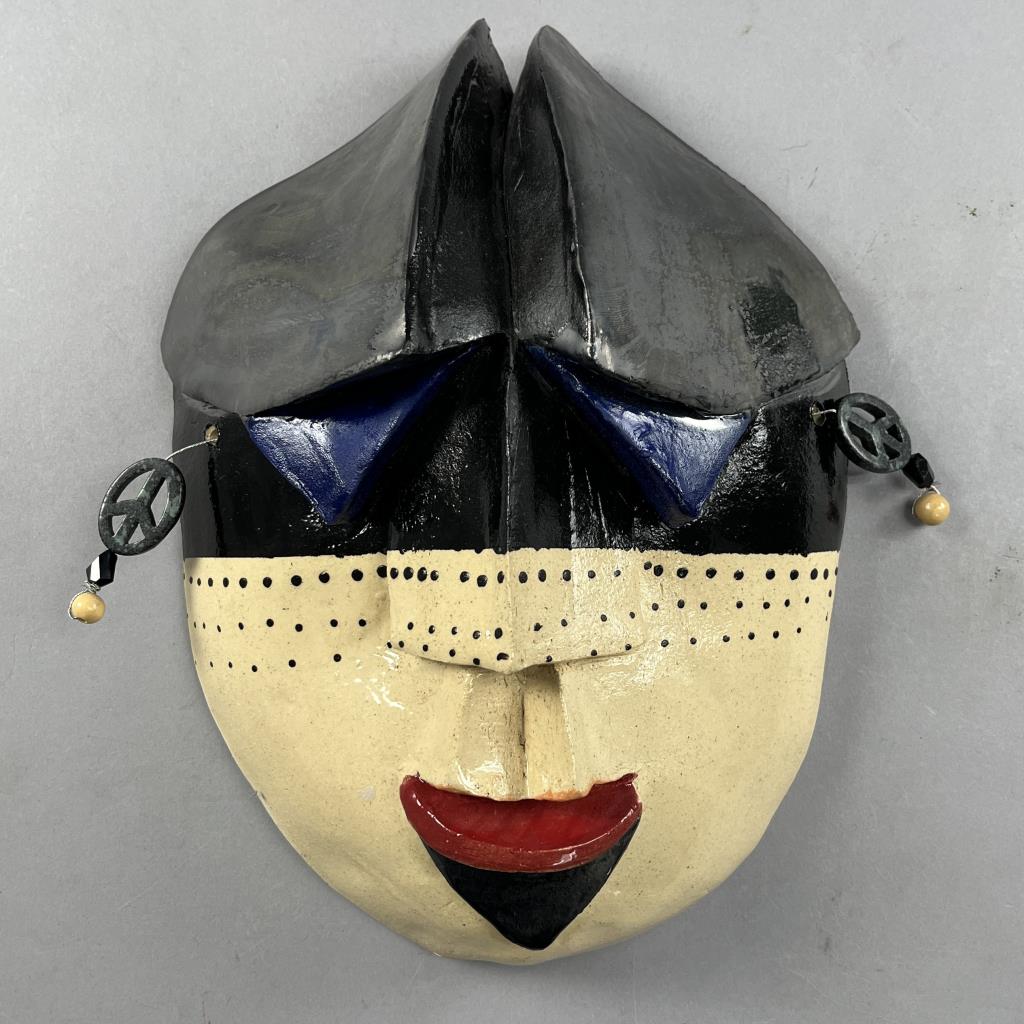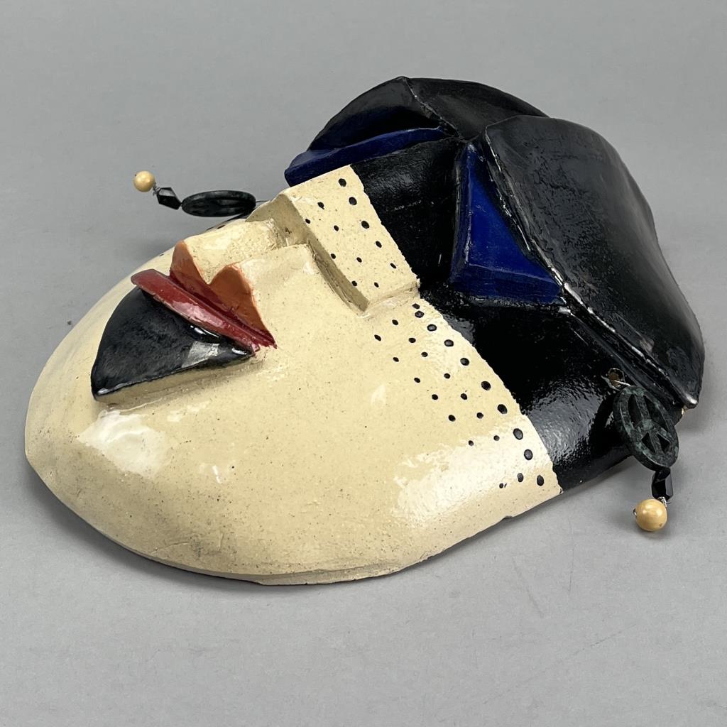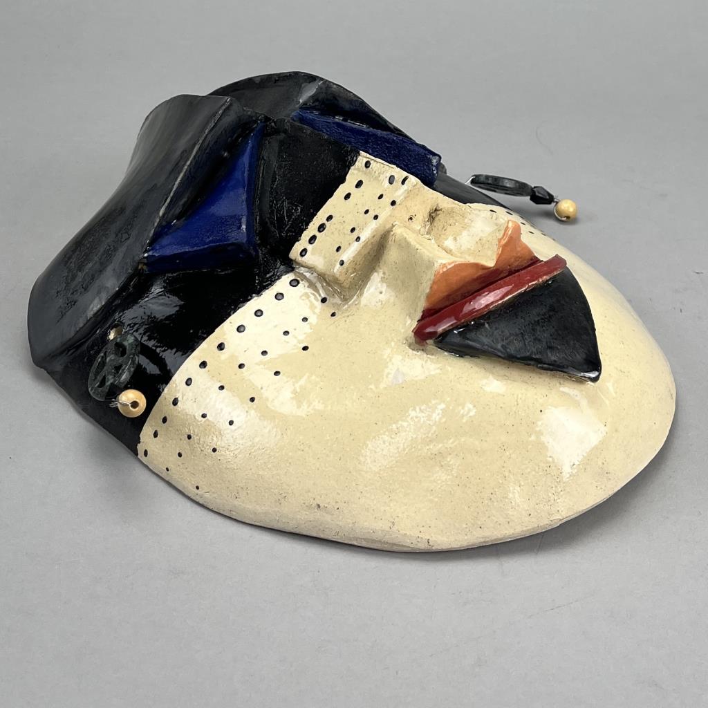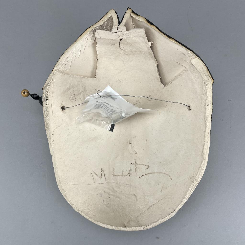 Post modernist mask, artist signed on back “M. Lutz”, glazed ceramic, approximately 12-3/4″ x 9-1/2″.