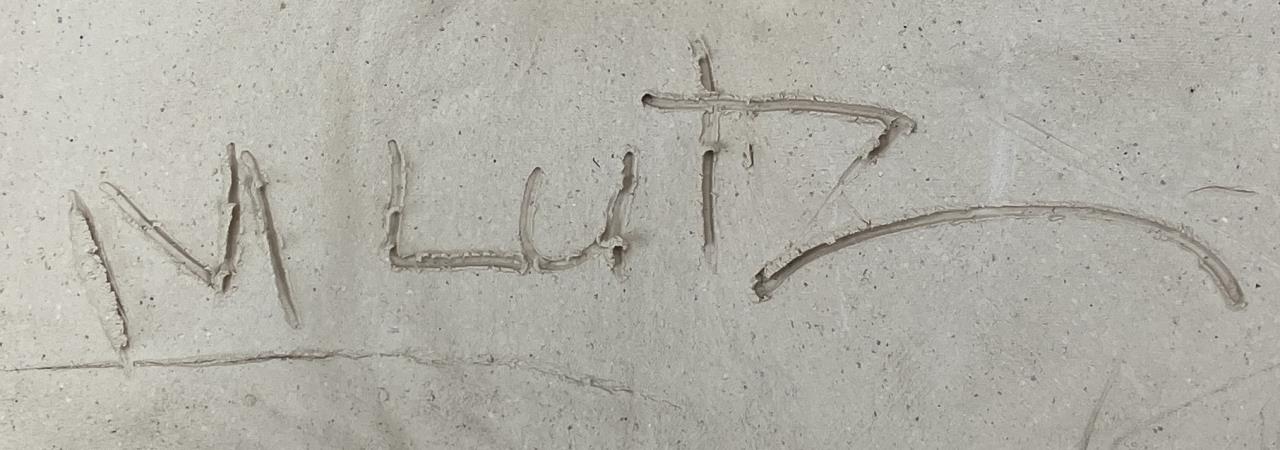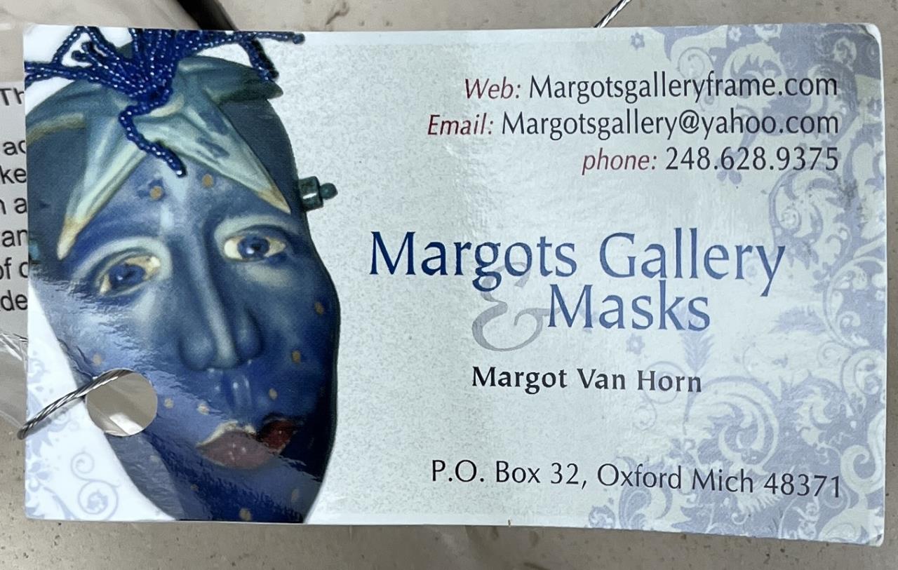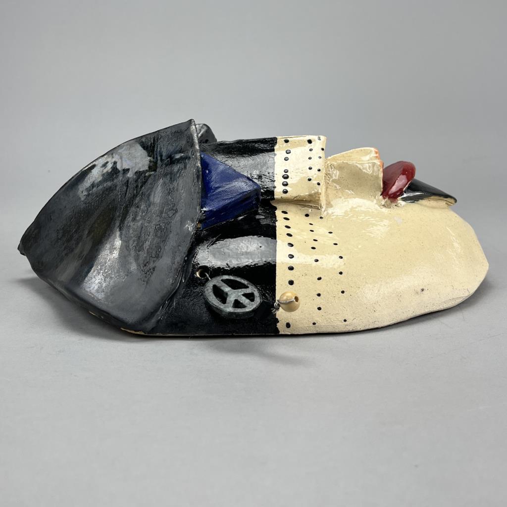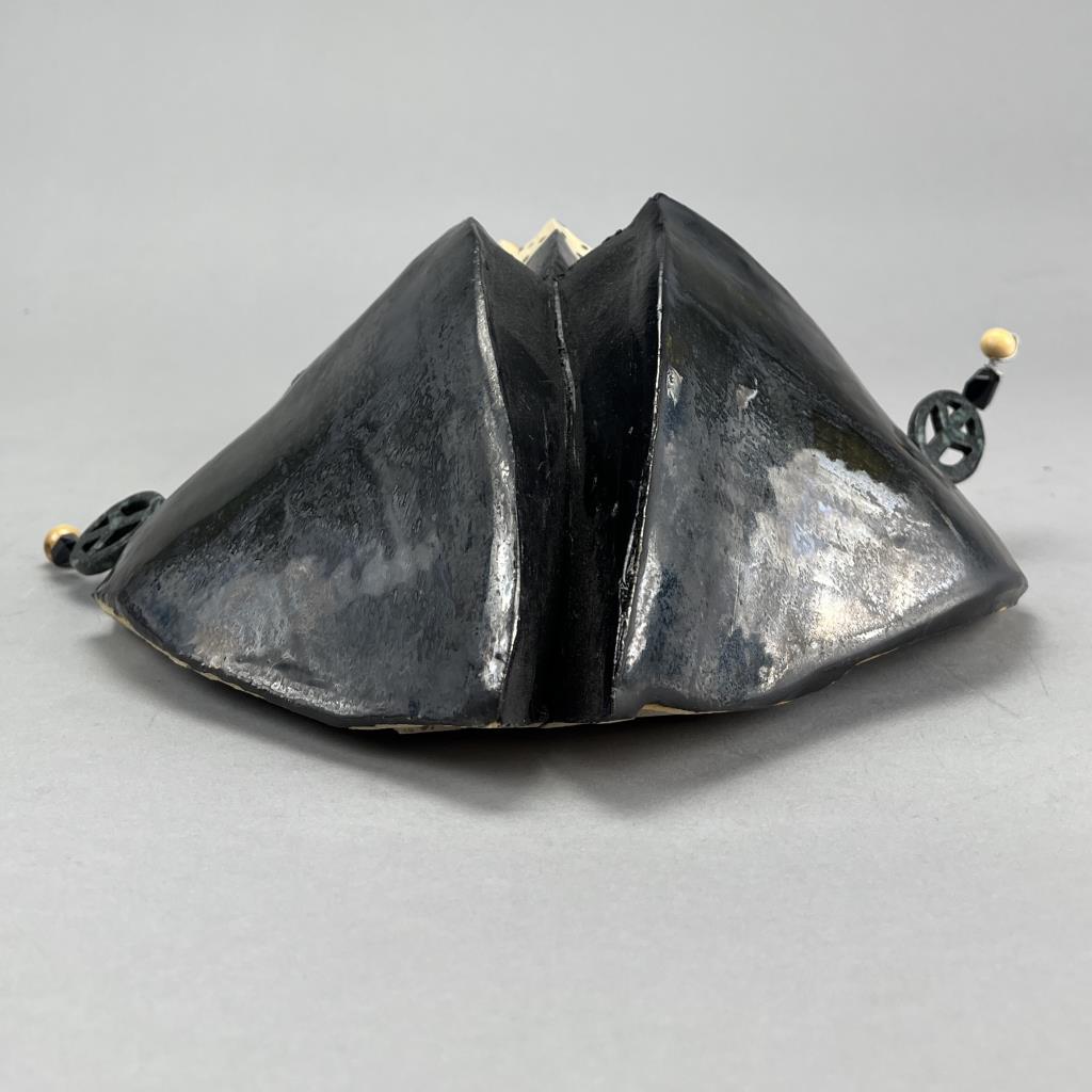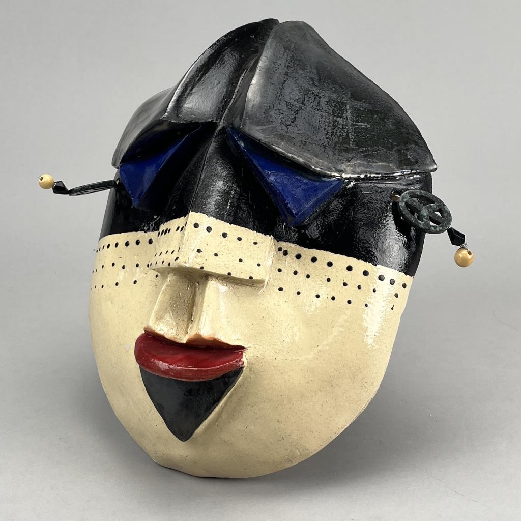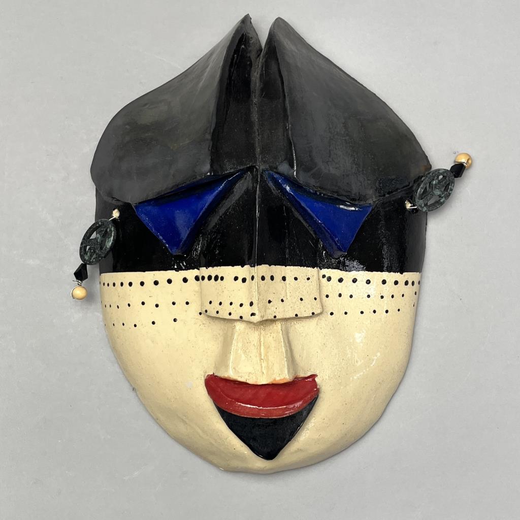 Post modernist mask, artist signed on back “M. Lutz”, glazed ceramic, approximately 12-3/4″ x 9-1/2″.