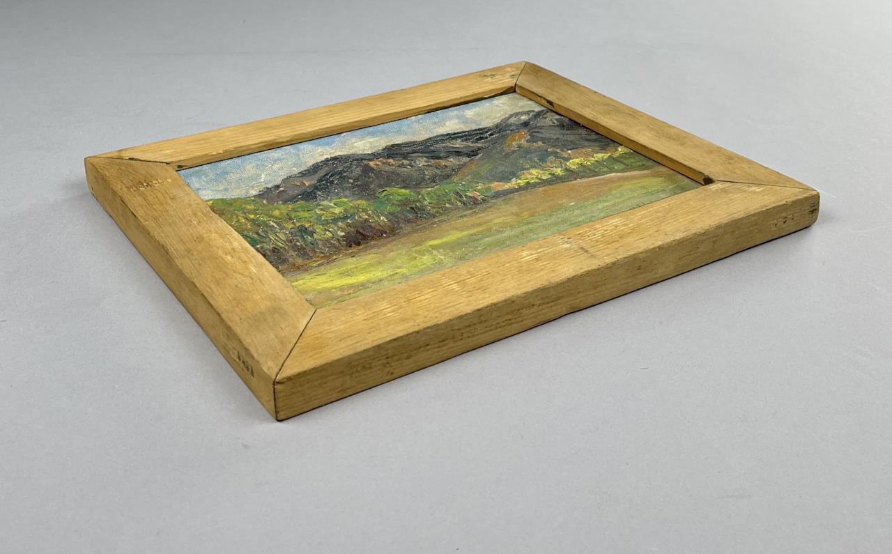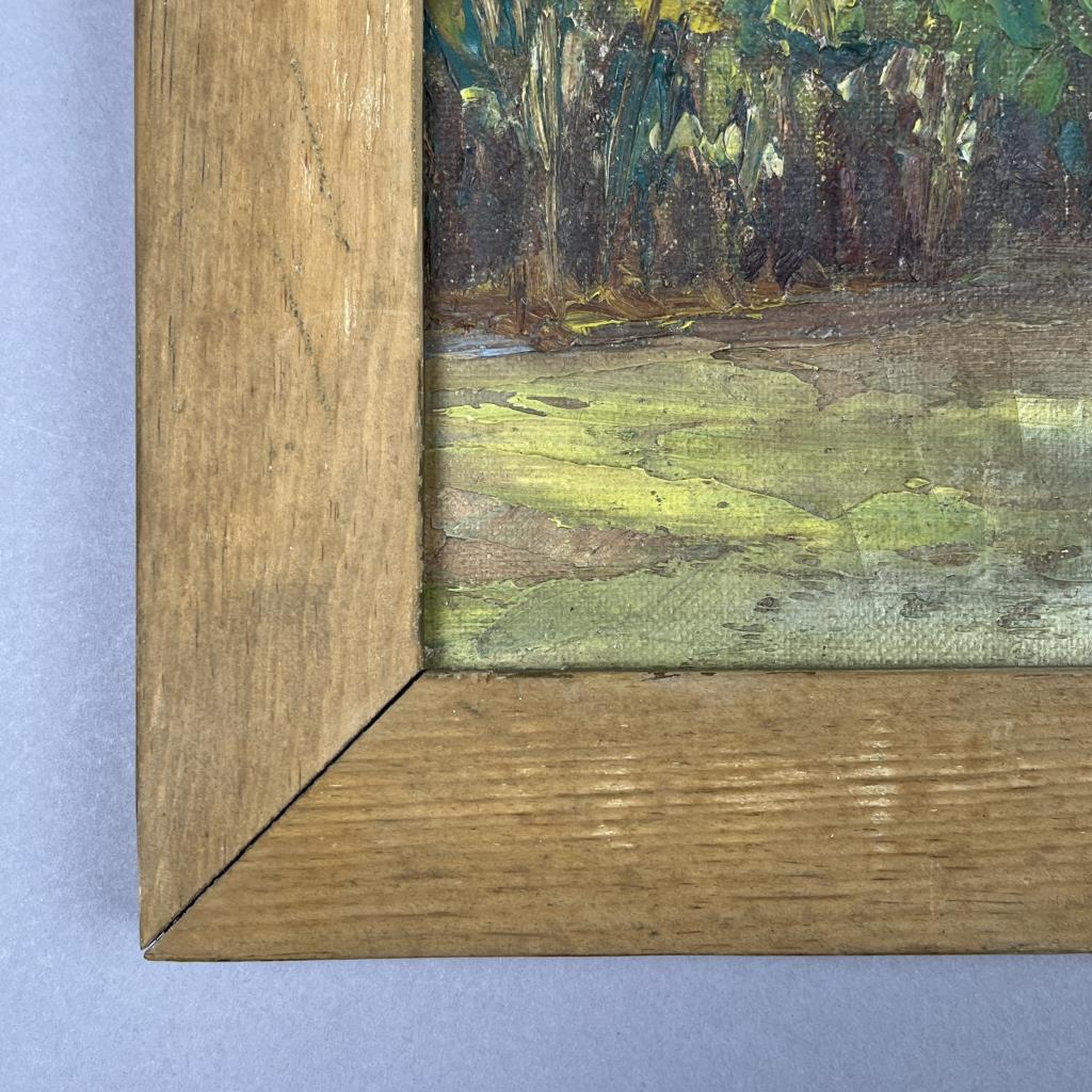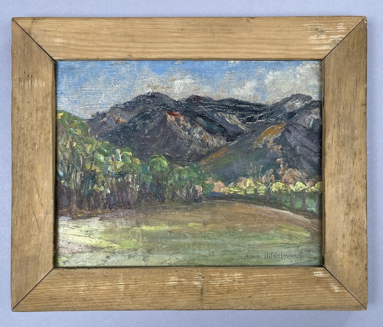 Gustave Hildebrand (American, 1897-1950), landscape oil painting on board, in a natural pine frame measuring 10-3/8″ x 12-1/2″. Hildebrand was a Michigan Works Progress Administration artist, active in the 1930s and 1940s, and primarily associated with Bay View and Petoskey.