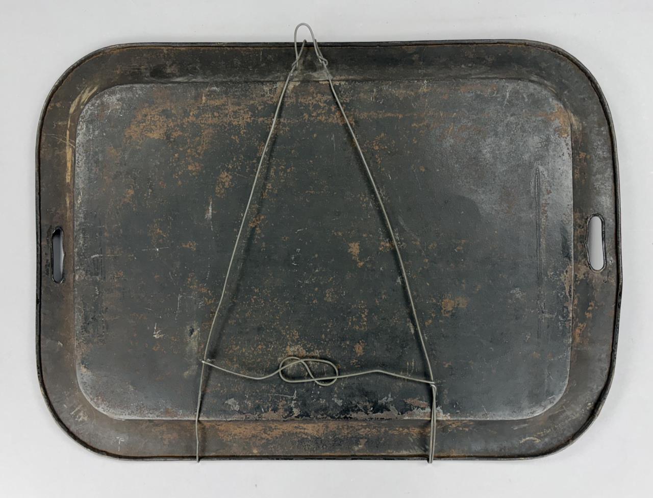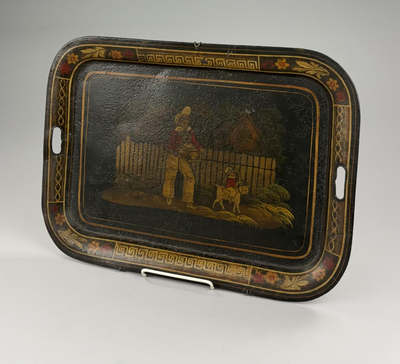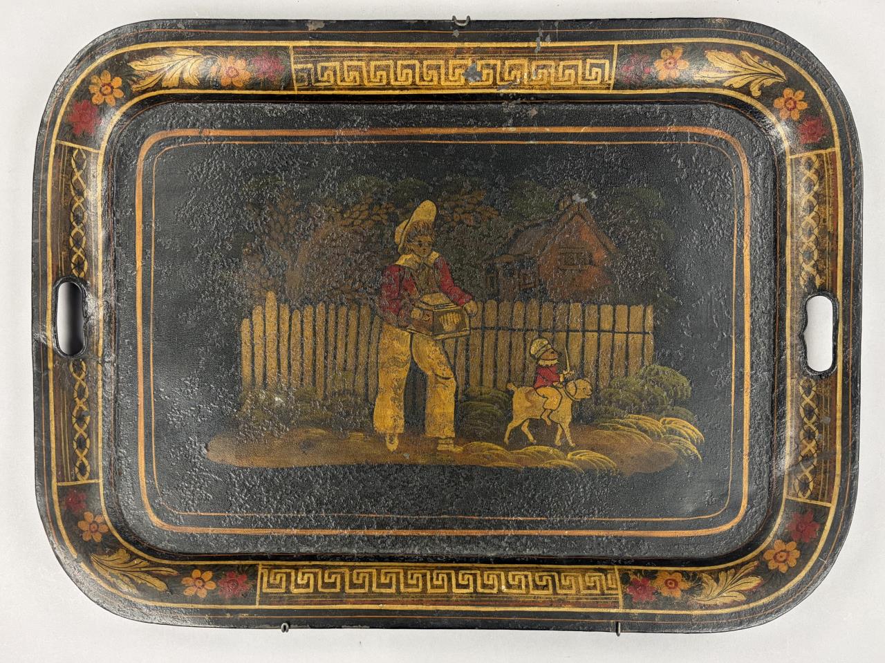 Hand painted toleware tray, depicting a young organ grinder with a monkey riding a dog, framed by a Greek key and floral border, and with handles on each side and a wire hanger an the back, last half of the 19th Century, 17-3/8″ x 24″.