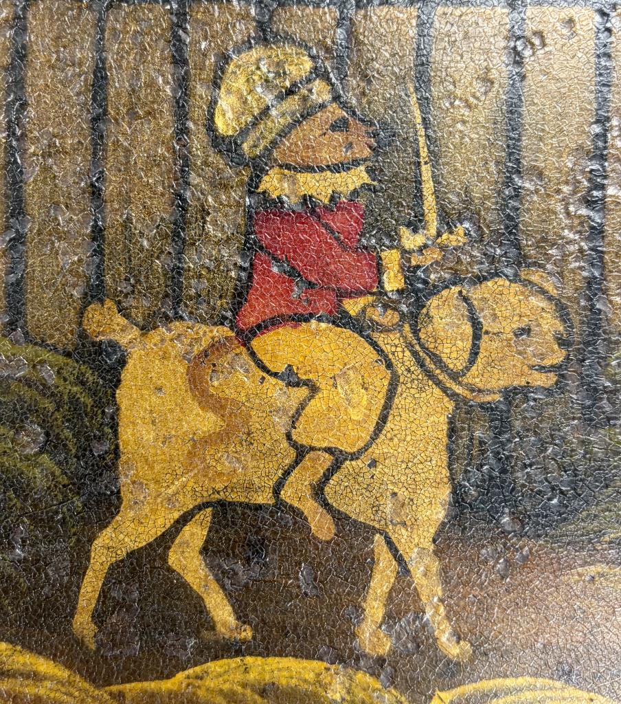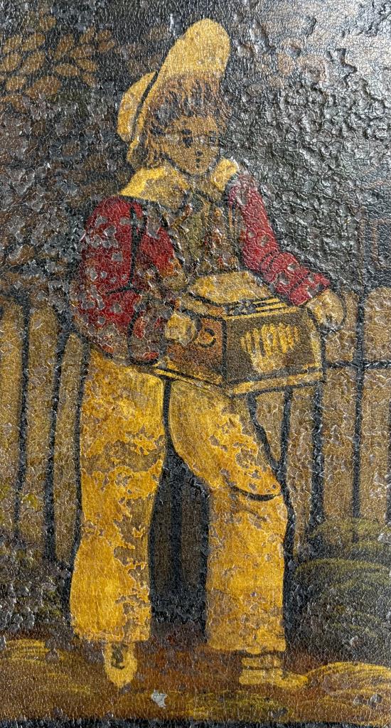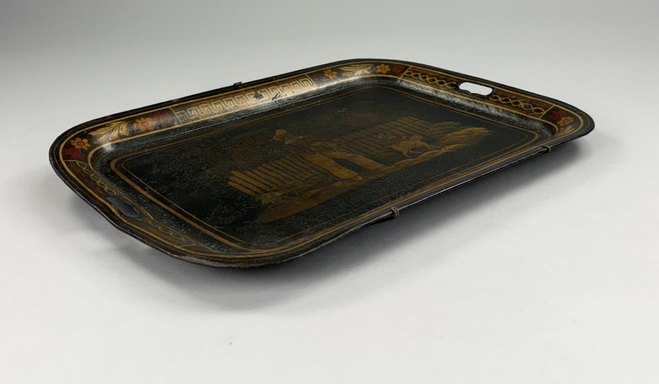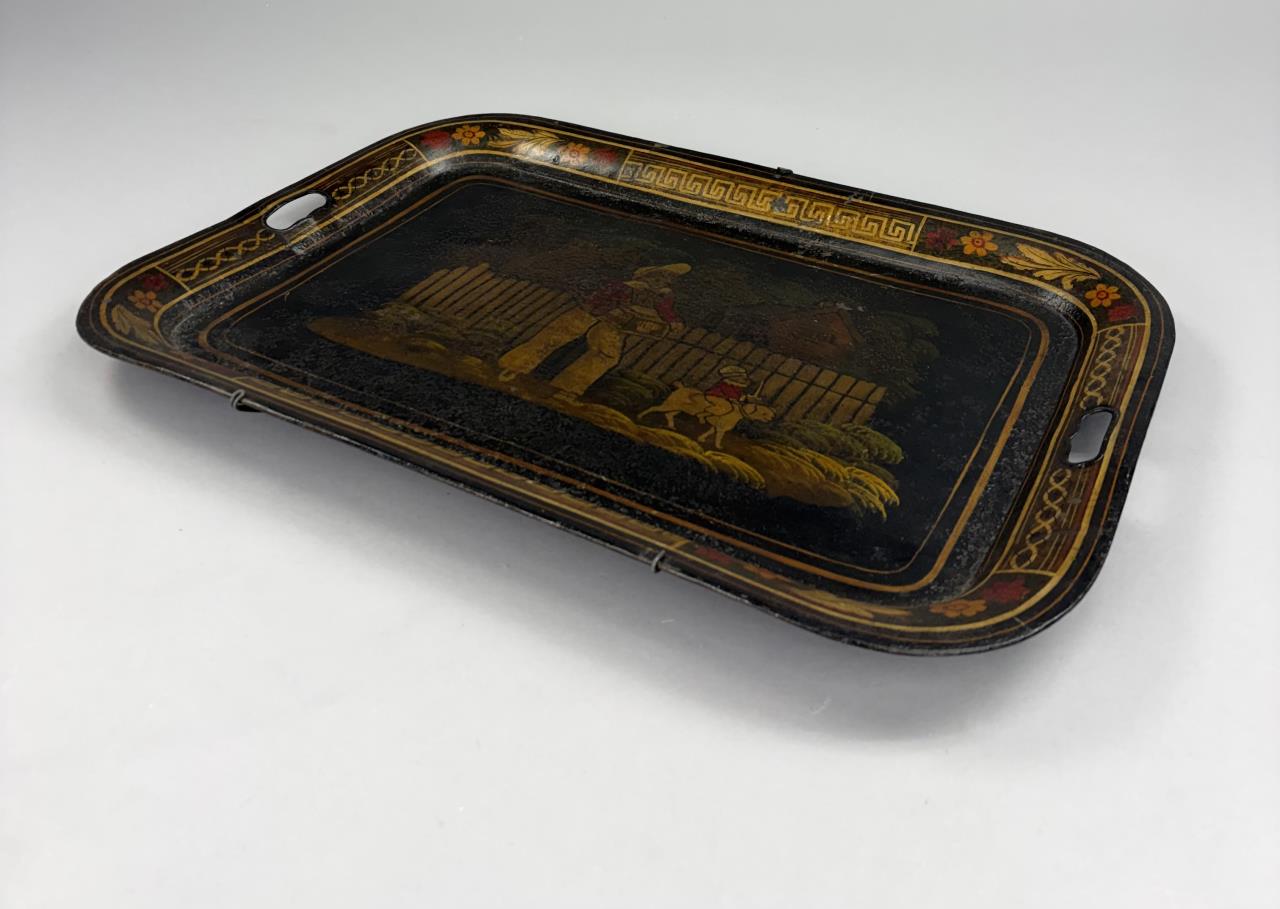 Hand painted toleware tray, depicting a young organ grinder with a monkey riding a dog, framed by a Greek key and floral border, and with handles on each side and a wire hanger an the back, last half of the 19th Century, 17-3/8″ x 24″.