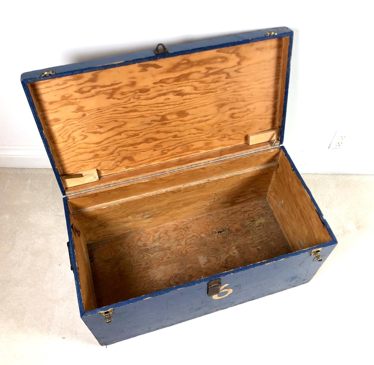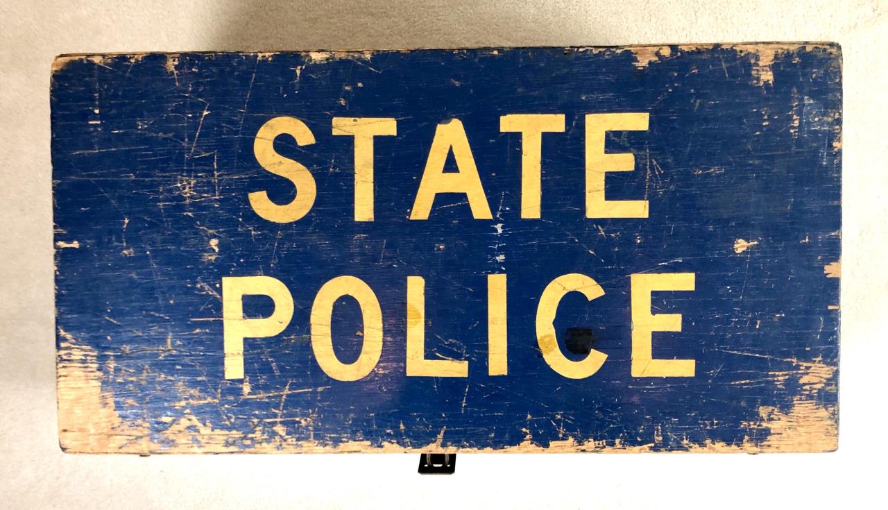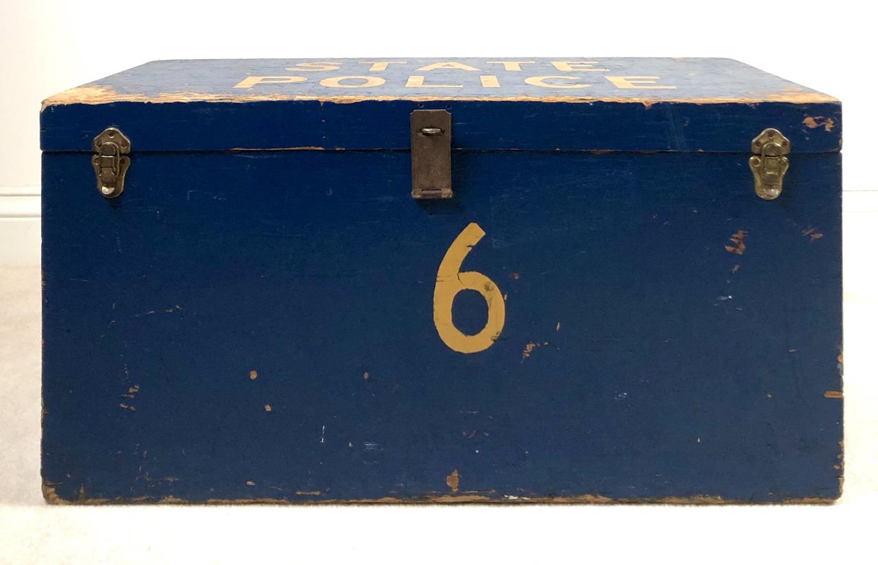 State Police, possibly Michigan State Police (MSP), wood utility chest, with triple latched and hinged lid, hand painted plywood, mid 20th Century,, 16″ x 32″ x 15-5/8″.