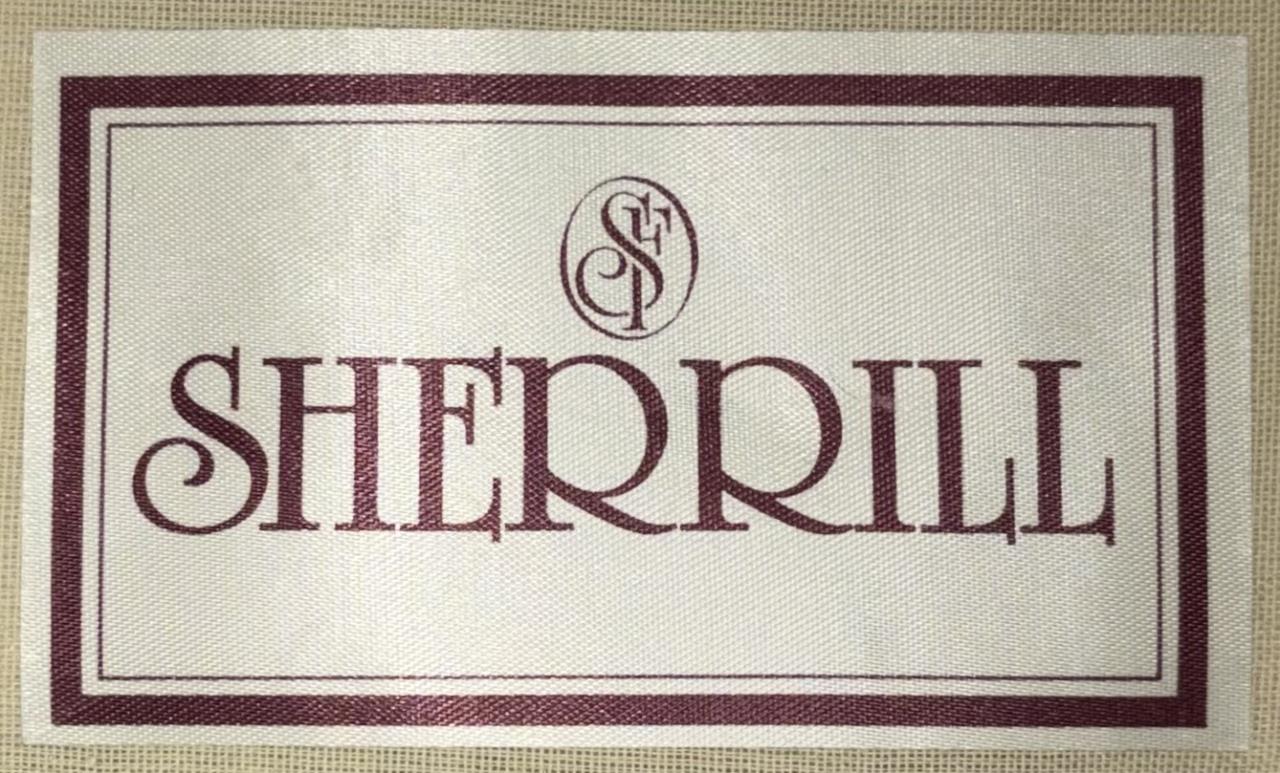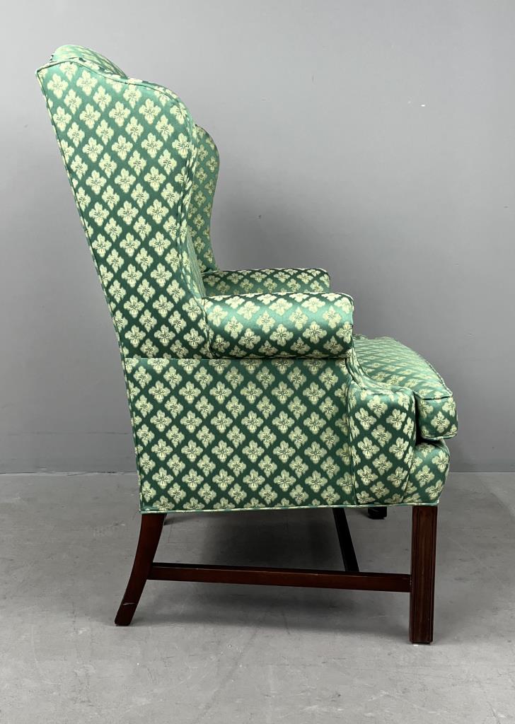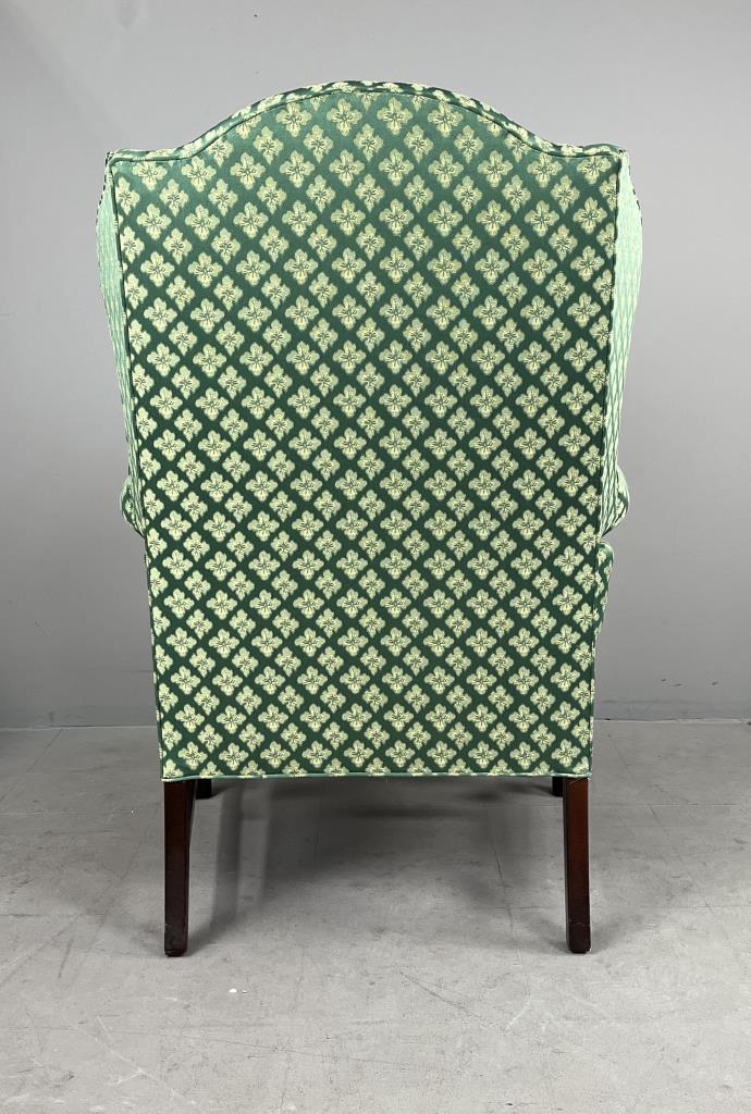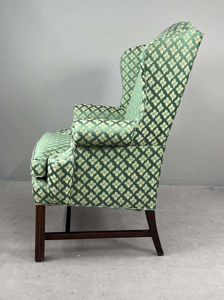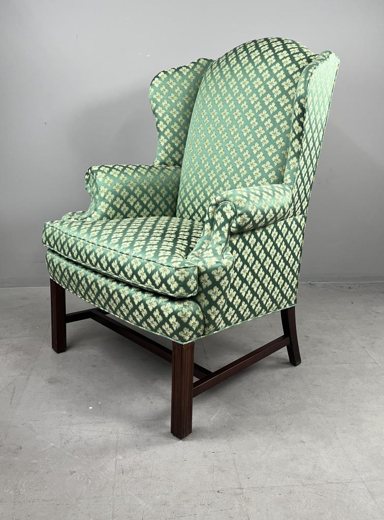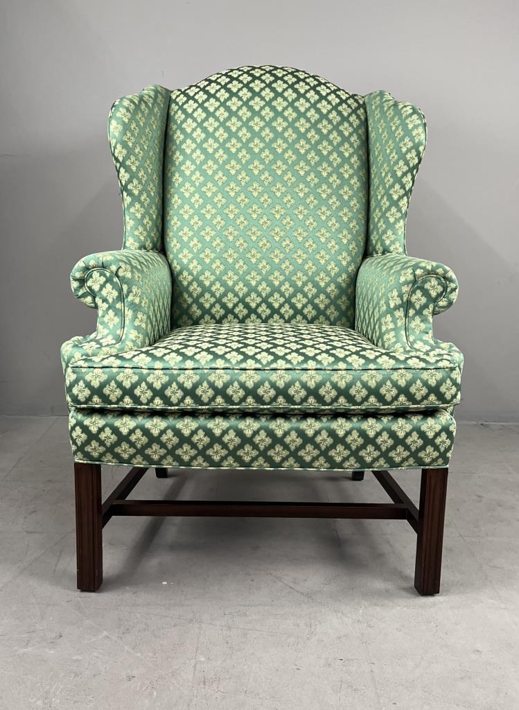 Sherrill (Hickory, North Carolina), Queen Anne style wingback armchair, with Marlborough legs, green and cream colored damask upholstery, circa late 20th Century, 32″ (D) x 33″ (W) x 45-1/2″ (H).