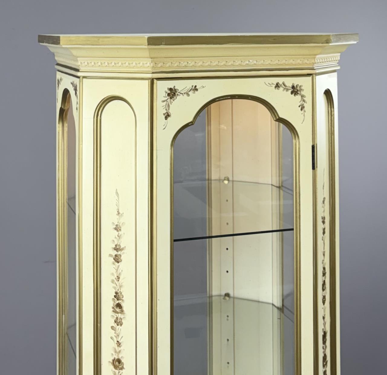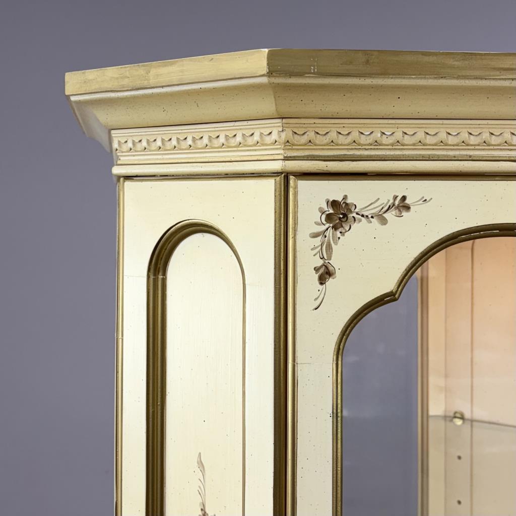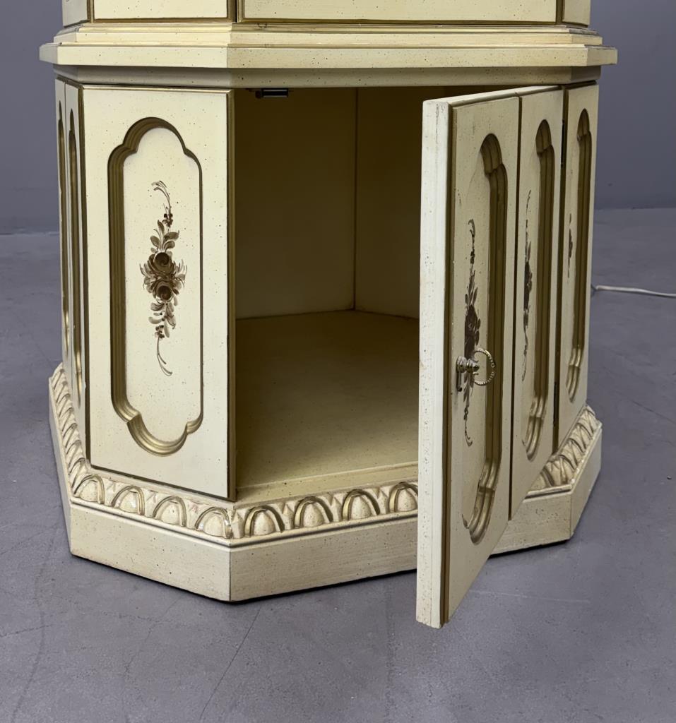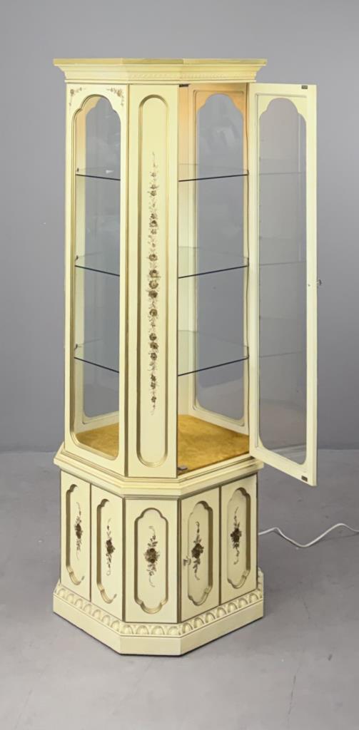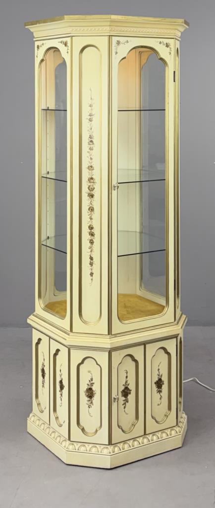 French Provincial style lighted octagonal hand-painted curio cabinet with one glass door on the top opening to revel three glass shelves and a gold velvet lined bottom, above one solid wood door on the bottom, possibly Italian, circa 1960s, 27″ x 27″ x 76-1/4″.