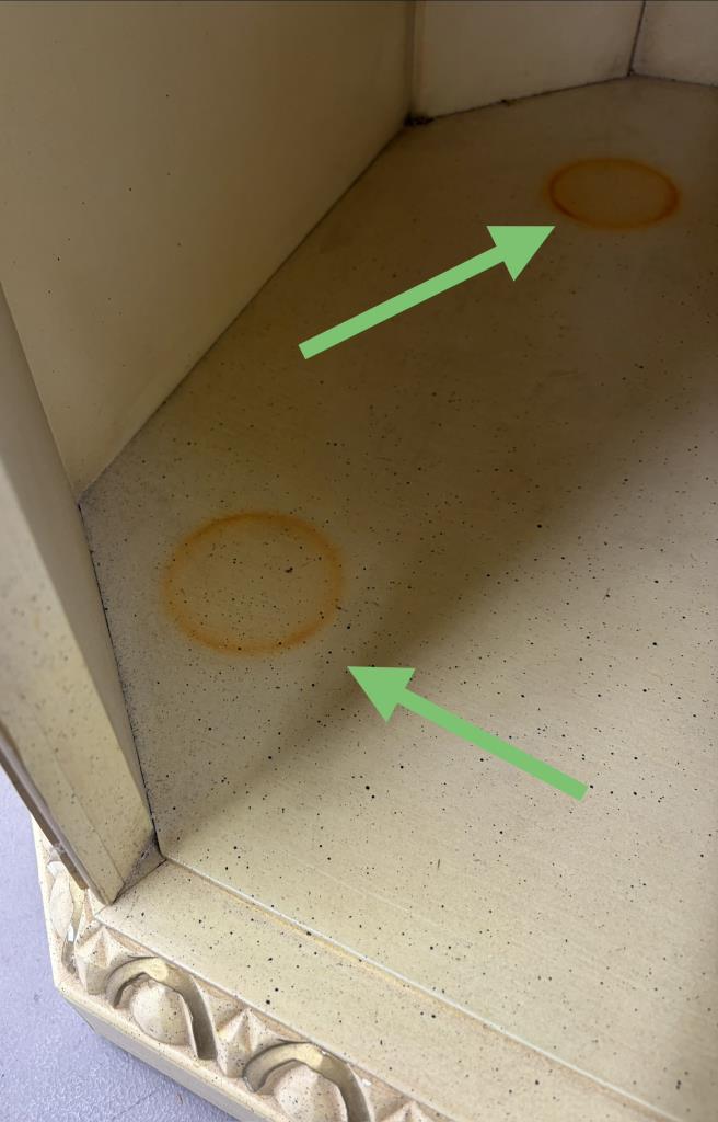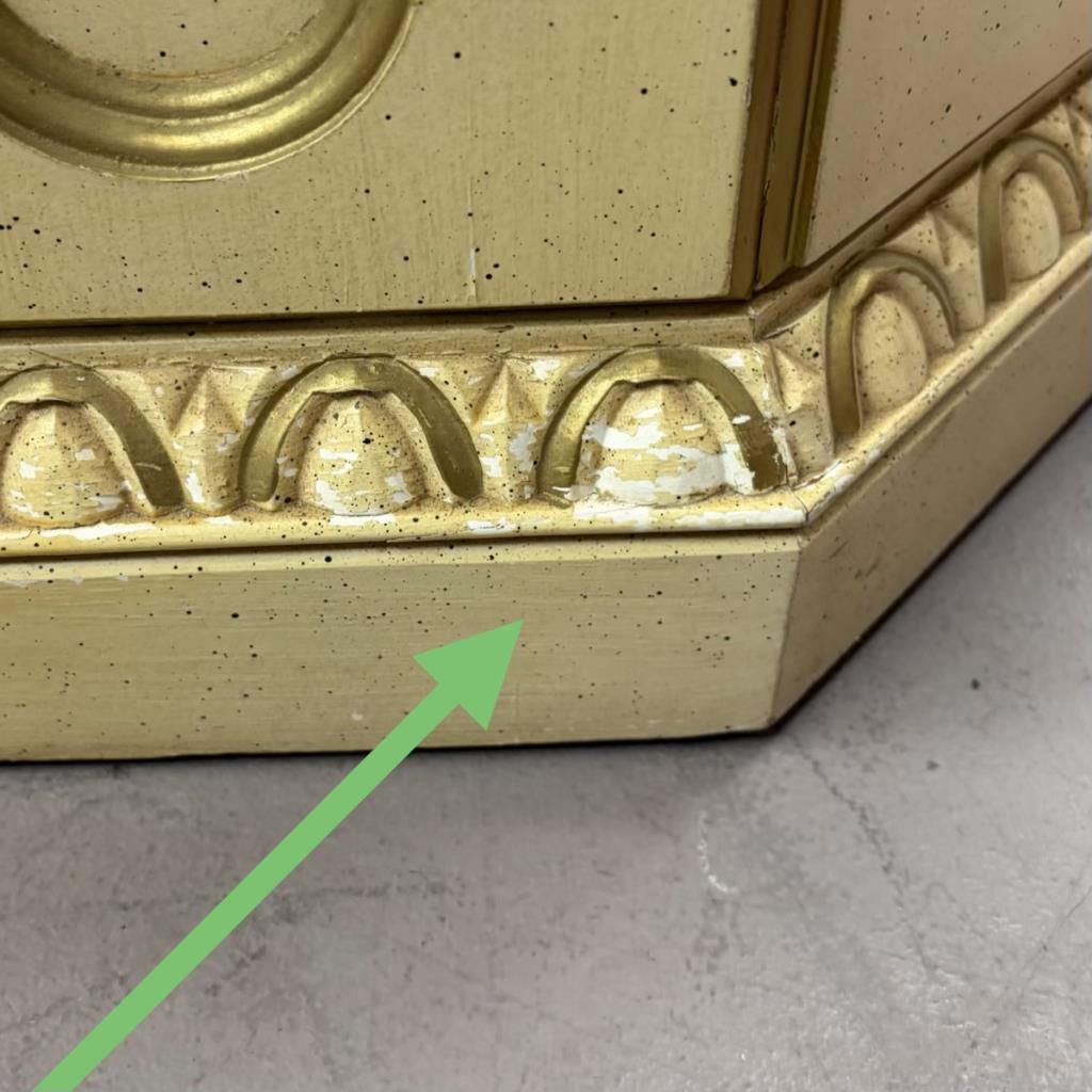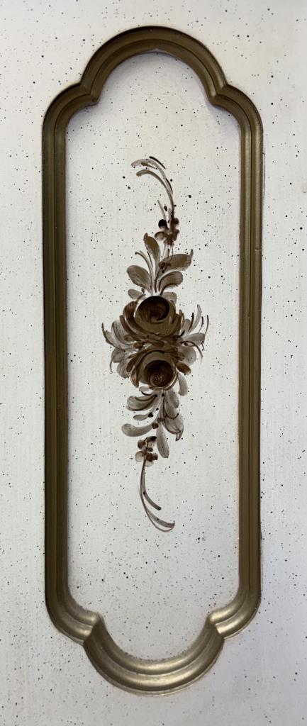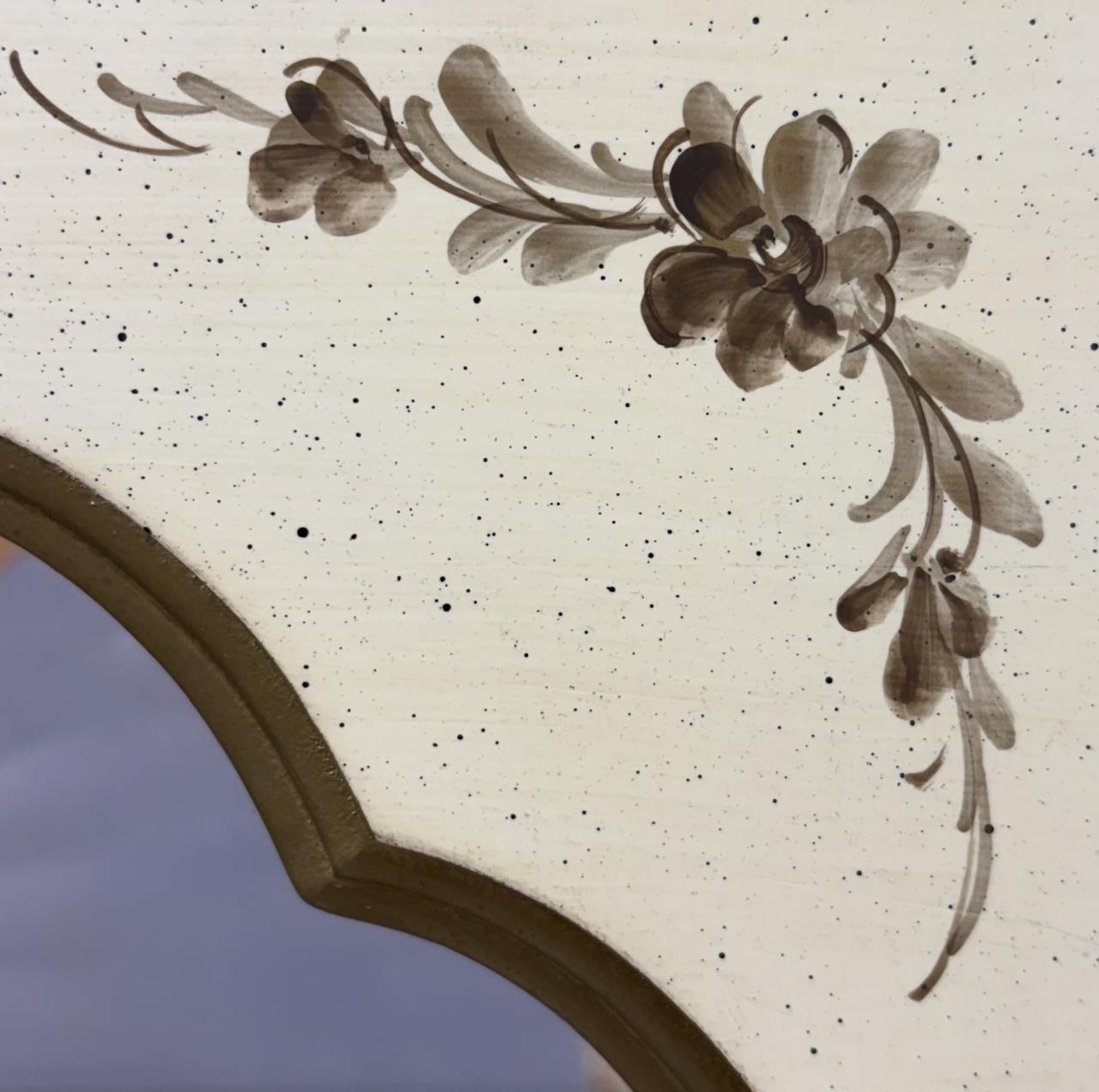French Provincial style lighted octagonal hand-painted curio cabinet with one glass door on the top opening to revel three glass shelves and a gold velvet lined bottom, above one solid wood door on the bottom, possibly Italian, circa 1960s, 27″ x 27″ x 76-1/4″.