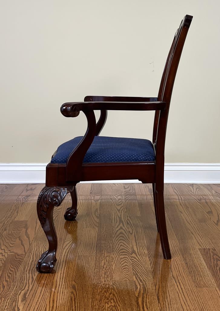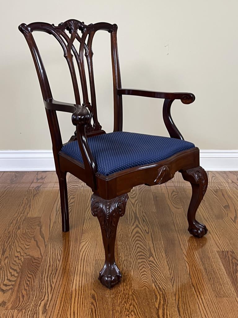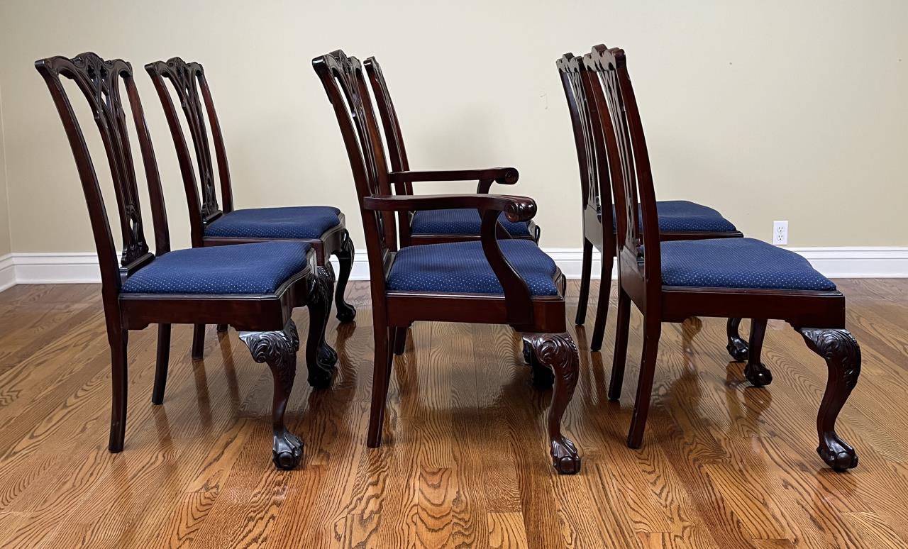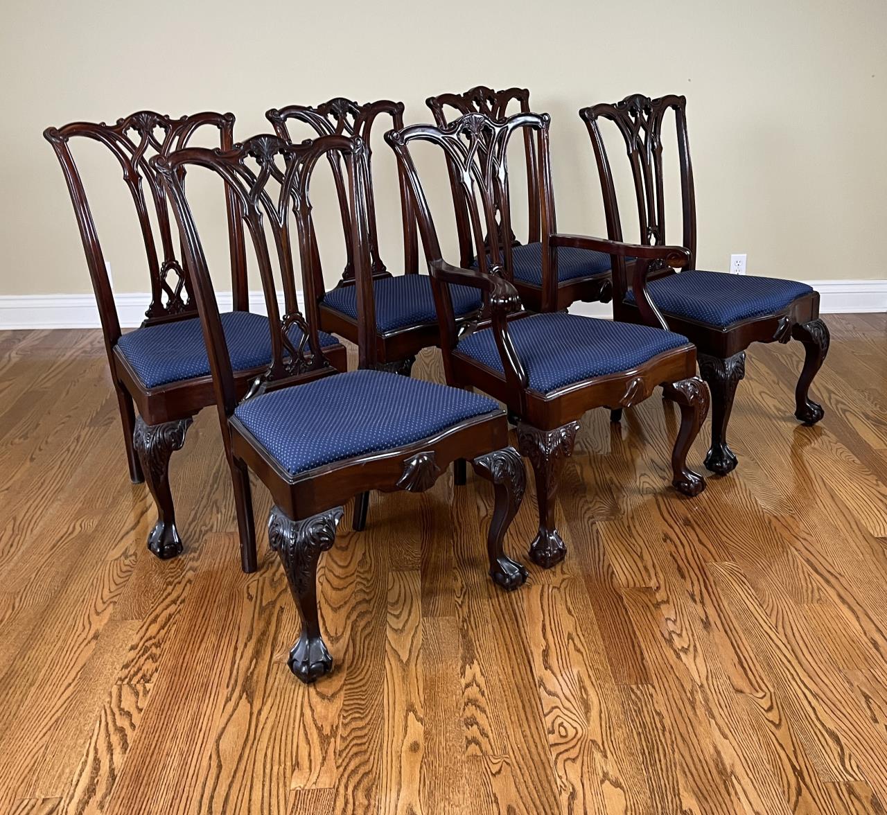 Set of six Chippendale style dining chairs, mahogany, five side chairs and one arm chair, all with upholstered slip seats, circa late 20th Century.