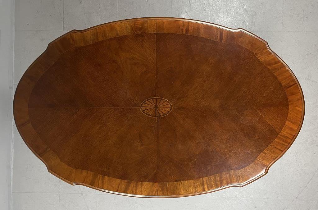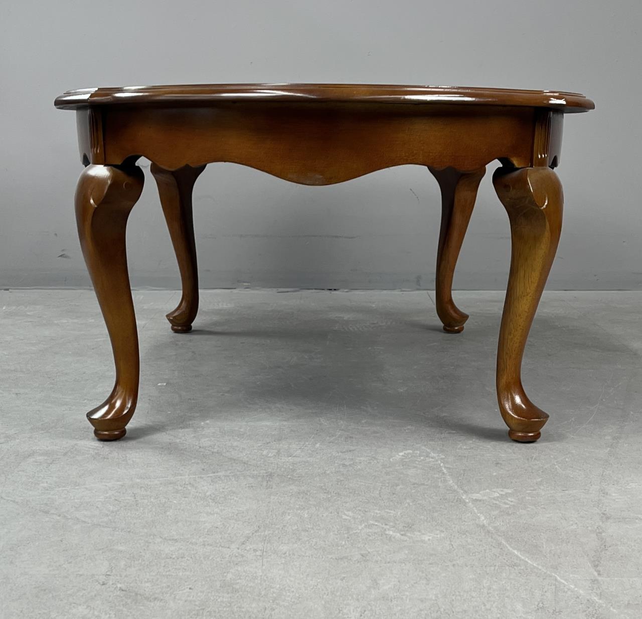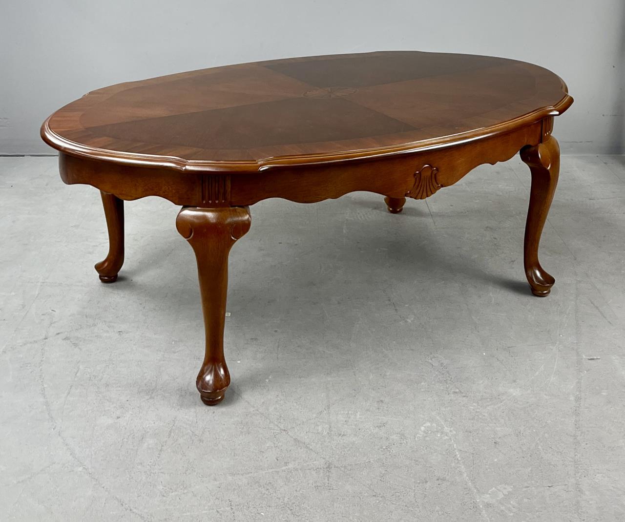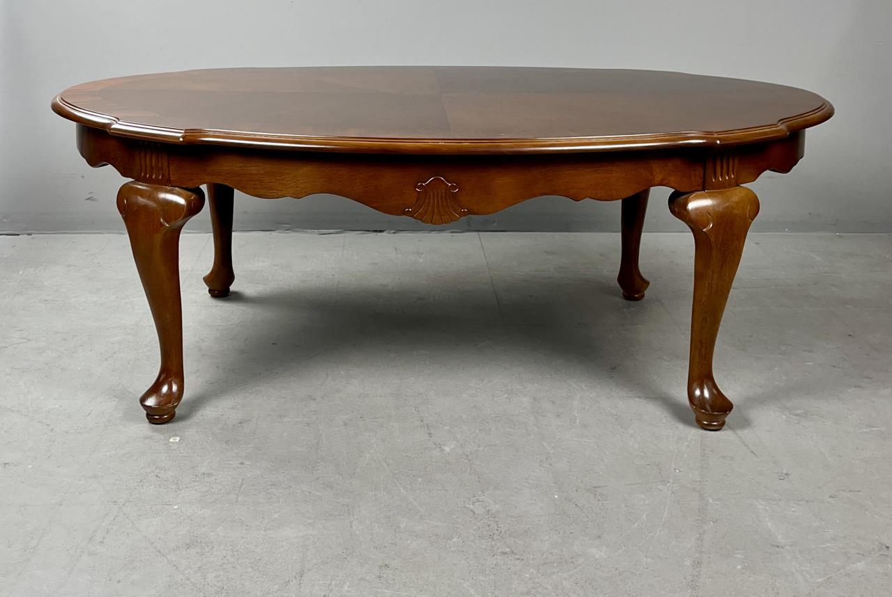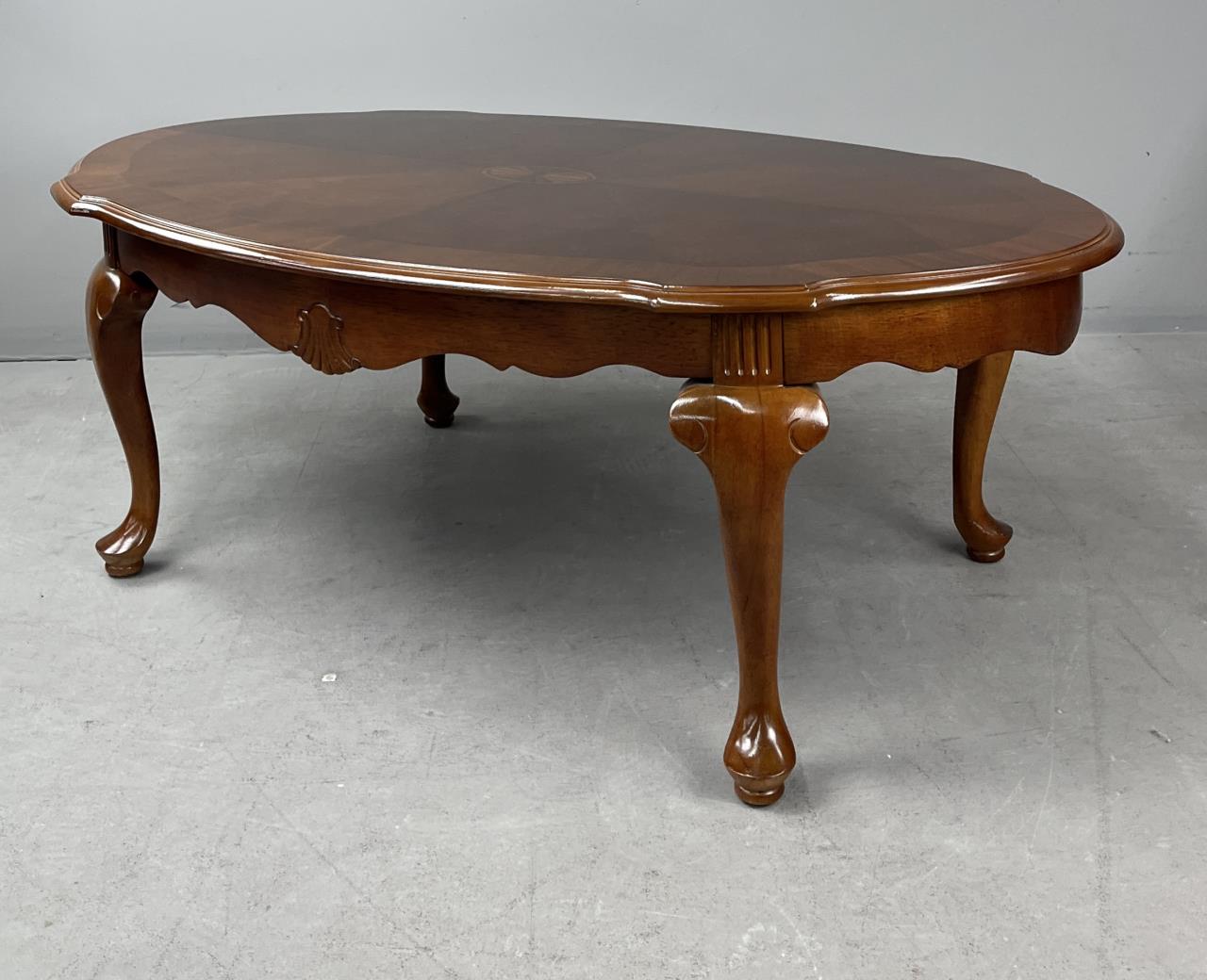 Queen Anne style coffee table, with an inlaid central marquetry medallion, banded scalloped edge, carved shell motif on apron, cabriole legs, and pad feet, circa late 20th Century, 30″ (D) x 48-1/4″ (W) x 17-1/8″ (H).