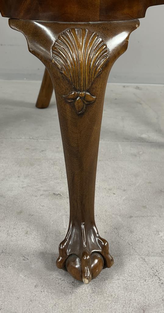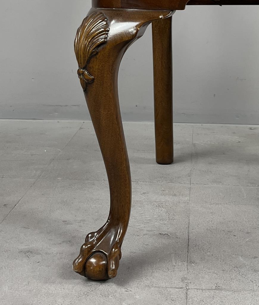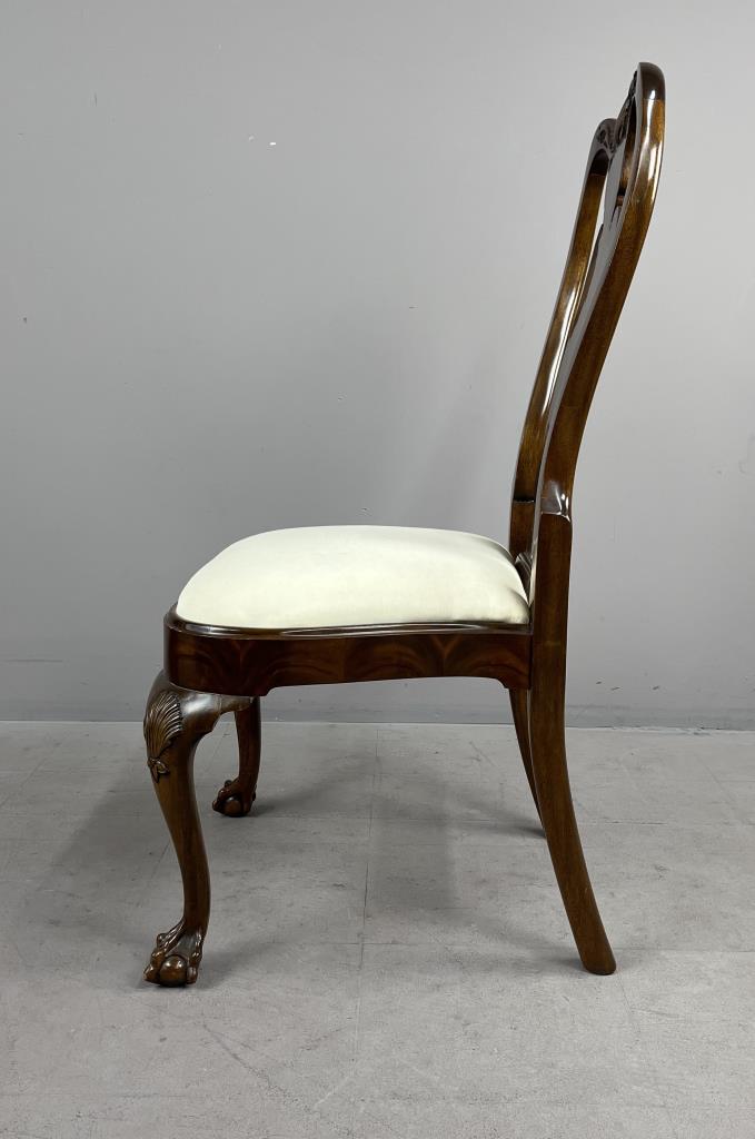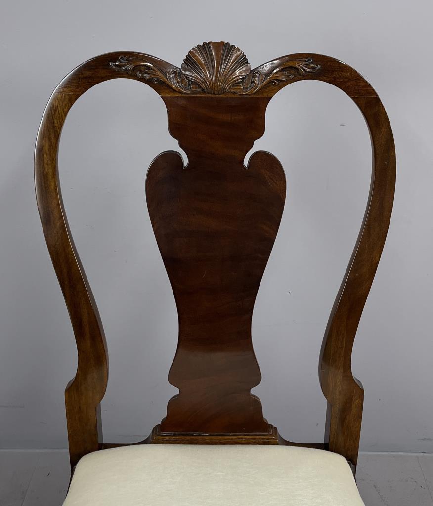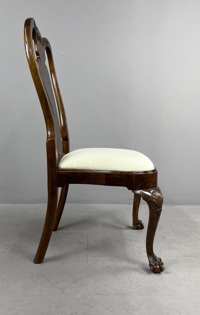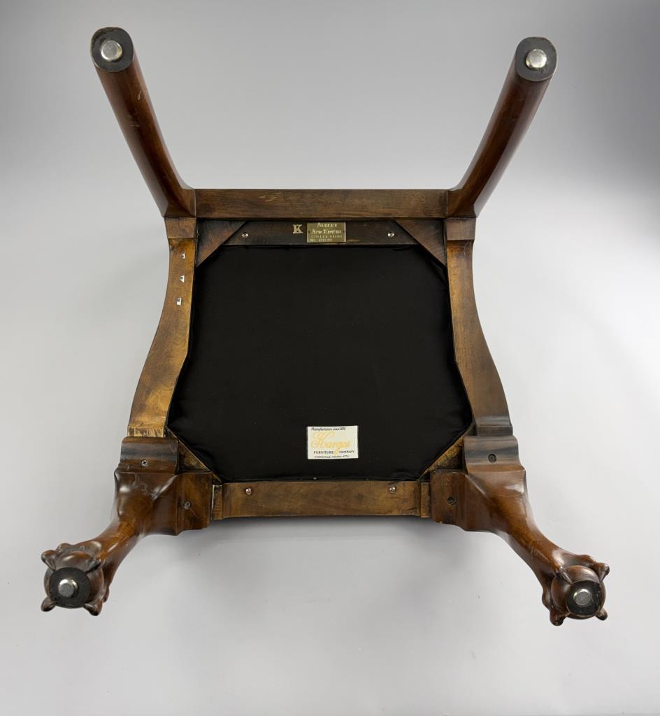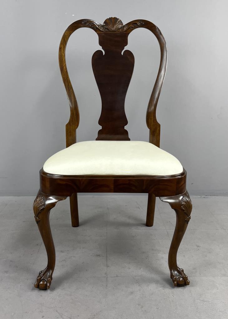 Karges Furniture Company (Evansville, Indiana), Queen Anne style side chair, from the Albert and Edwin Collection and numbered, mahogany, with shell and foliate carving across the crest rail, shell carvings on the knees, and ball and claw feet, labeled on underside, circa mid to late 20th Century, 22-5/8″ x 22-1/2″ x 41-1/4″.