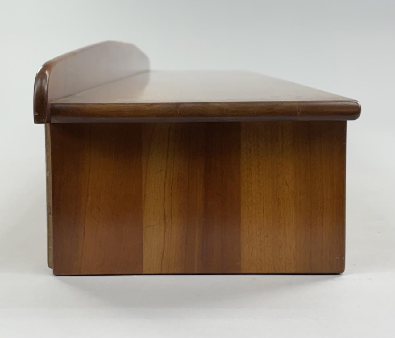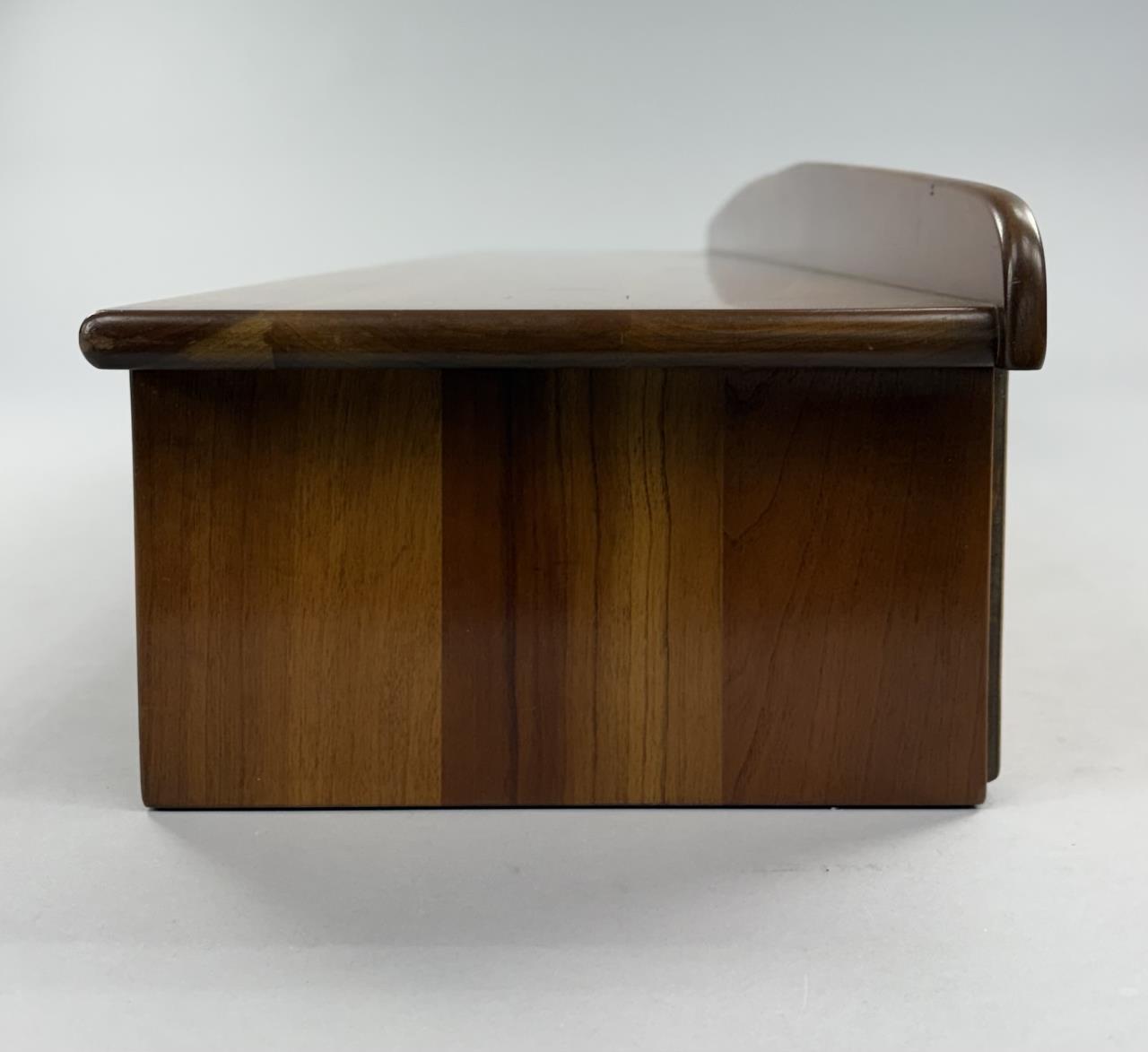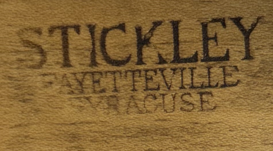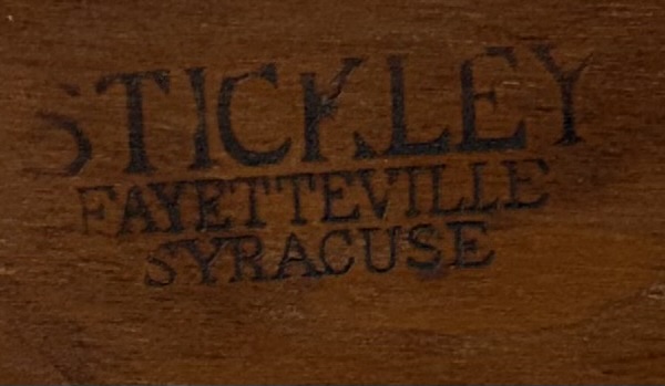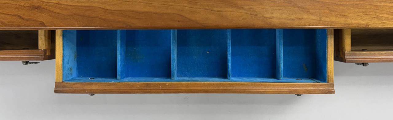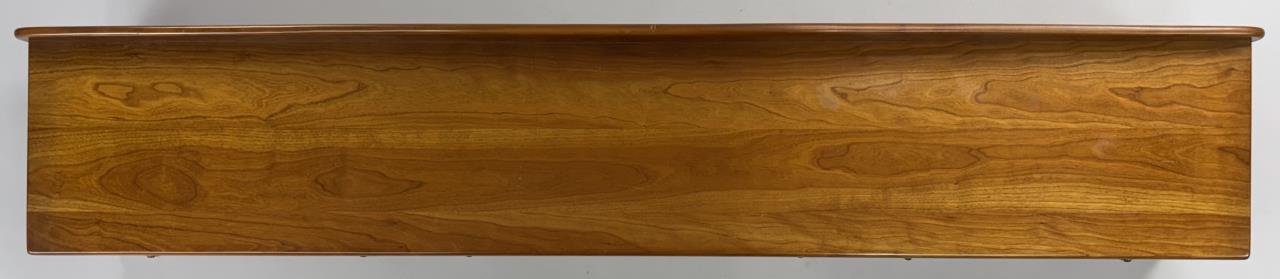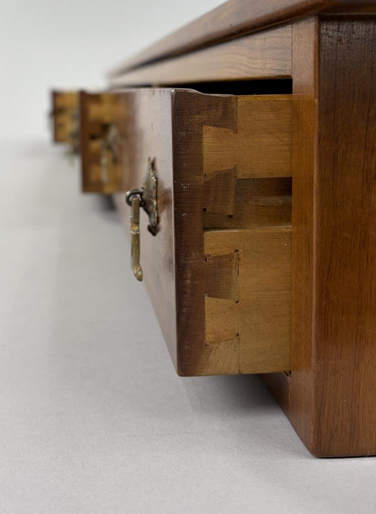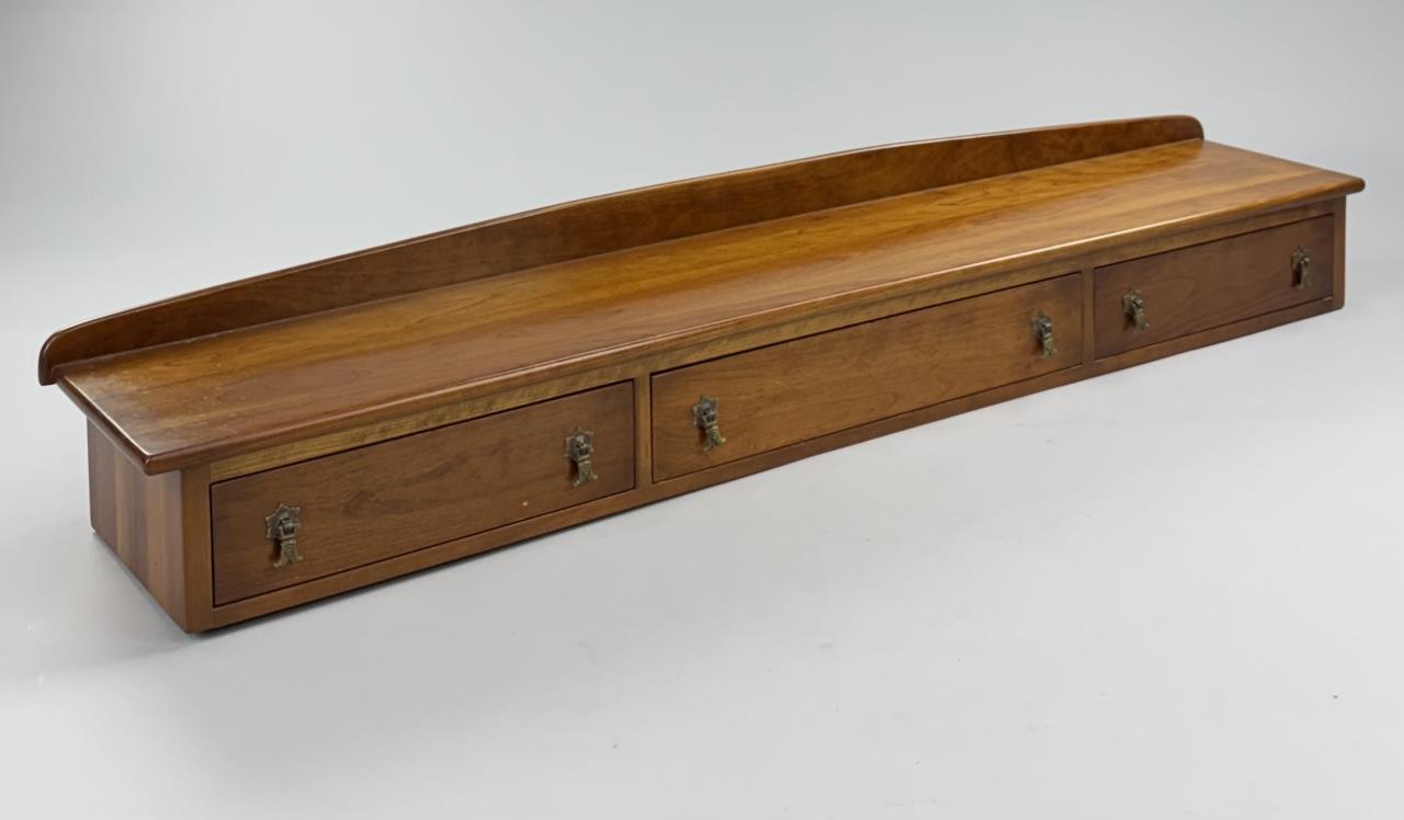 L. & J.G. Stickley (Fayetteville, New York), Colonial Revival style, jewelry or glove dresser box, with three drawers with brass drop pulls, from the Cherry Valley Collection, labeled on inside of the top left drawer, cherry, circa mid 20th Century, 9-3/8″ (D) x 51-3/16″ (W) x 7-3/8″ (H).