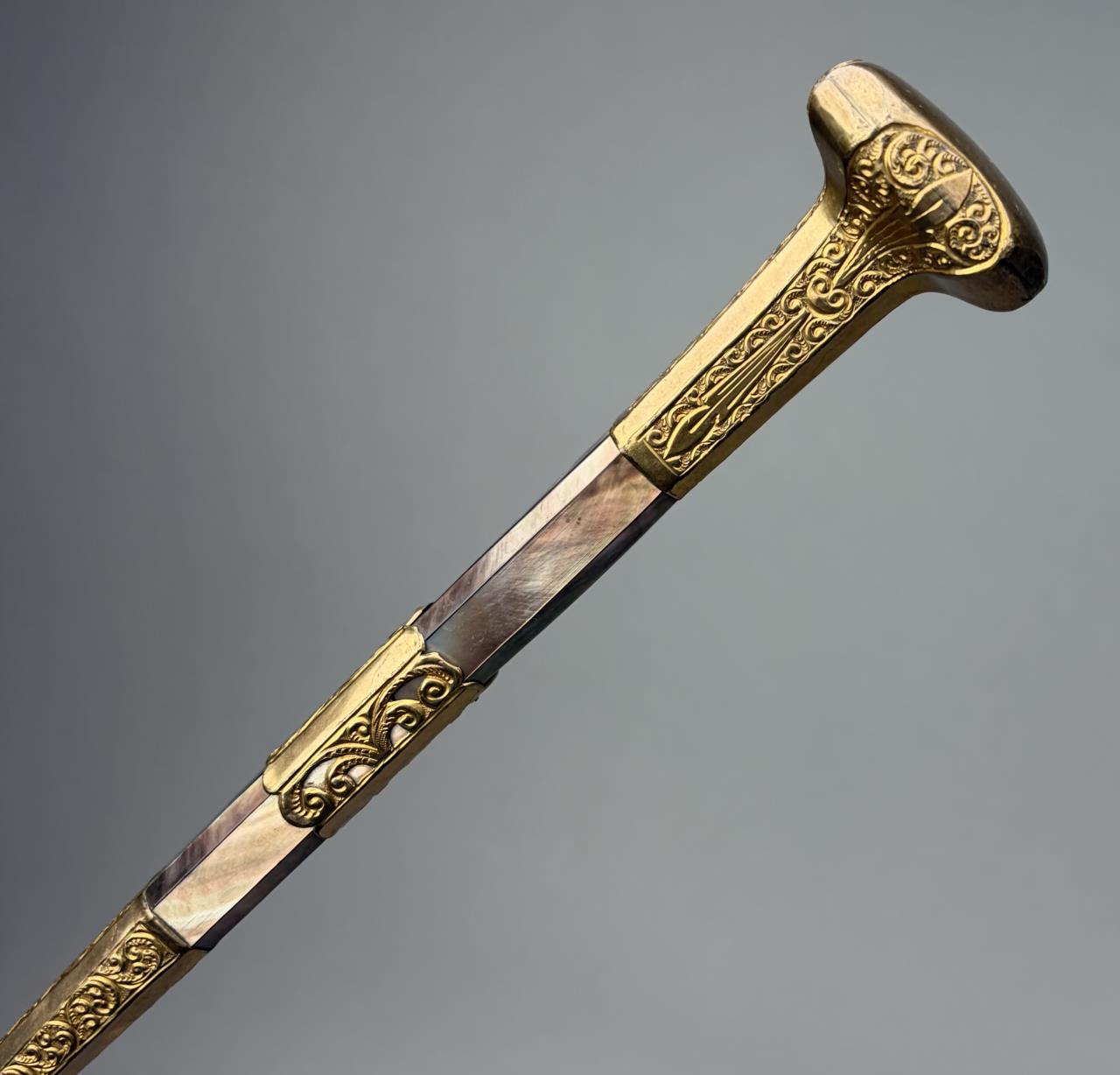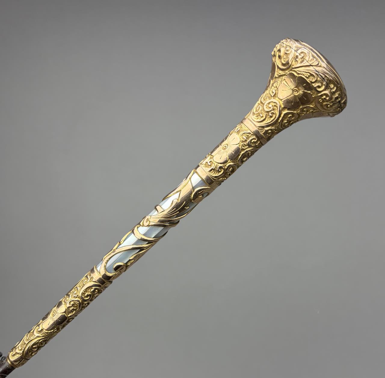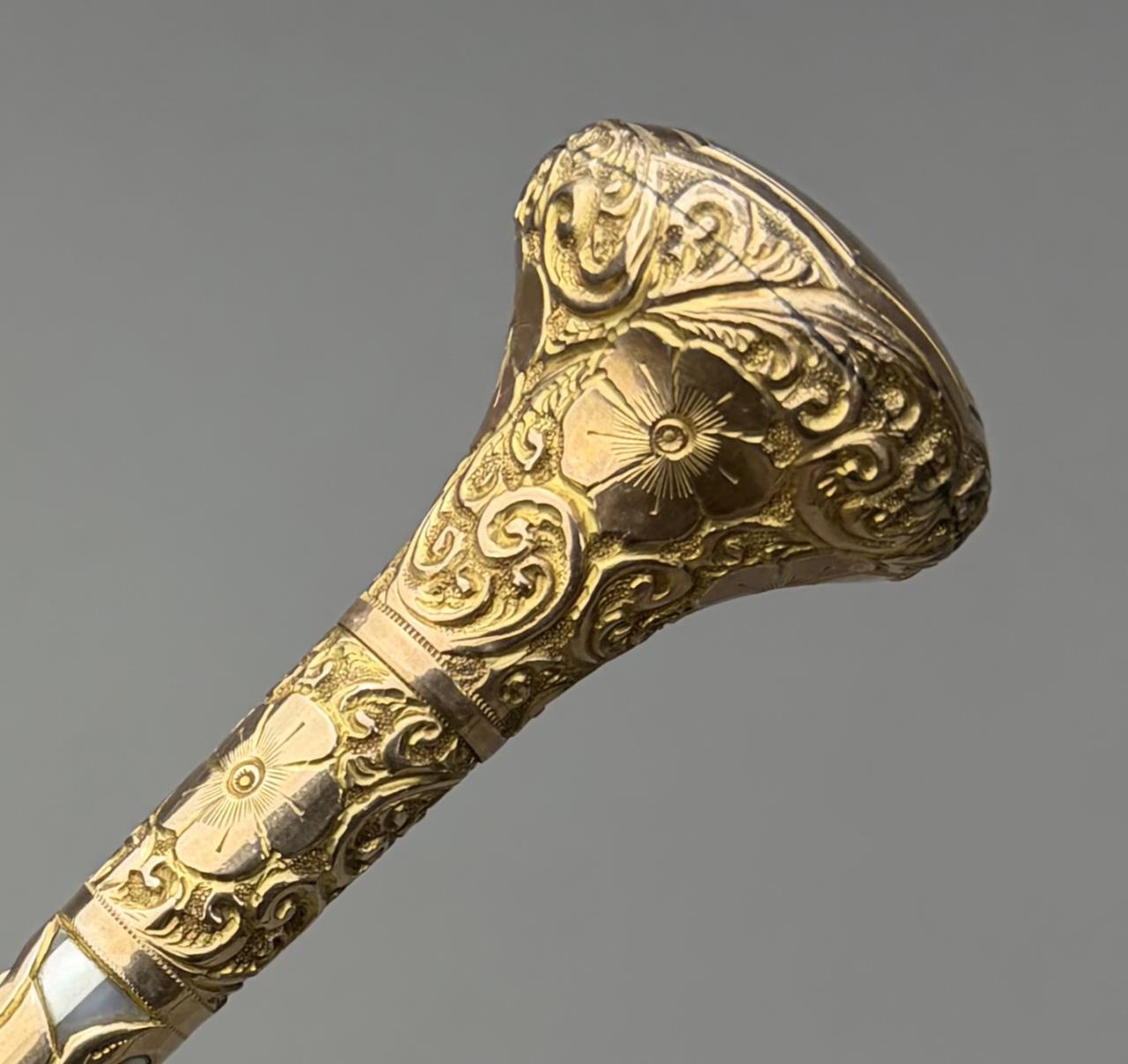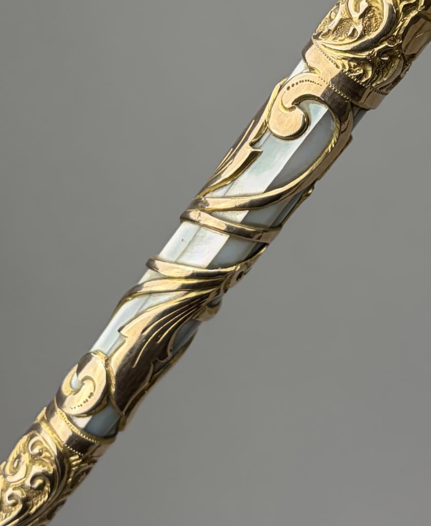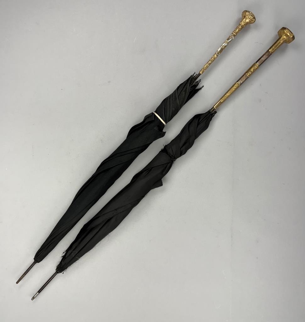 Two antique umbrellas, one with engraved floral and scroll work and filigree over faceted mother of pearl, the other also with engraved floral and scroll work and filigree but over faceted abalone shell, the gold on both is unmarked, except for a possible maker’s mark on one, and is untested but most likely gold filled or rolled gold, late 19th / early 20th Century, the largest being 40-1/2″ (L).