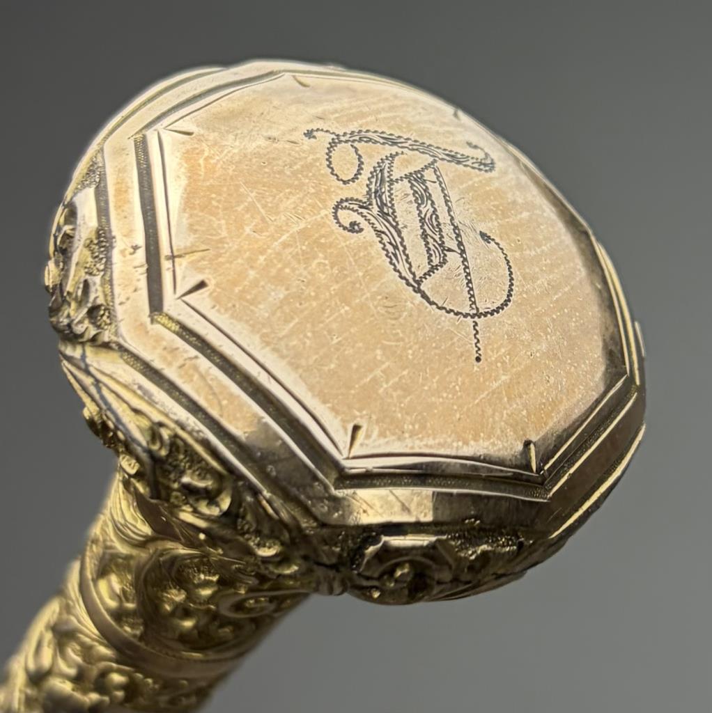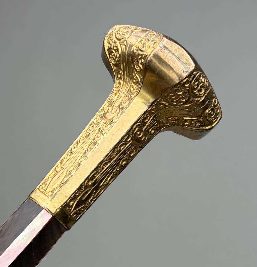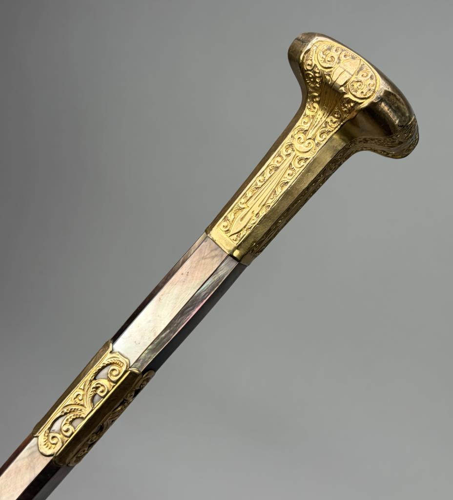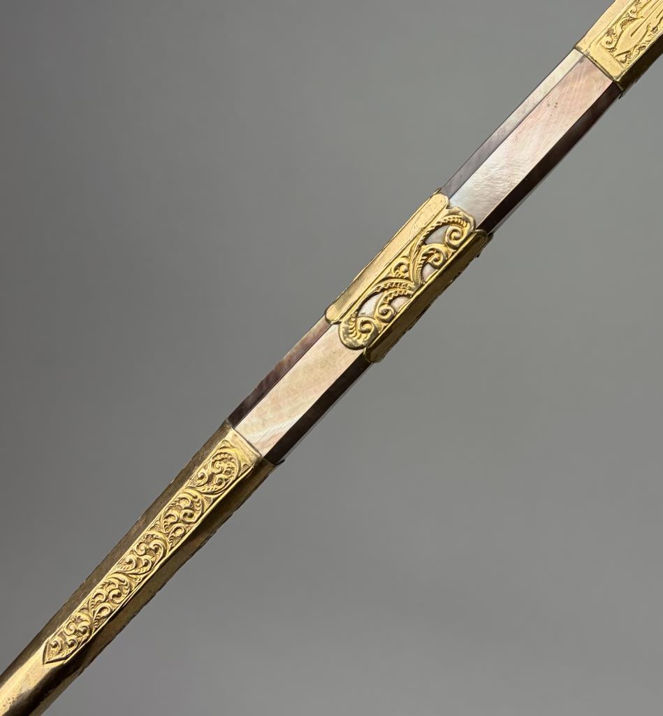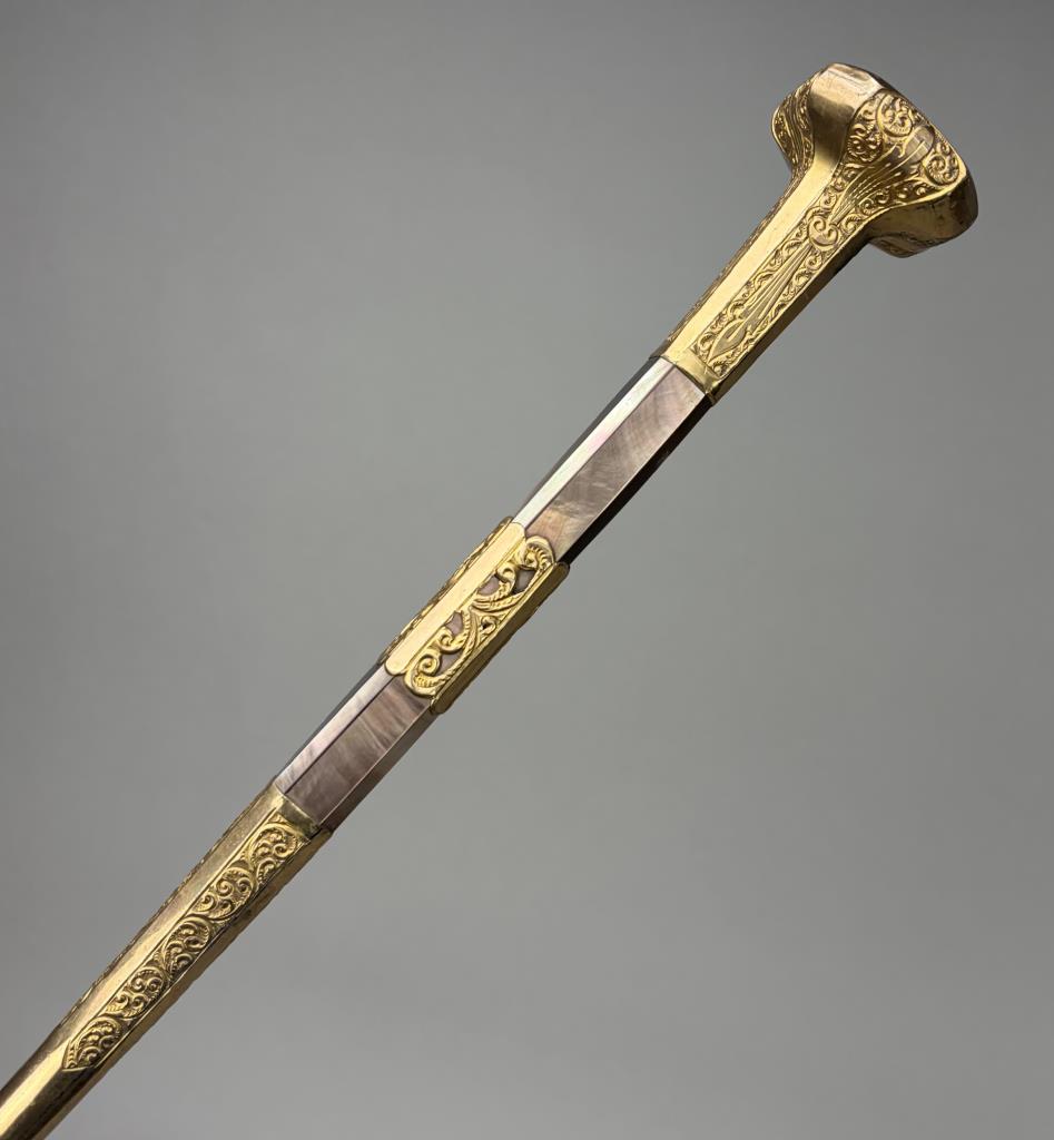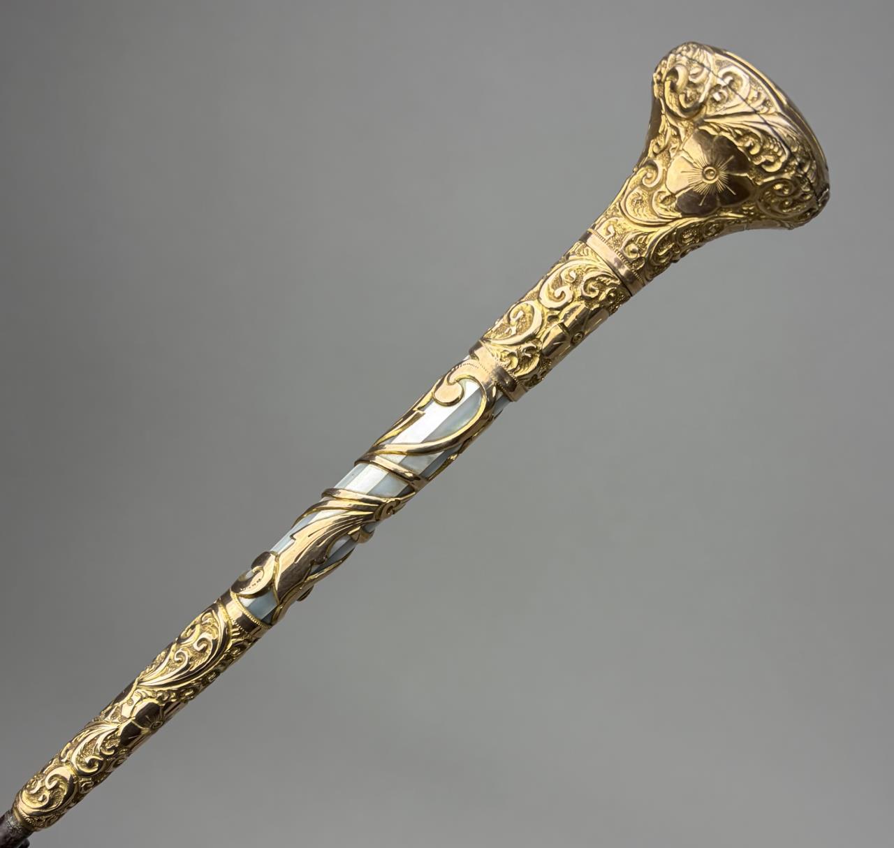 Two antique umbrellas, one with engraved floral and scroll work and filigree over faceted mother of pearl, the other also with engraved floral and scroll work and filigree but over faceted abalone shell, the gold on both is unmarked, except for a possible maker’s mark on one, and is untested but most likely gold filled or rolled gold, late 19th / early 20th Century, the largest being 40-1/2″ (L).