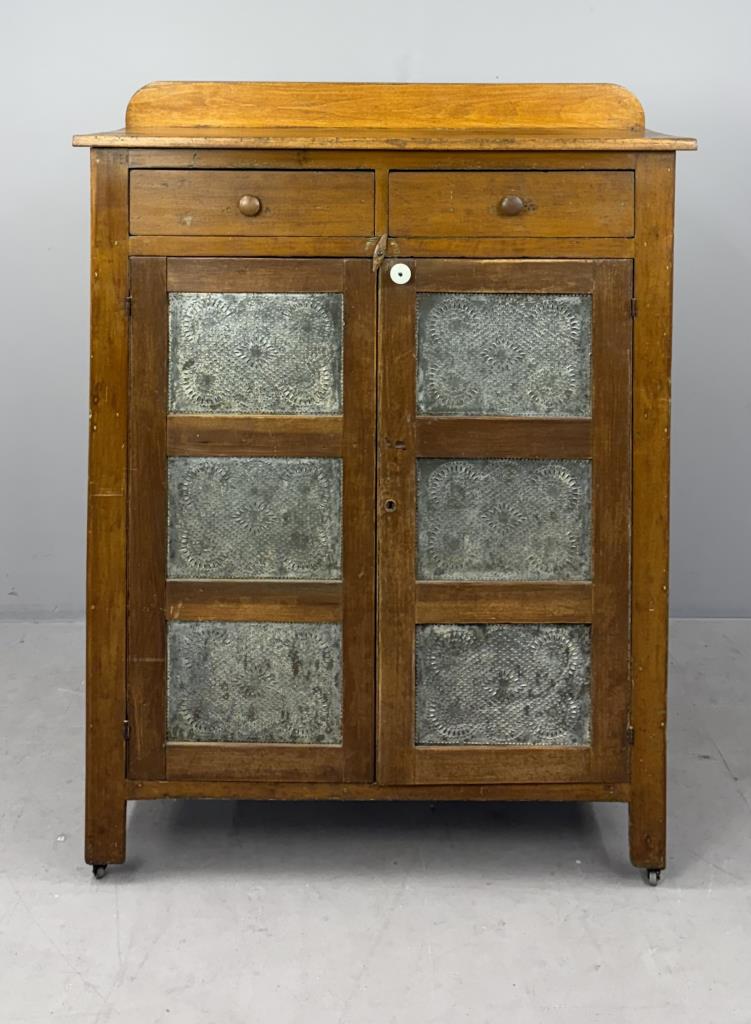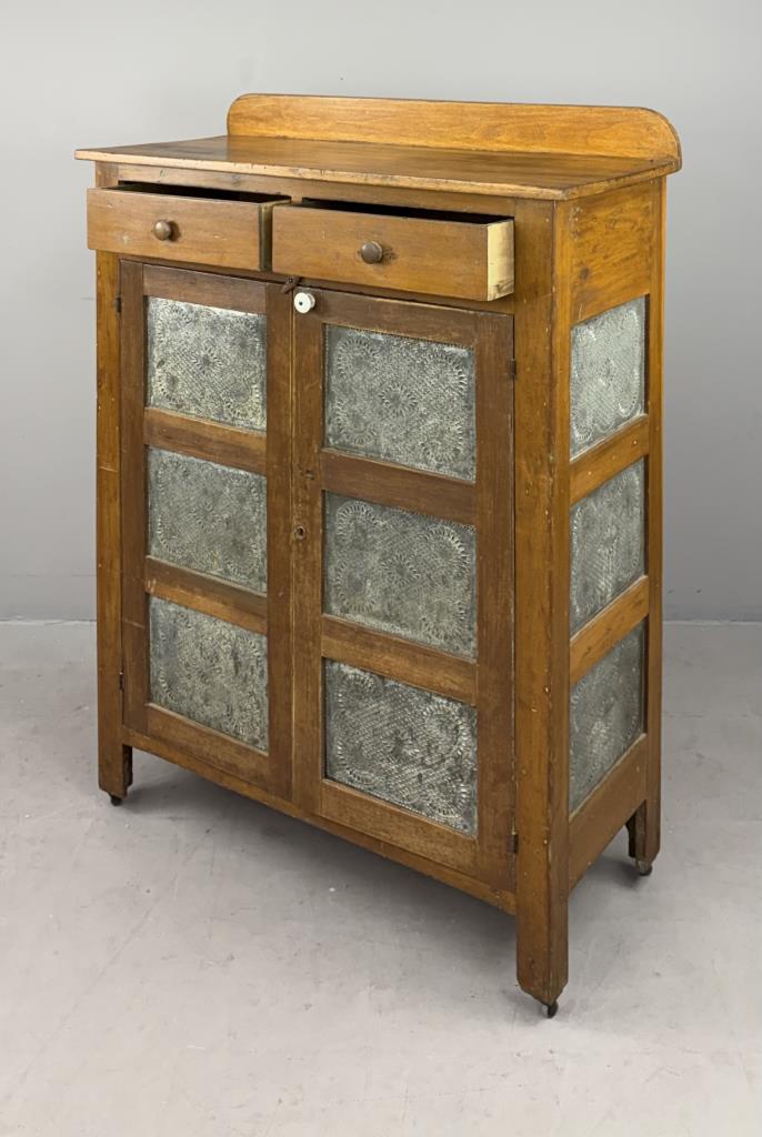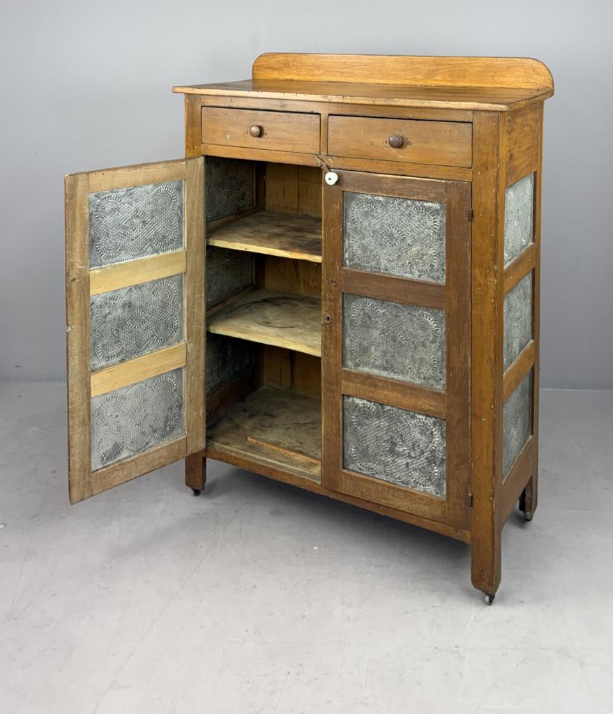 Antique American country pie safe, with two drawers above two doors concealing two shelves, and punched tin panels on both the doors and the sides, mixed woods with remnants of earlier paint, circa late 19th Century, 19-1/2″ x 59-3/4″ x 45-3/4″.