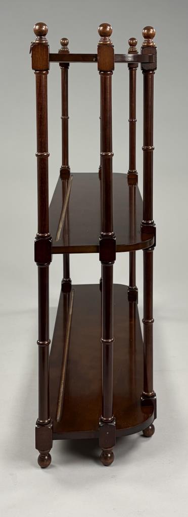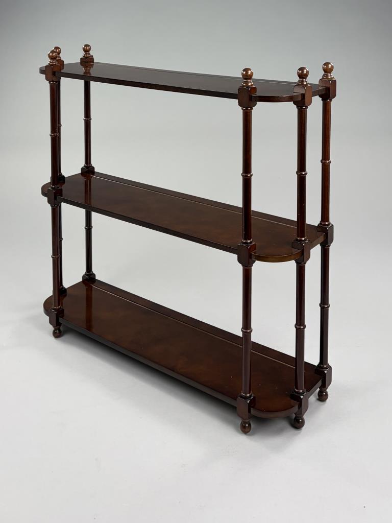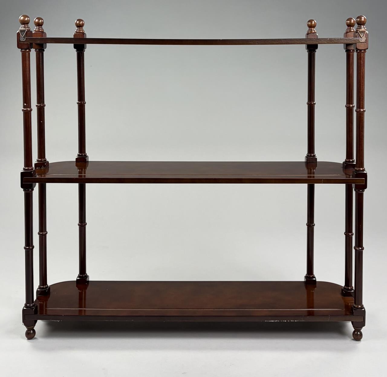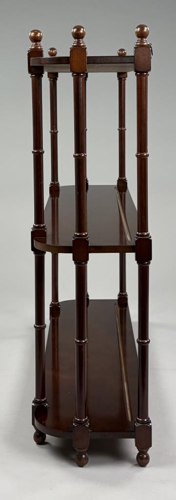 Georgian style wall-hanging or freestanding etagere, from The Bombay company, three shelves with turned support columns, tag on underside, mahogany, 8″ x 30-3/4″ x 29-1/4″.
