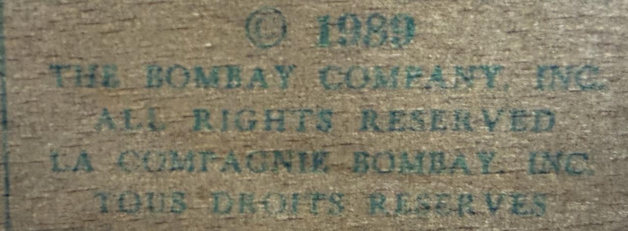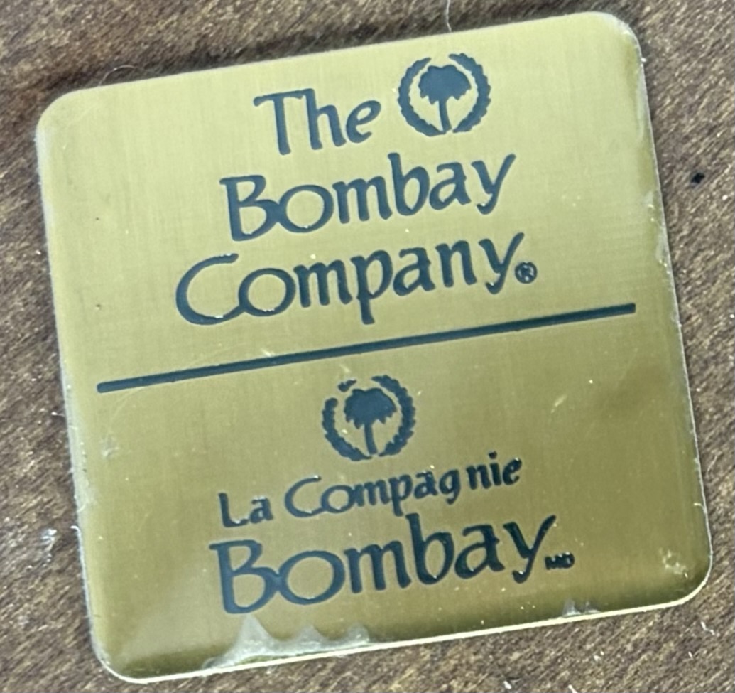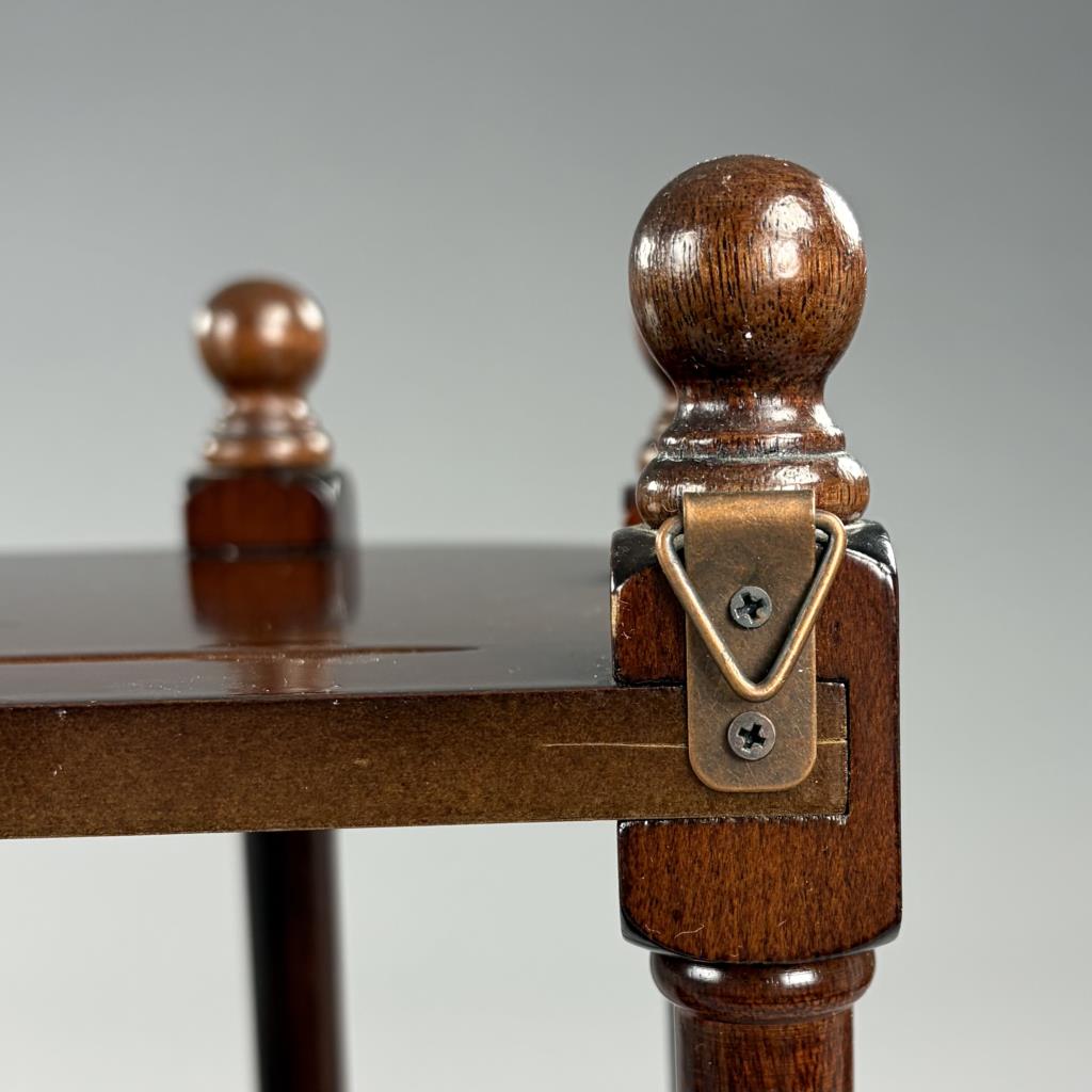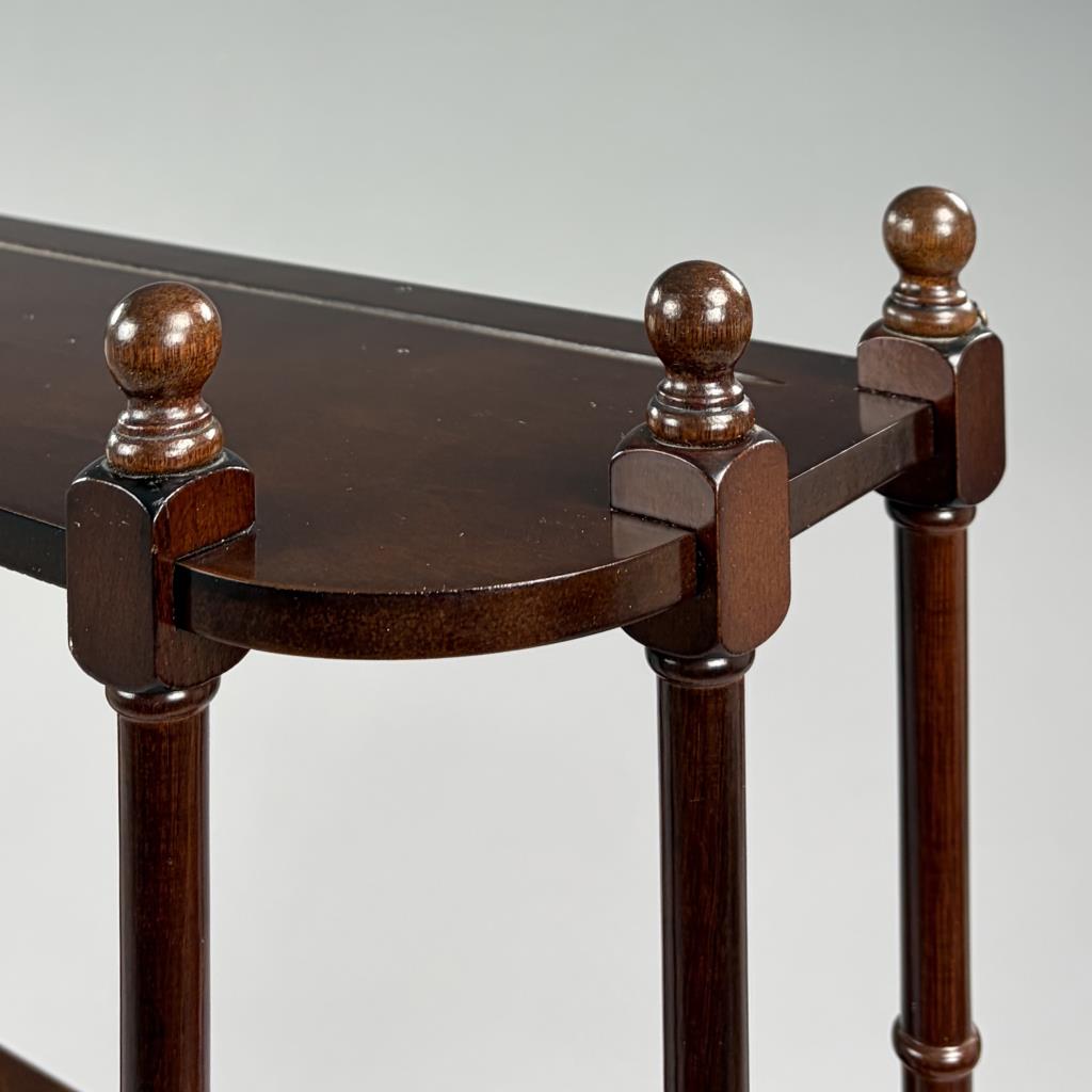 Georgian style wall-hanging or freestanding etagere, from The Bombay company, three shelves with turned support columns, tag on underside, mahogany, 8″ x 30-3/4″ x 29-1/4″.