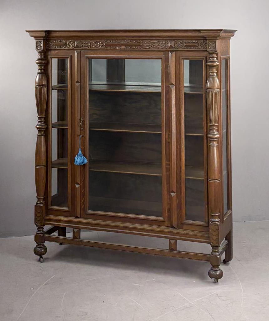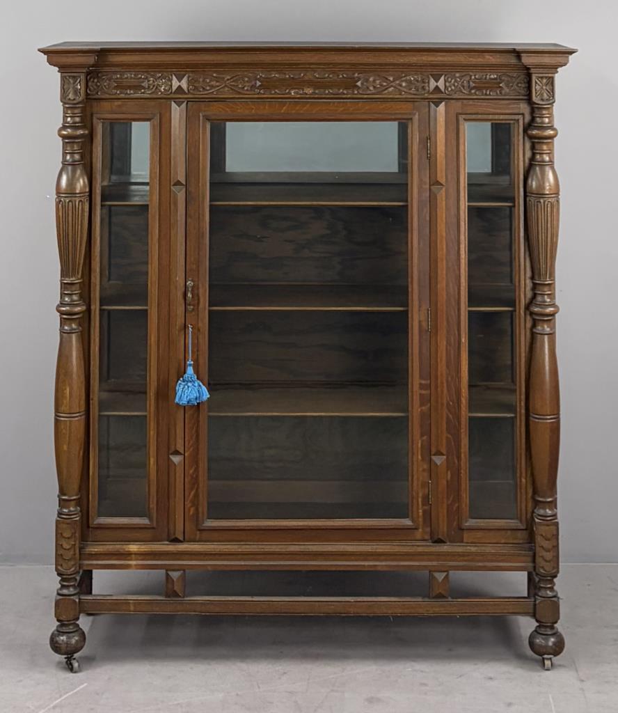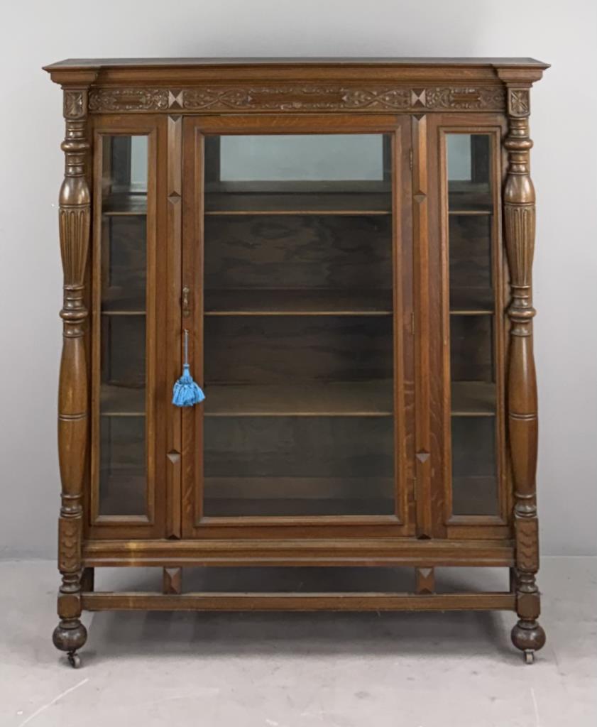 American Edwardian Era, Elizabethan Revival, china cabinet, display cabinet, or bookcase, with one door with key, three shelves, carved quartersawn oak, circa 1900-1910, 18-1/4″ x 56-3/8″ x 63-5/8″.