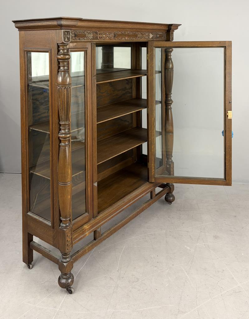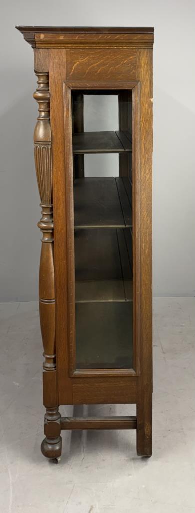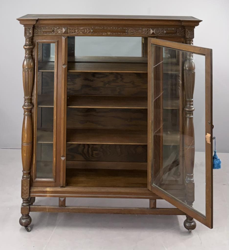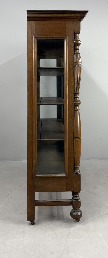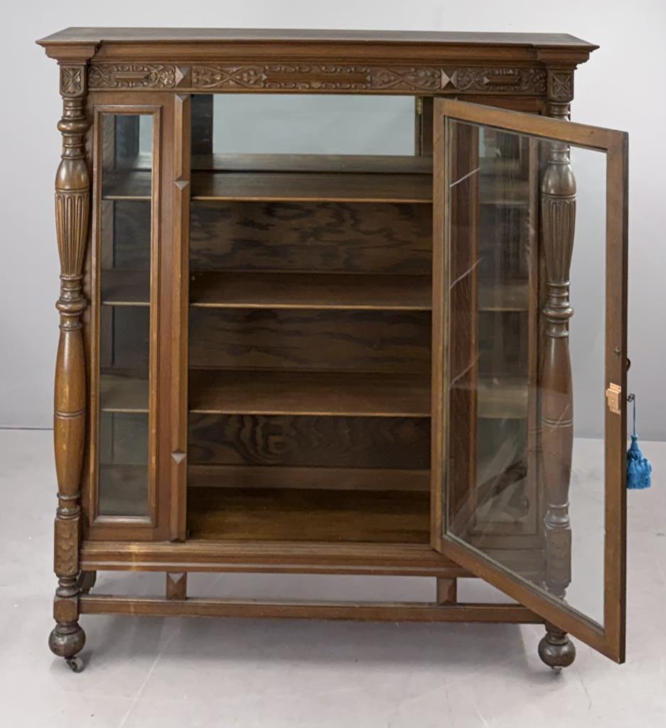 American Edwardian Era, Elizabethan Revival, china cabinet, display cabinet, or bookcase, with one door with key, three shelves, carved quartersawn oak, circa 1900-1910, 18-1/4″ x 56-3/8″ x 63-5/8″.