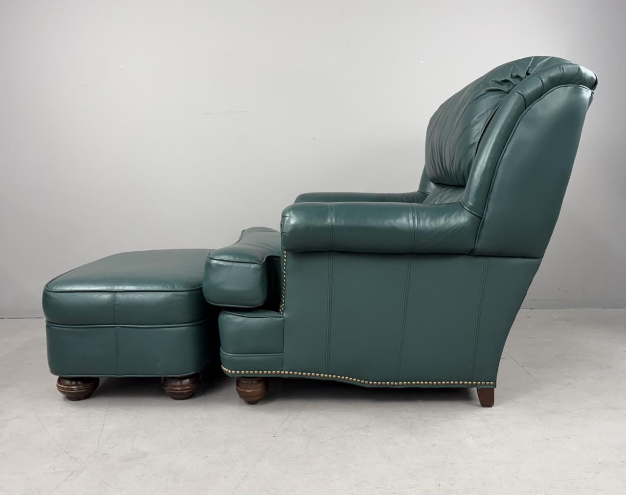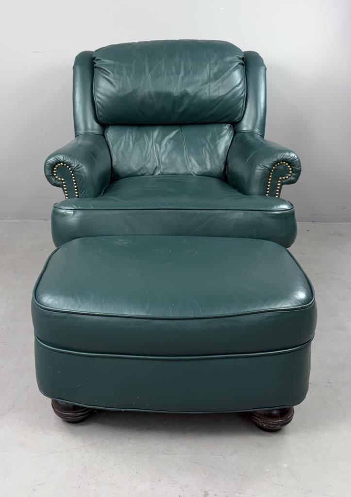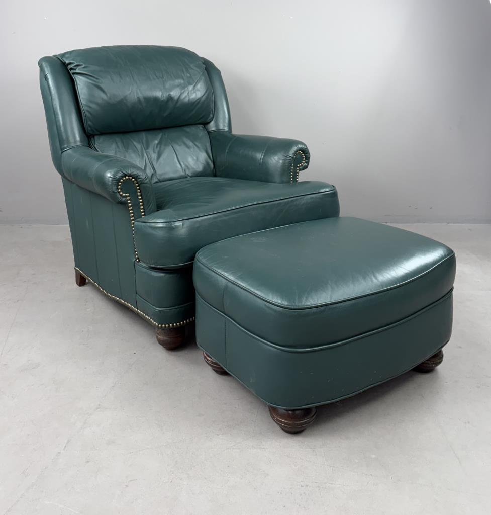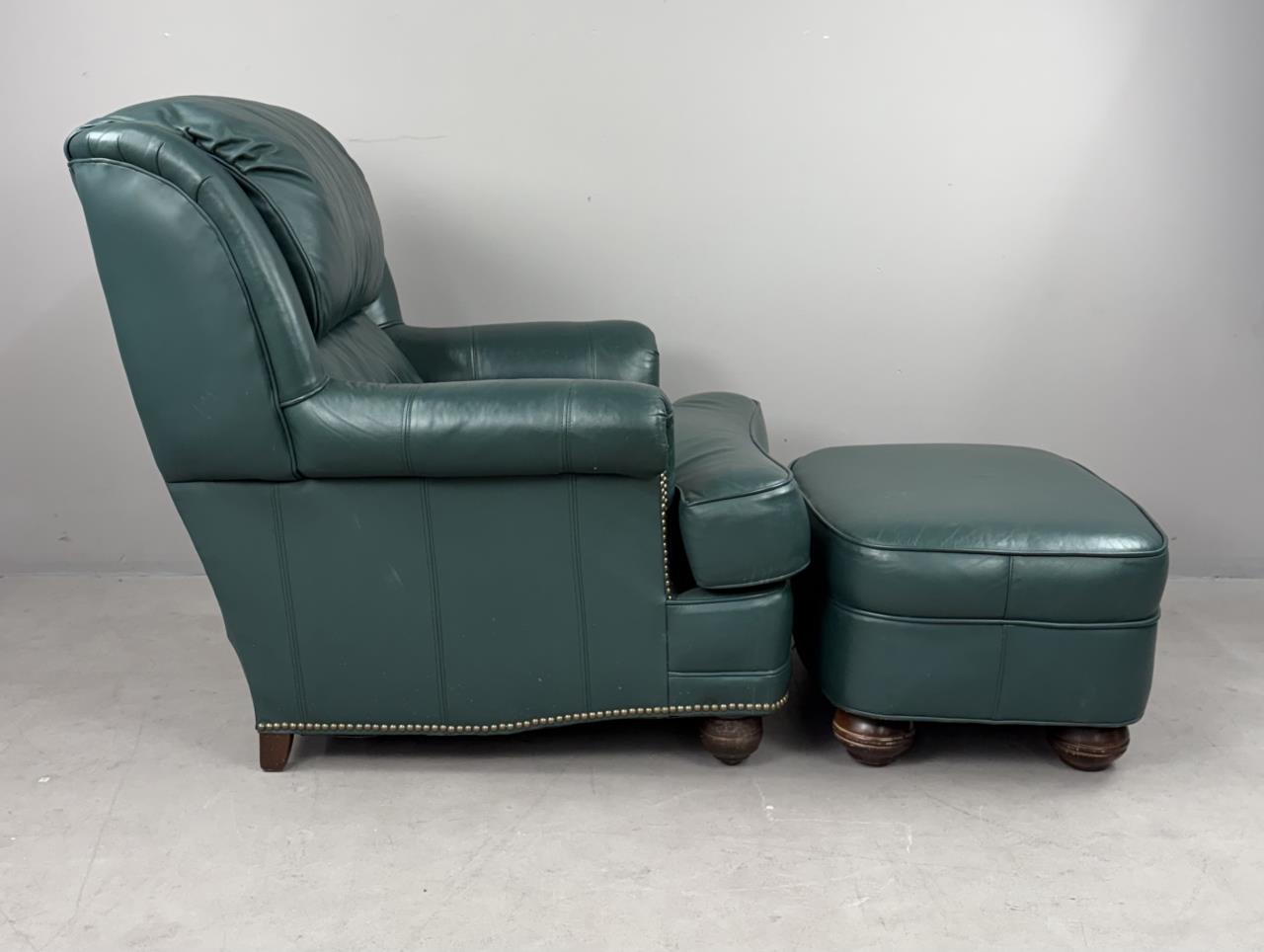 Distinction Furniture Corporation (Conover, North Carolina) traditional style club chair (approximately 43″ (D) x 36″ (W) x 37″ (H)) and matching ottoman (approximately 21″ (D) x 27-1/2″ (W) x 15″ (H)), with dark green leather upholstery, exposed brass nailheads, and bun feet.