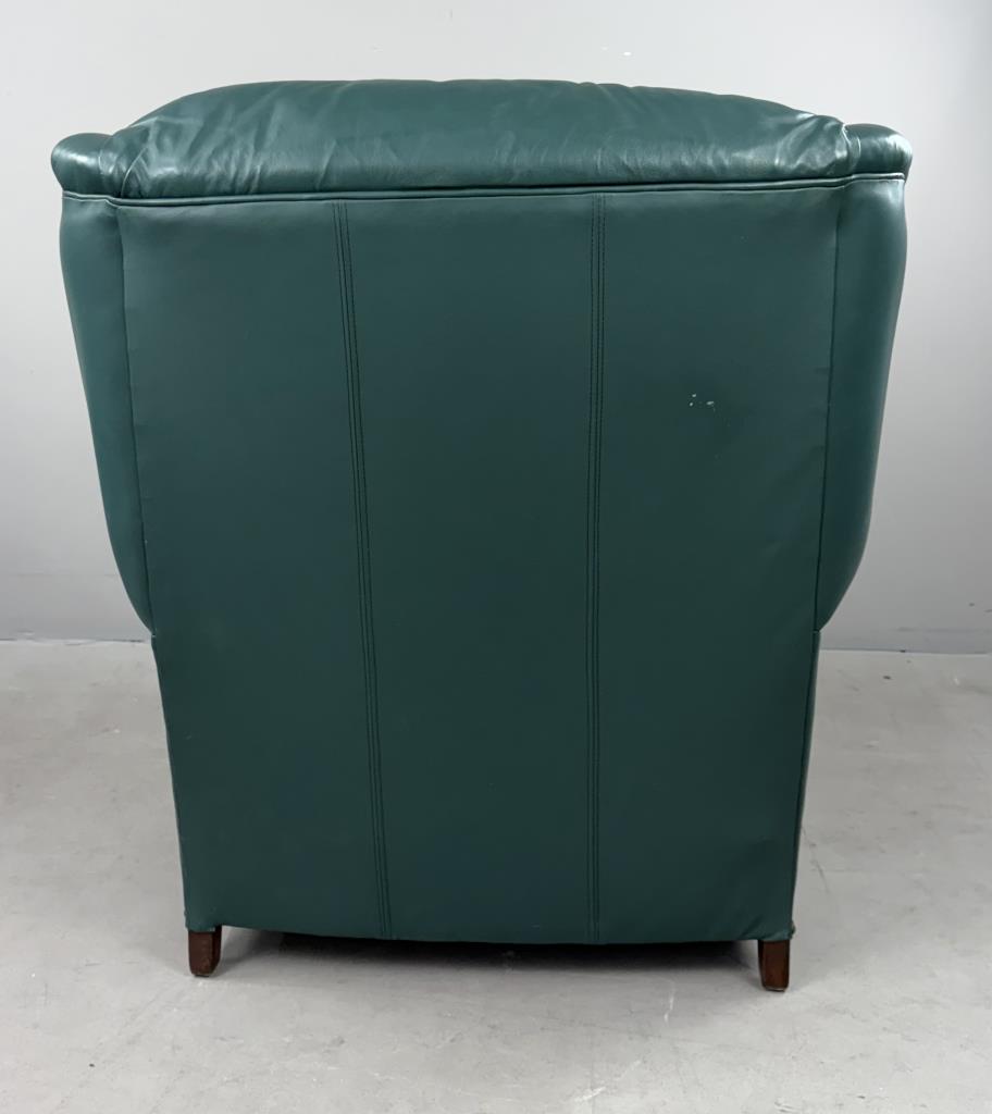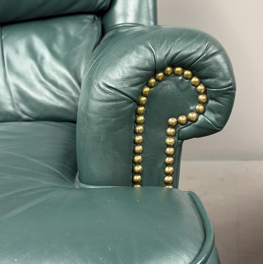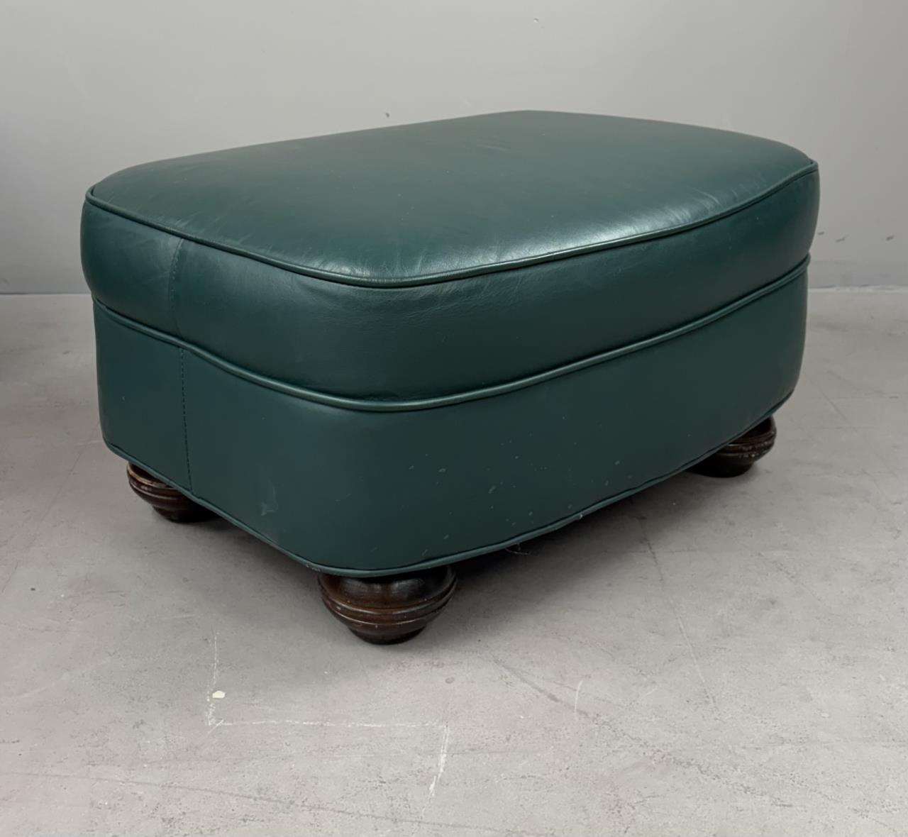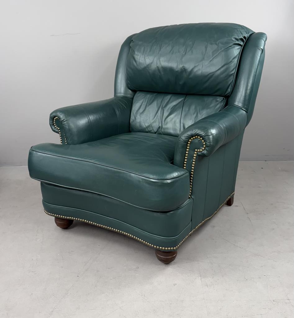 Distinction Furniture Corporation (Conover, North Carolina) traditional style club chair (approximately 43″ (D) x 36″ (W) x 37″ (H)) and matching ottoman (approximately 21″ (D) x 27-1/2″ (W) x 15″ (H)), with dark green leather upholstery, exposed brass nailheads, and bun feet.