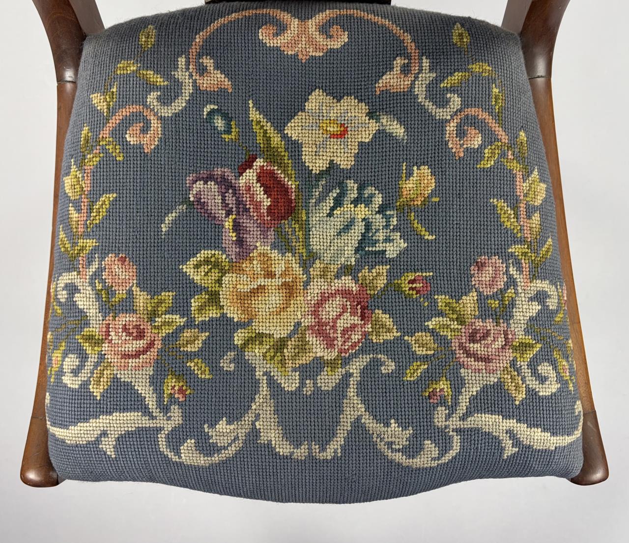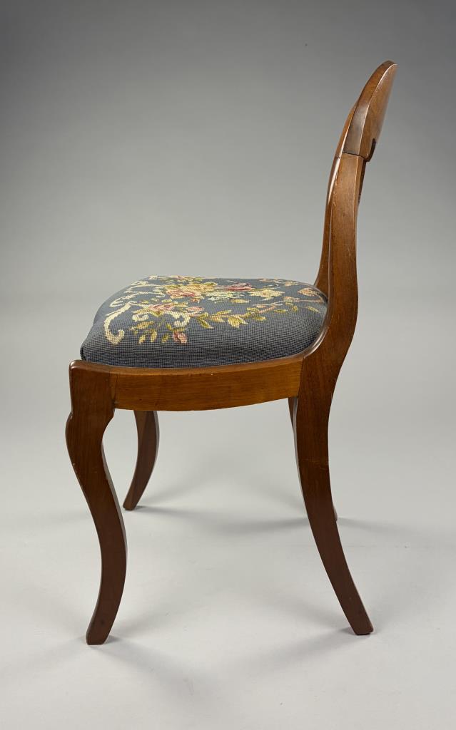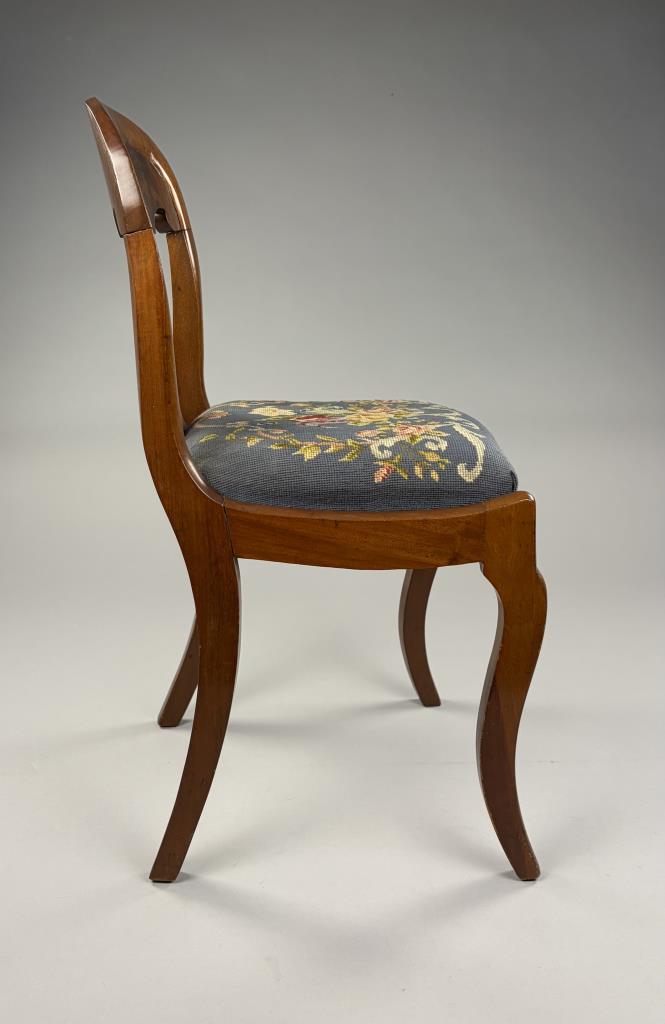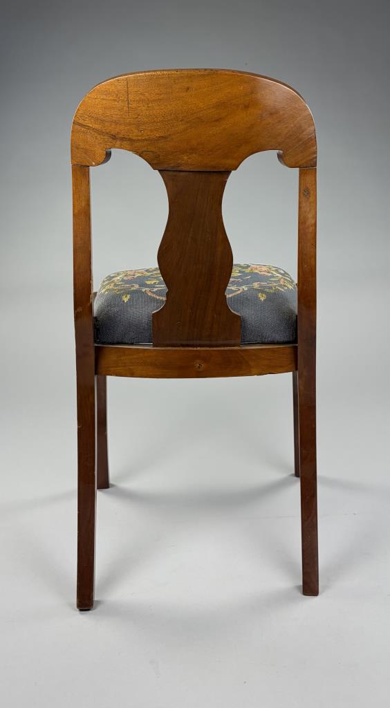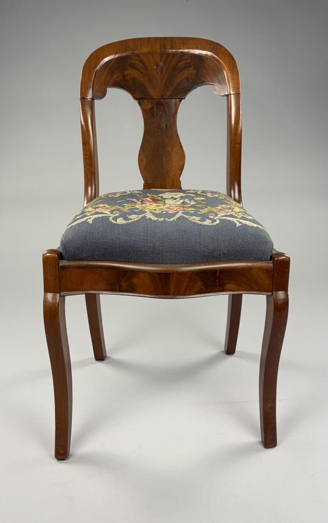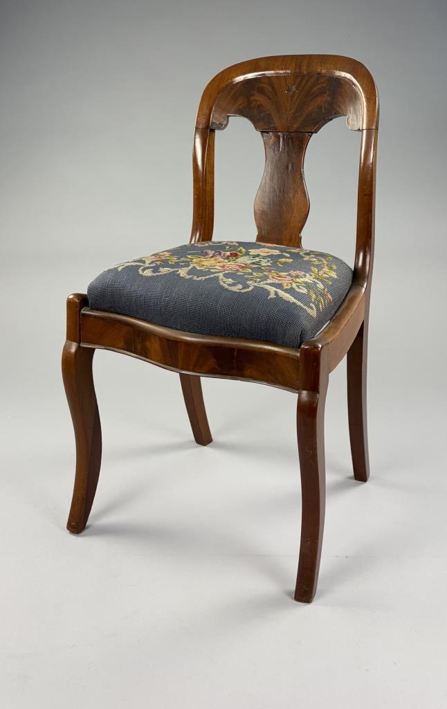 American Empire fiddleback side chair, mahogany and flame mahogany veneer, with later needlepoint upholstery on slip seat, circa 1830s / 1840s, 32-1/4″ (H).