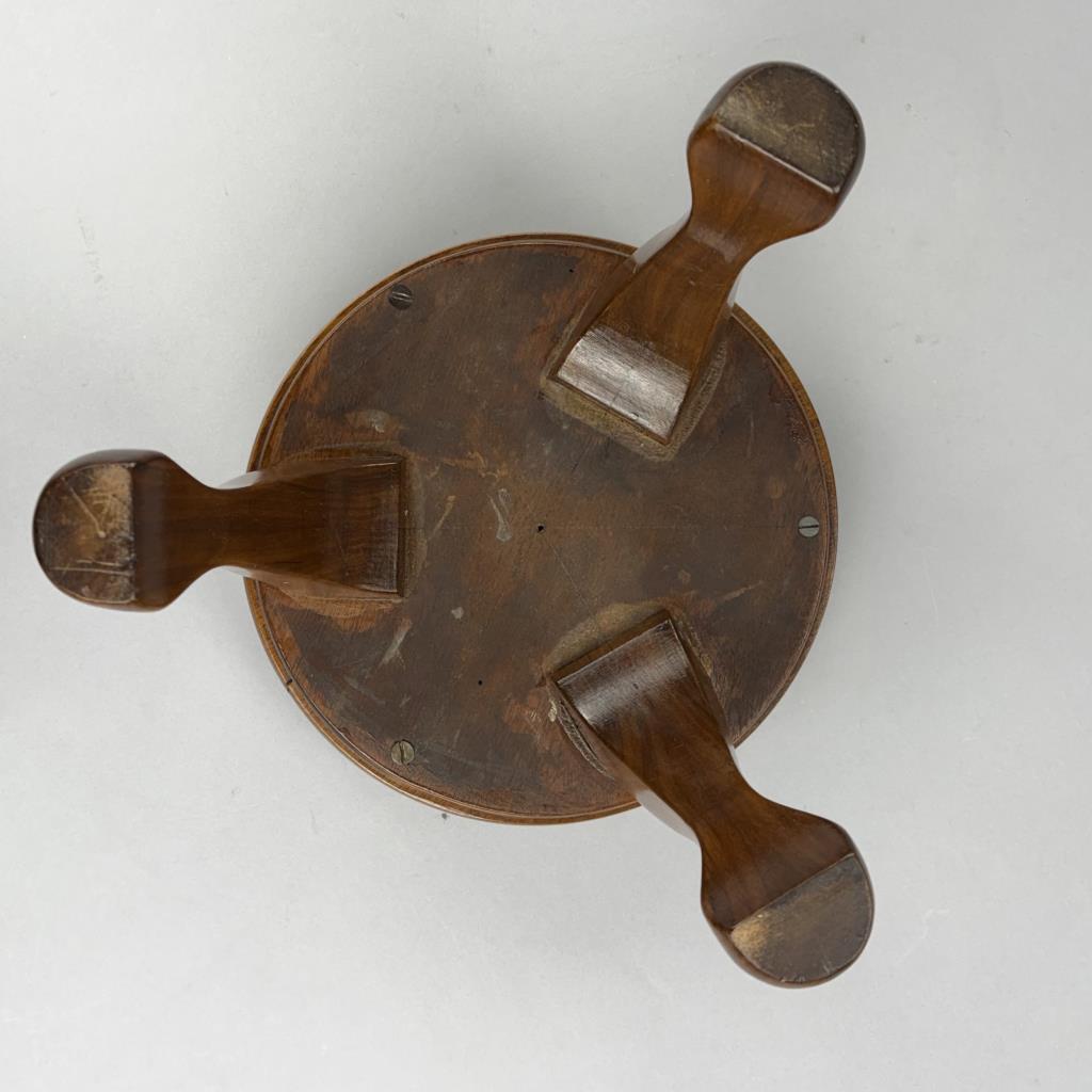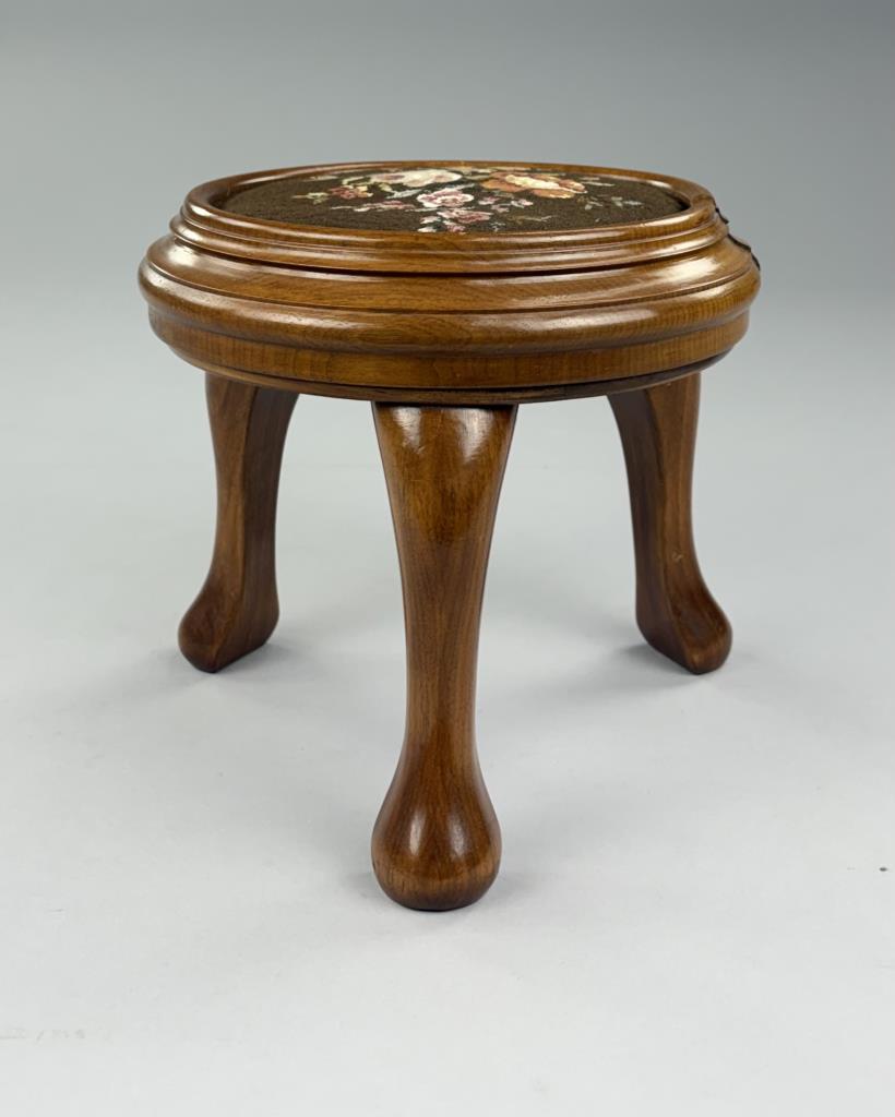 Queen Anne style round footstool, with three cabriole legs and petit point first upholstery, 20th Century, 11″ x 10″.