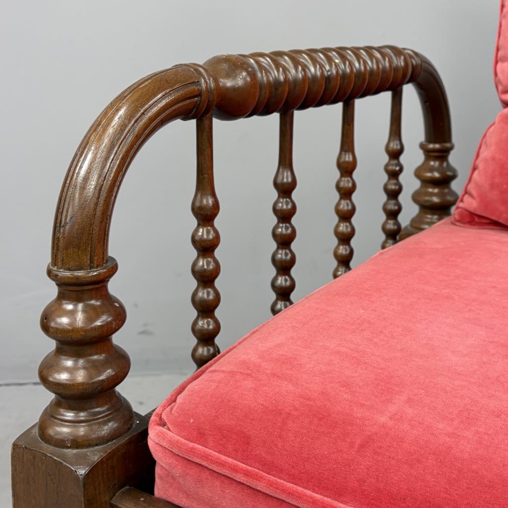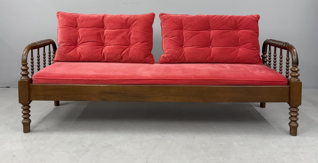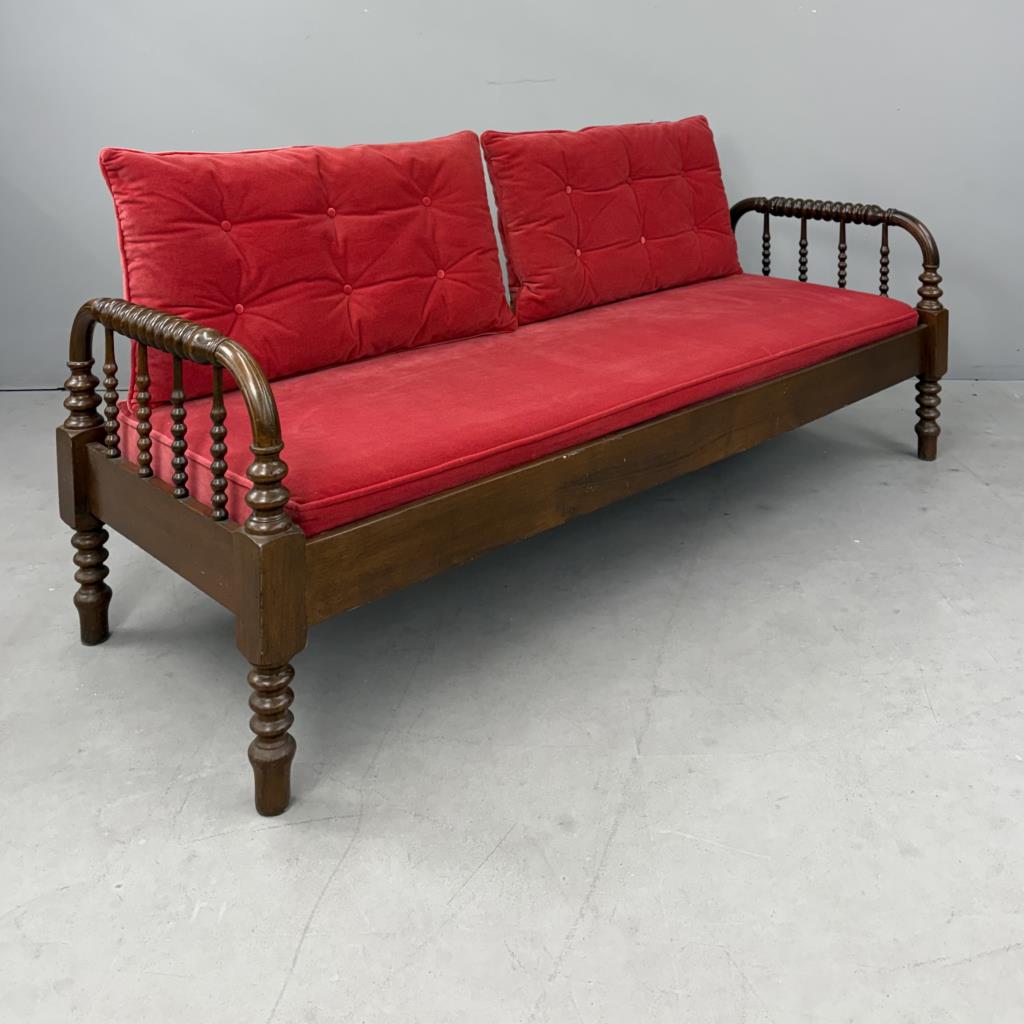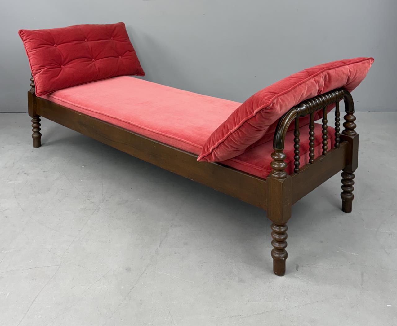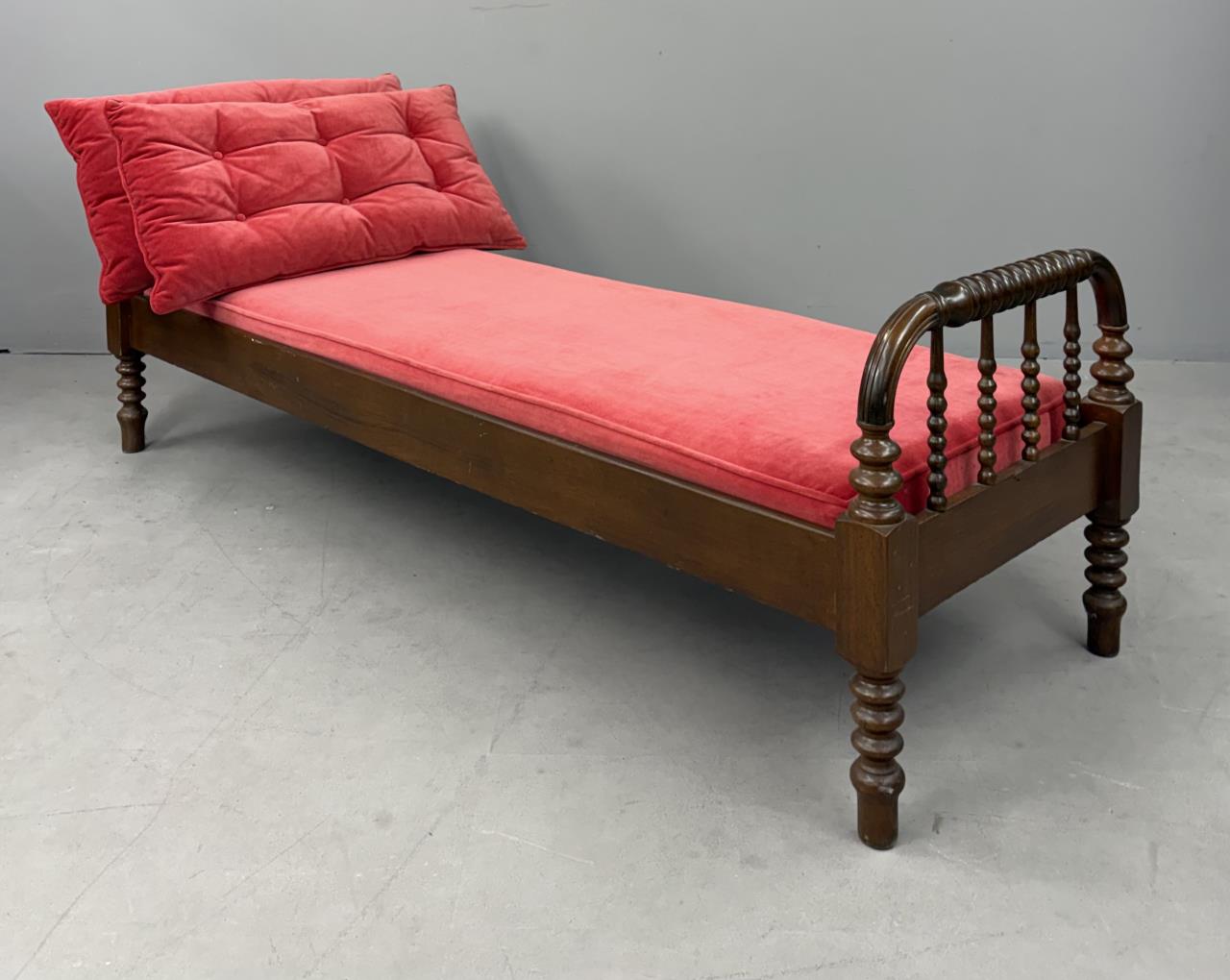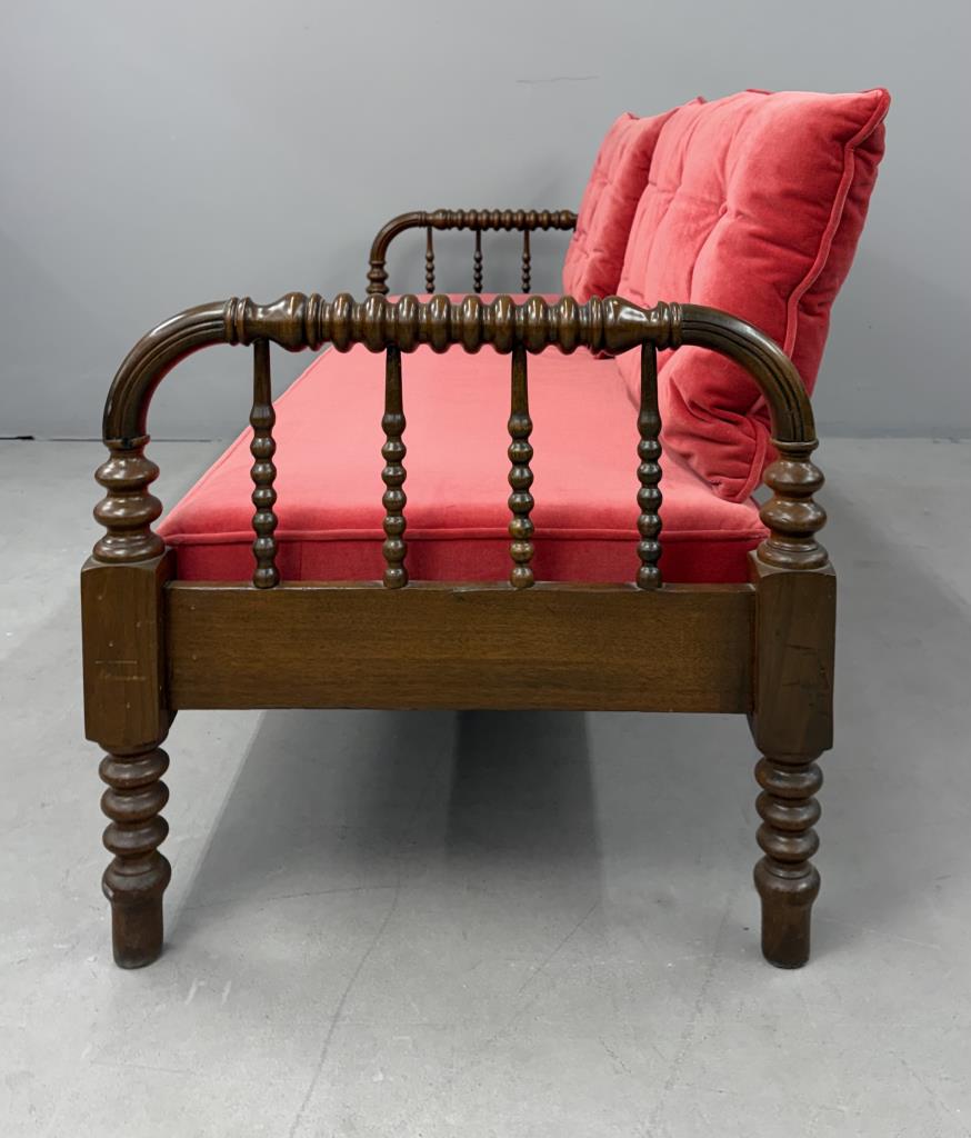 Antique American Victorian Era, Jenny Lind style, spool turned, hired man’s day bed, with a custom upholstered red velvet deck cushion and two matching tufted back pillows, black walnut, last quarter of the 19th Century, 26-1/4″ x 74-1/8″ x 24″.