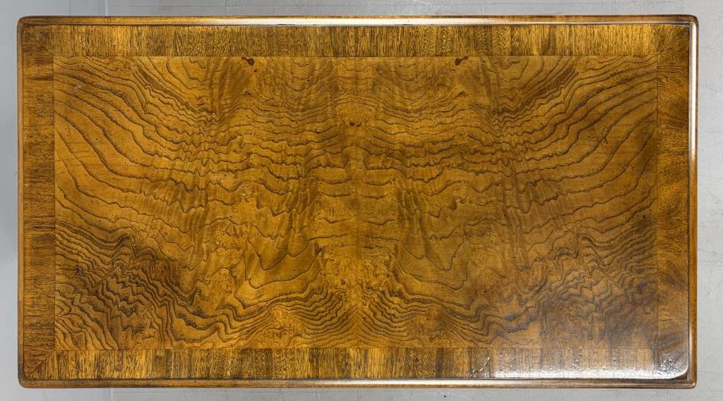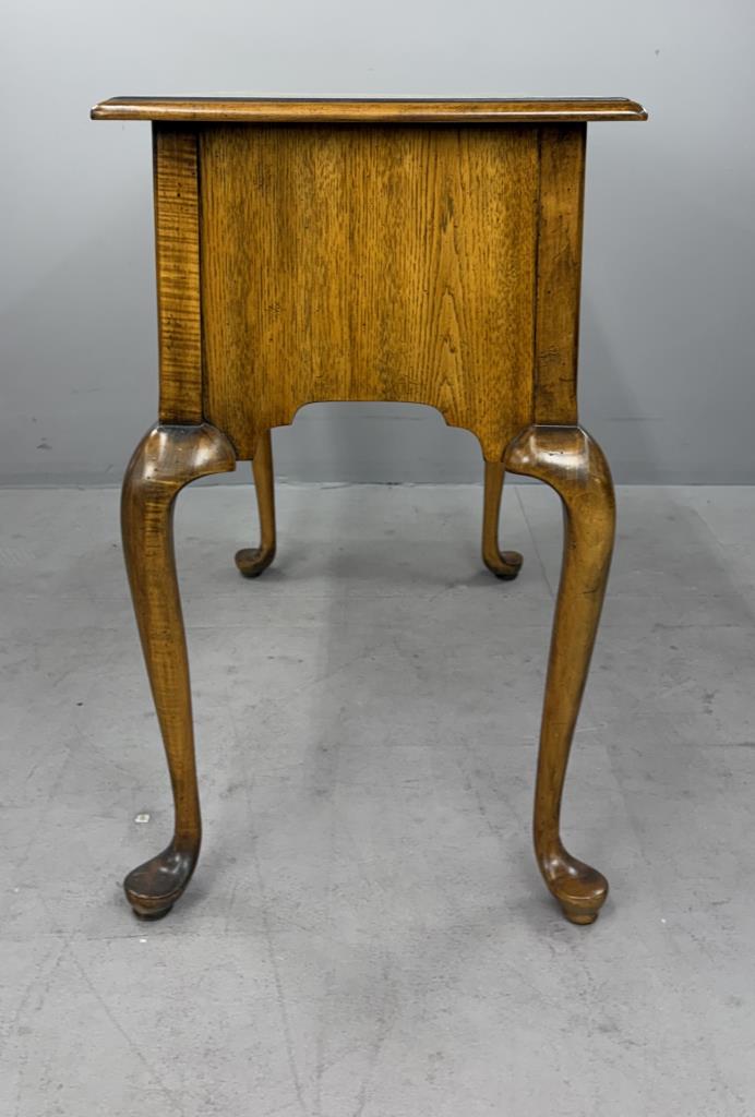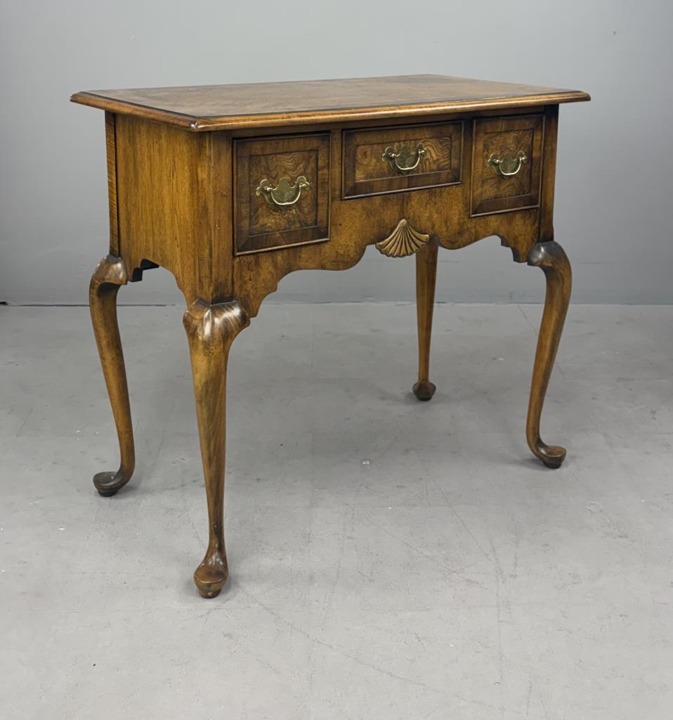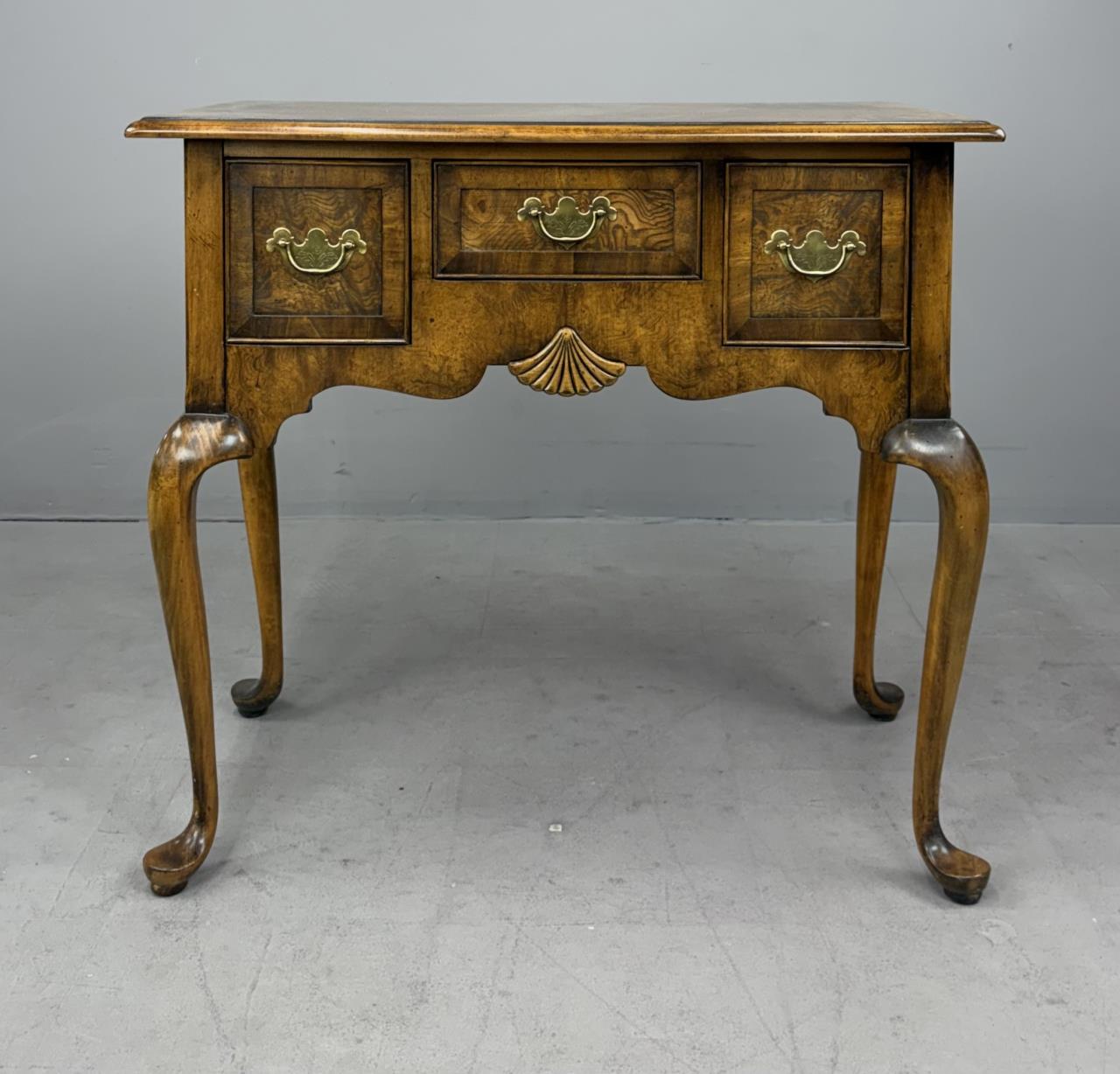 William and Mary style lowboy, three cockbeaded drawers with engraved brass pulls, shell carving on skirt, and cabriole legs with pad feet, burlwood, attributed to Hekman (Grand Rapids, Michigan), 18″ x 32-1/2″ x 29″.