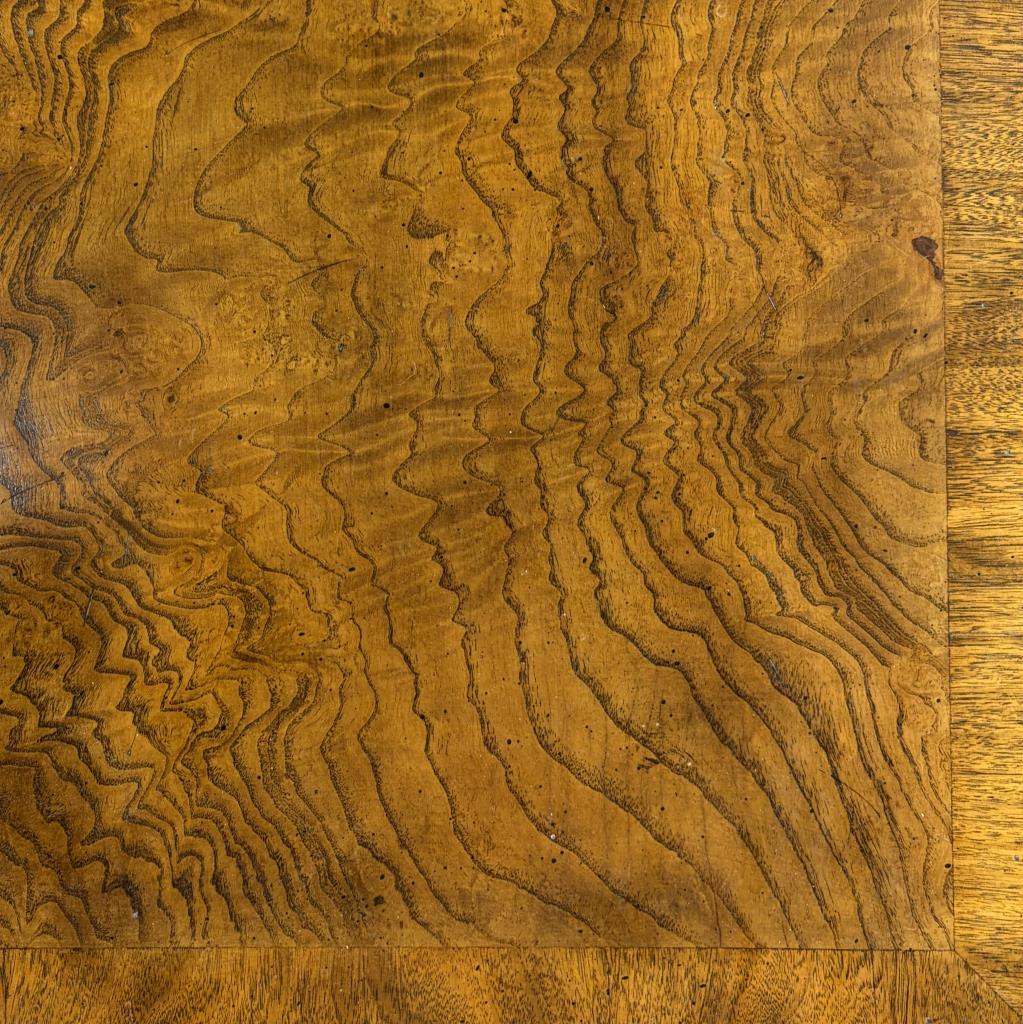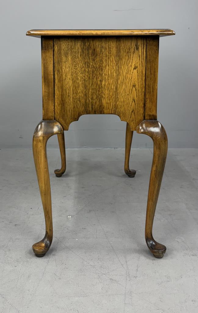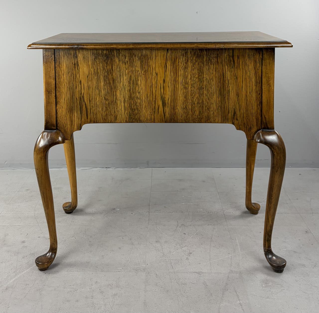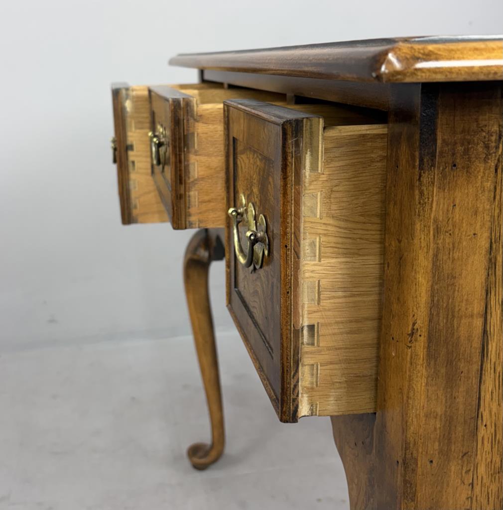 William and Mary style lowboy, three cockbeaded drawers with engraved brass pulls, shell carving on skirt, and cabriole legs with pad feet, burlwood, attributed to Hekman (Grand Rapids, Michigan), 18″ x 32-1/2″ x 29″.