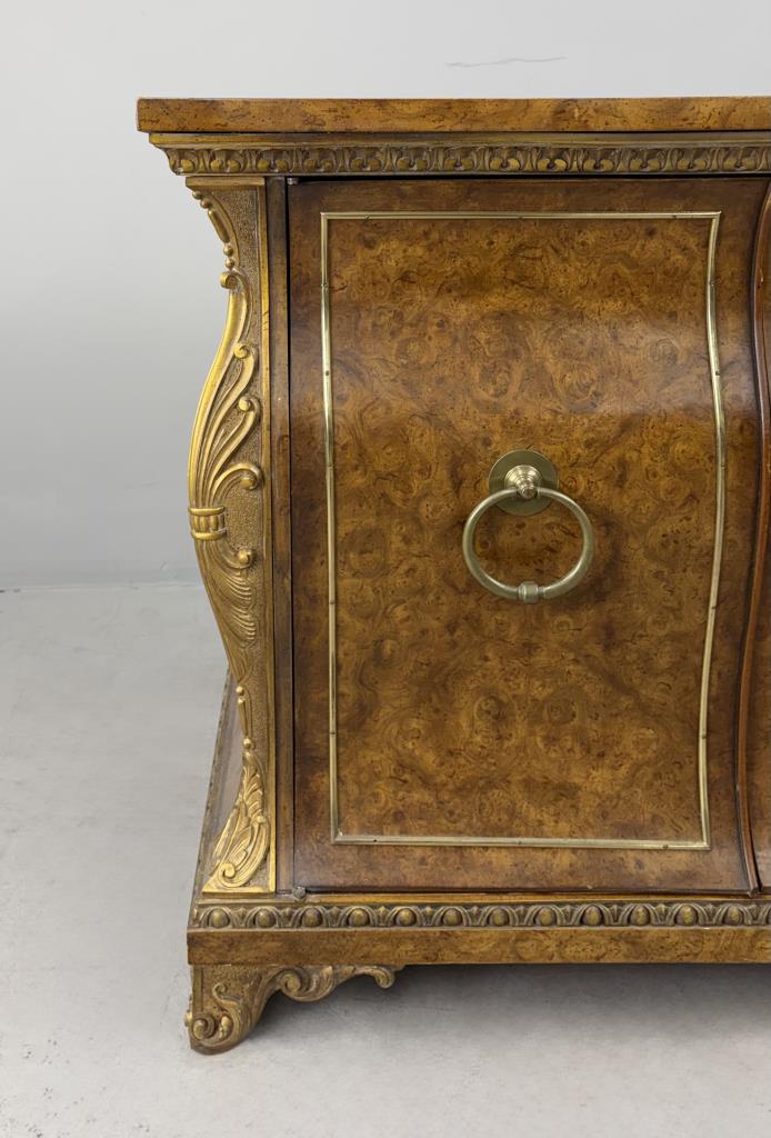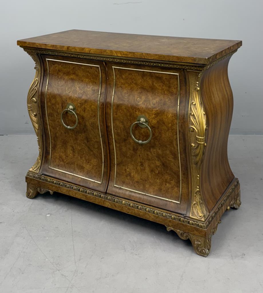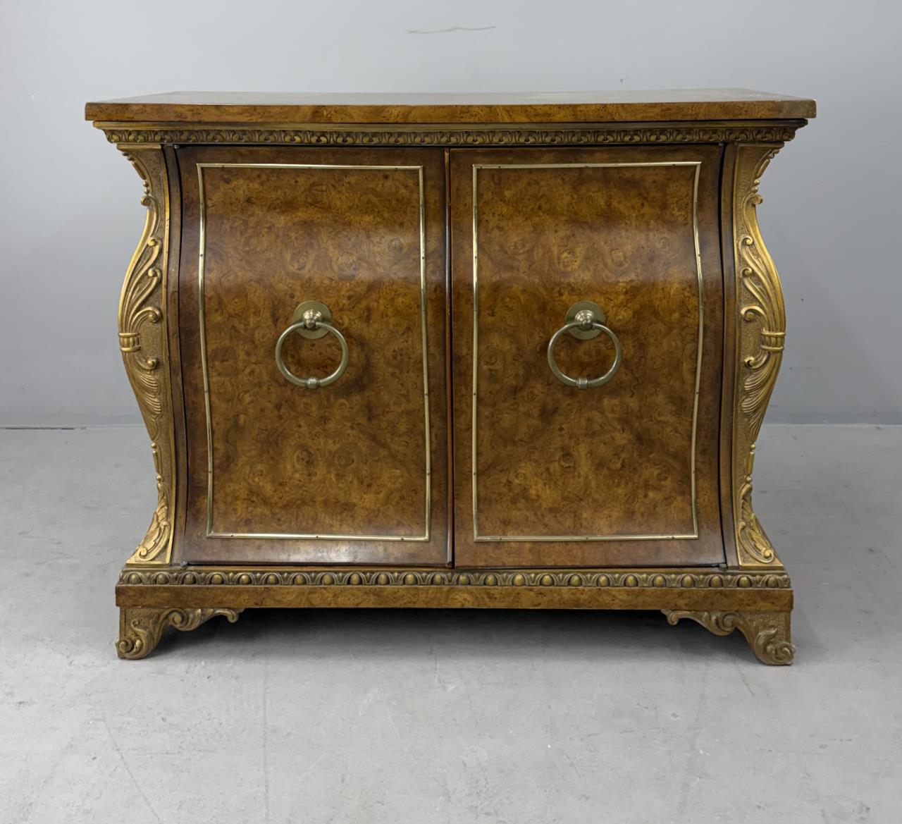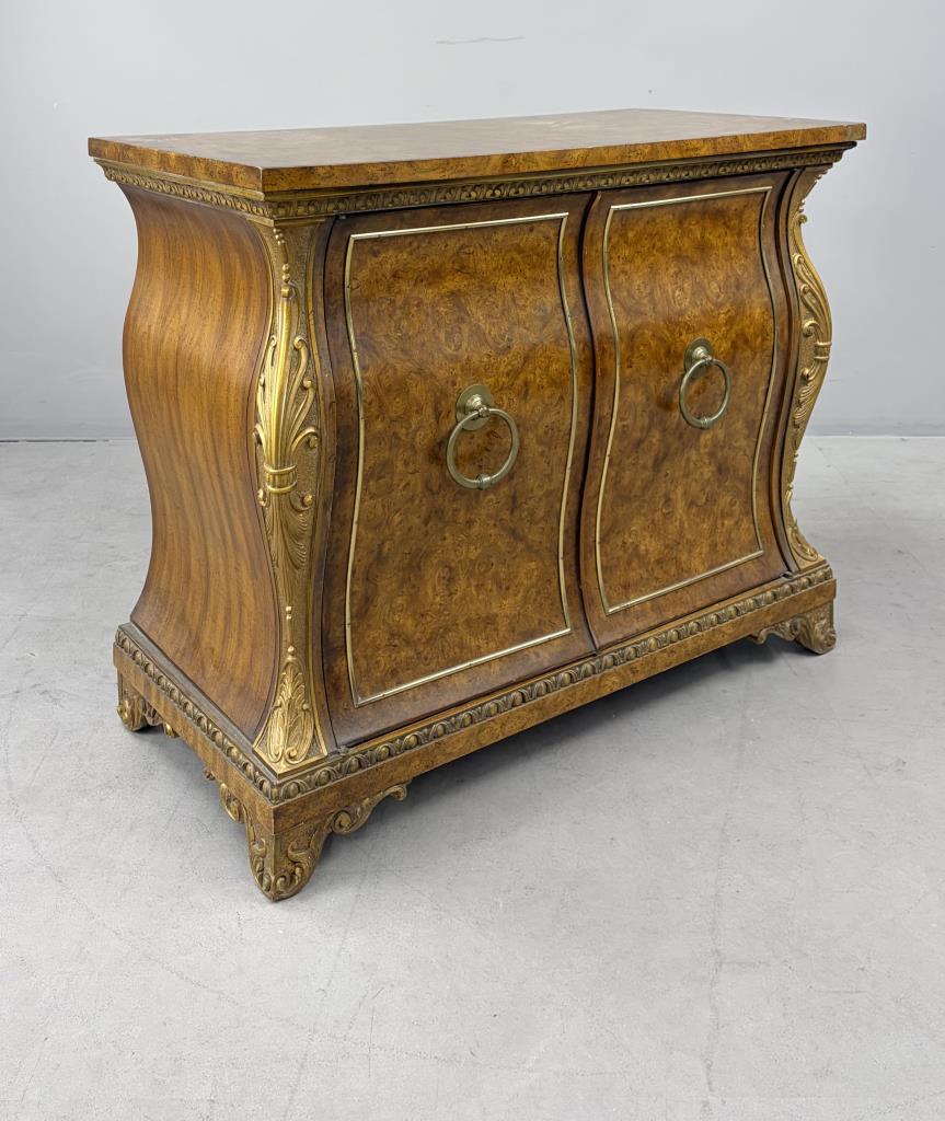 Mid Century Modern bombe style cabinet or server, with two doors with brass ring pulls and ormolu trim, burlwood with carved gilt wood accents, circa 1960s, 19″ x 40″ x 31-3/4″.