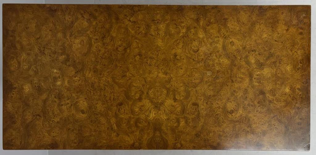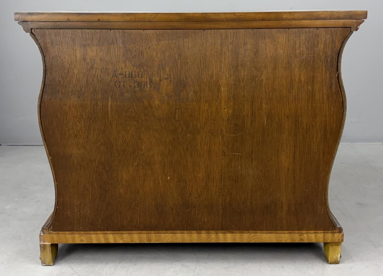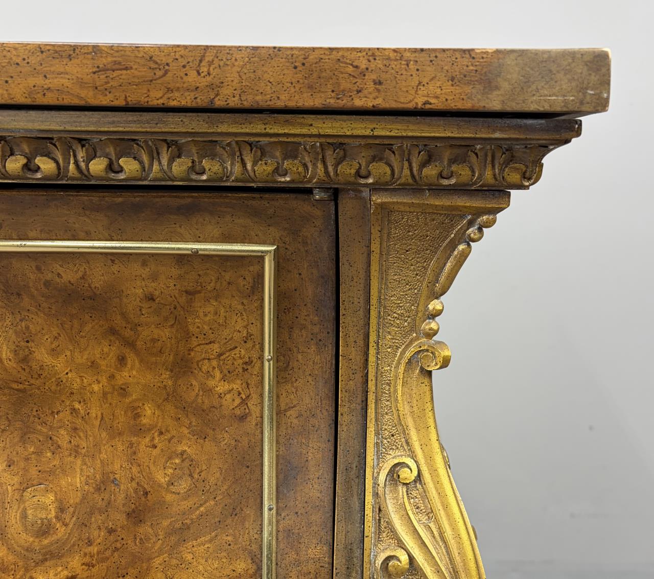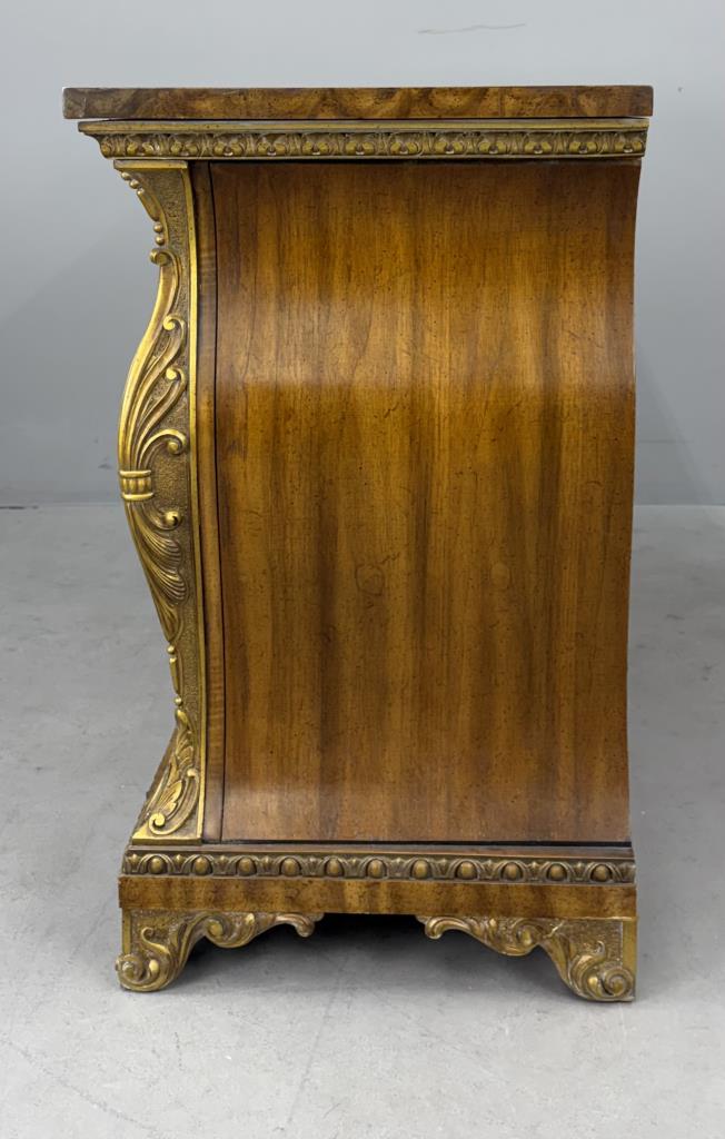 Mid Century Modern bombe style cabinet or server, with two doors with brass ring pulls and ormolu trim, burlwood with carved gilt wood accents, circa 1960s, 19″ x 40″ x 31-3/4″.