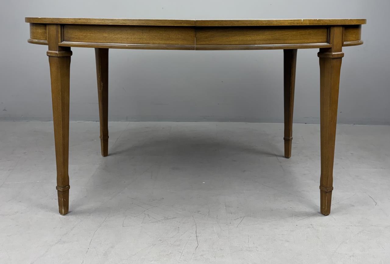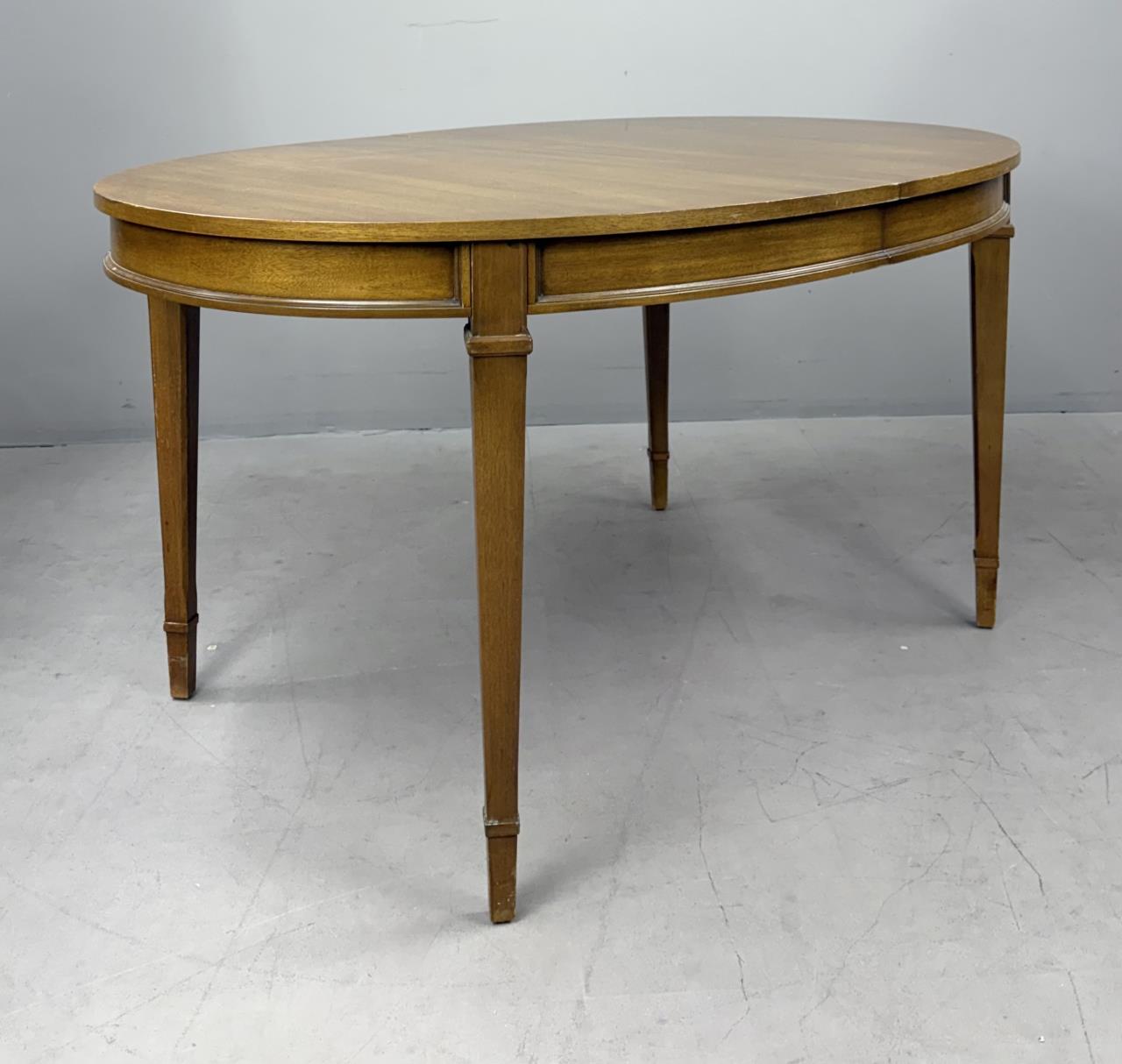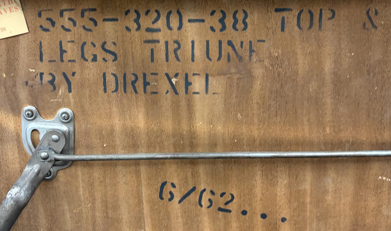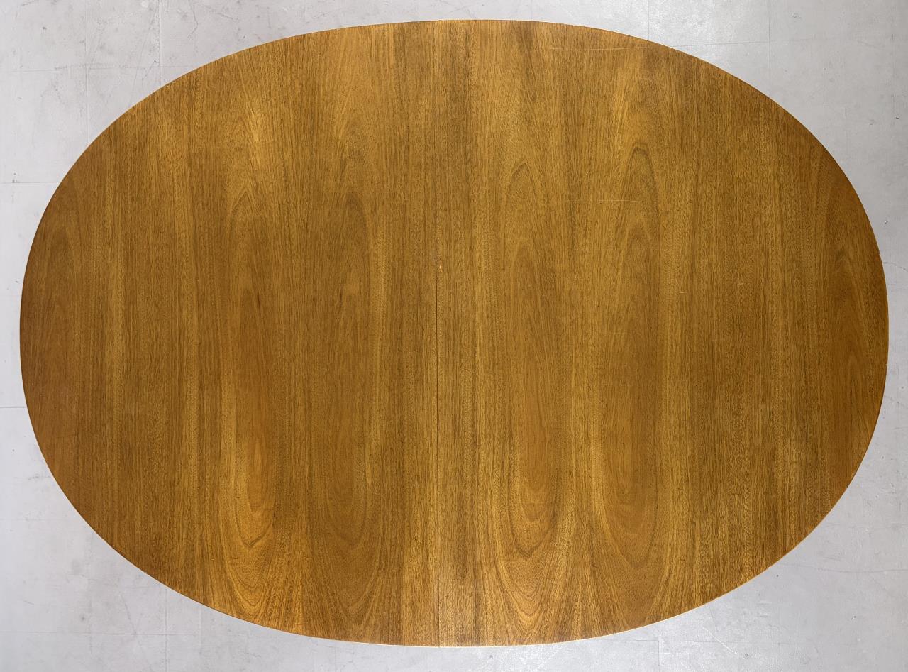 Drexel Furniture Company (Drexel, North Carolina), Mid Century Modern oval dining table, from the “Triune” collection, which was in production between 1958 and 1968, identified on back as well as possibly dated “6/62″, mahogany, 56″ x 40″ with (3) 12” leaves and table pads.