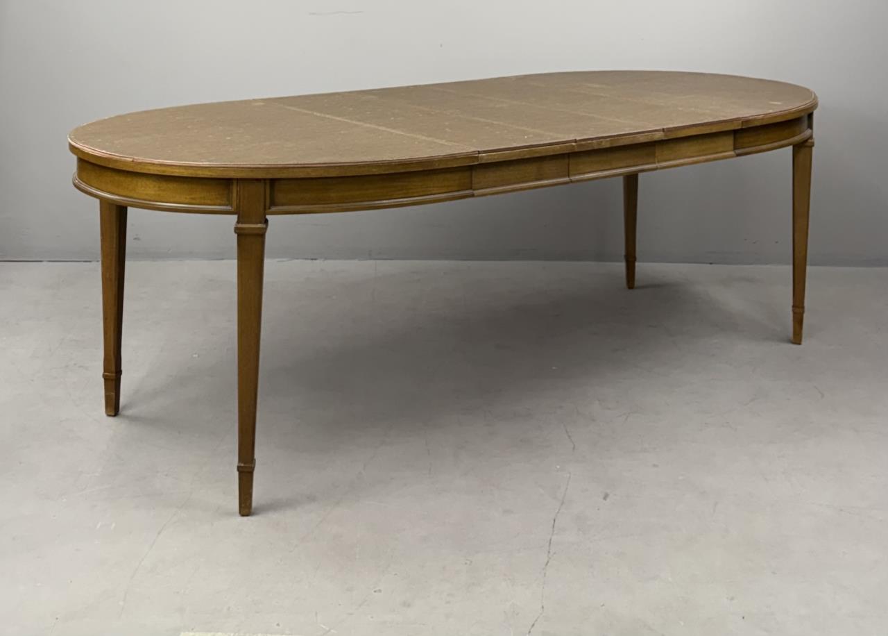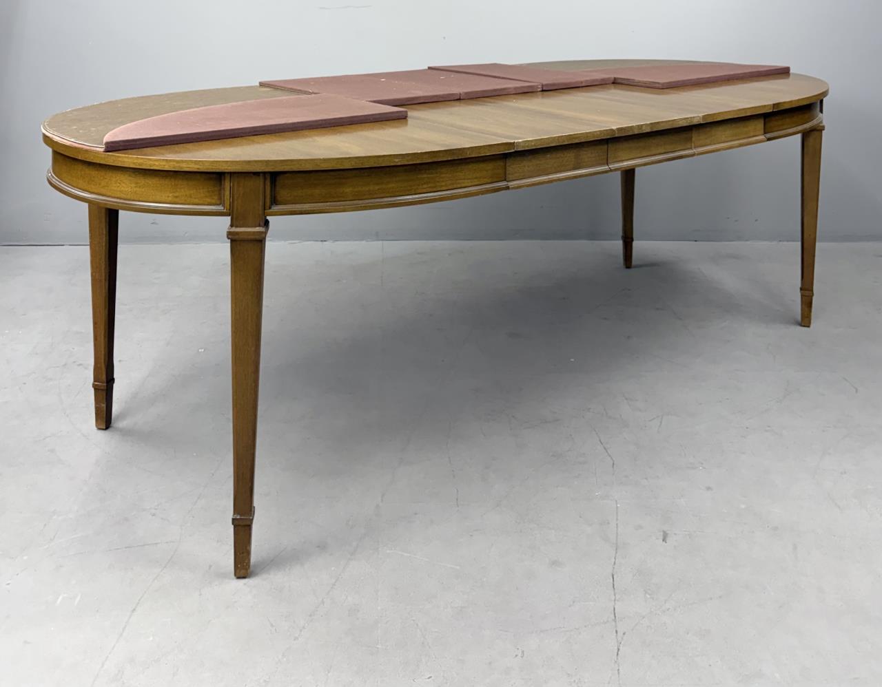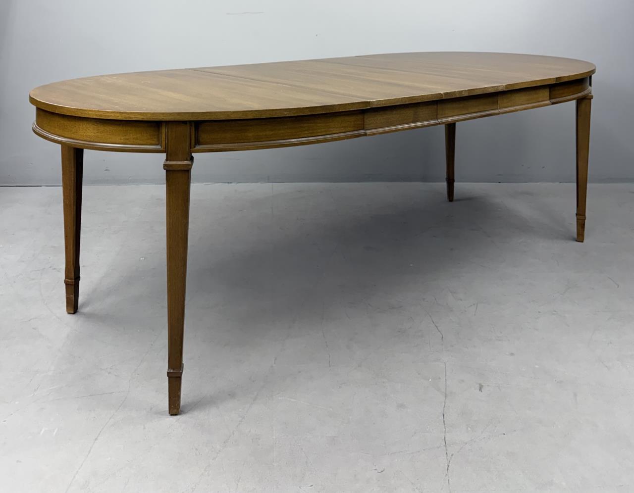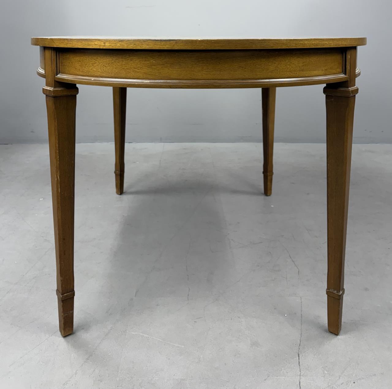 Drexel Furniture Company (Drexel, North Carolina), Mid Century Modern oval dining table, from the “Triune” collection, which was in production between 1958 and 1968, identified on back as well as possibly dated “6/62″, mahogany, 56″ x 40″ with (3) 12” leaves and table pads.