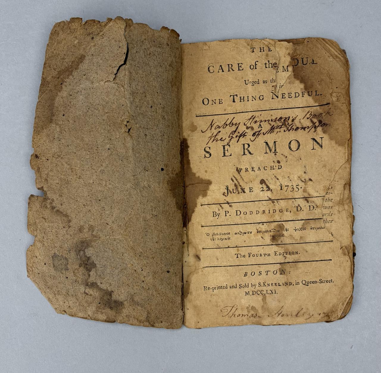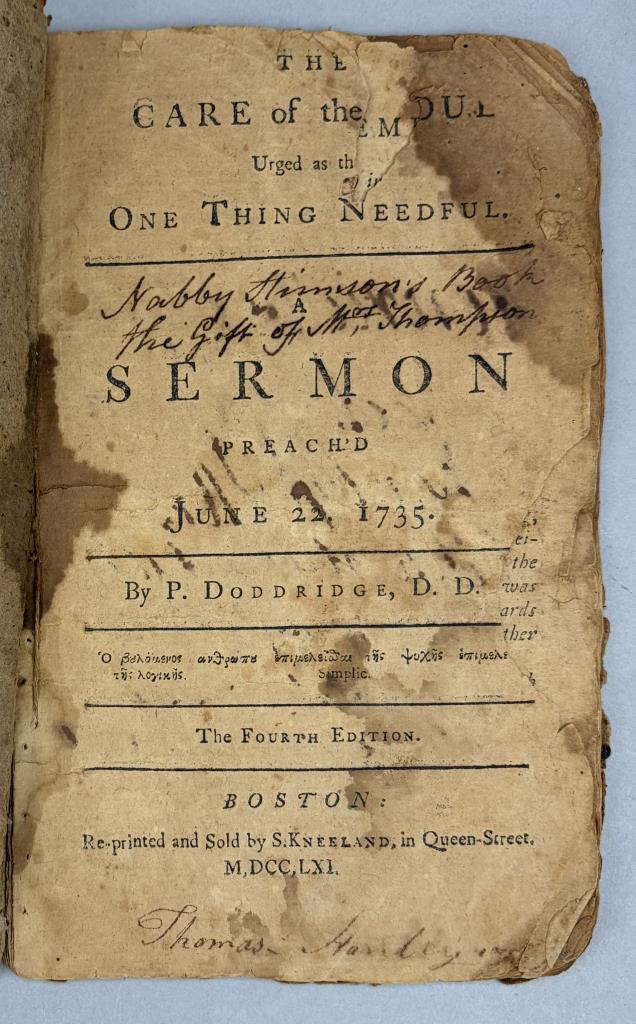 Colonial America Great Awakening sermon pamphlet, Phillip Doddridge (English, 1702-1751), “The Care of the Soul Urged as the One Thing Needful” (originally preached in 1735), Samuel Kneeland reprinting, Boston: 1761.