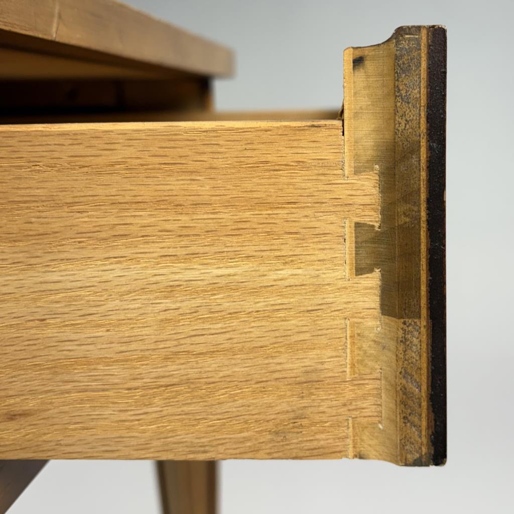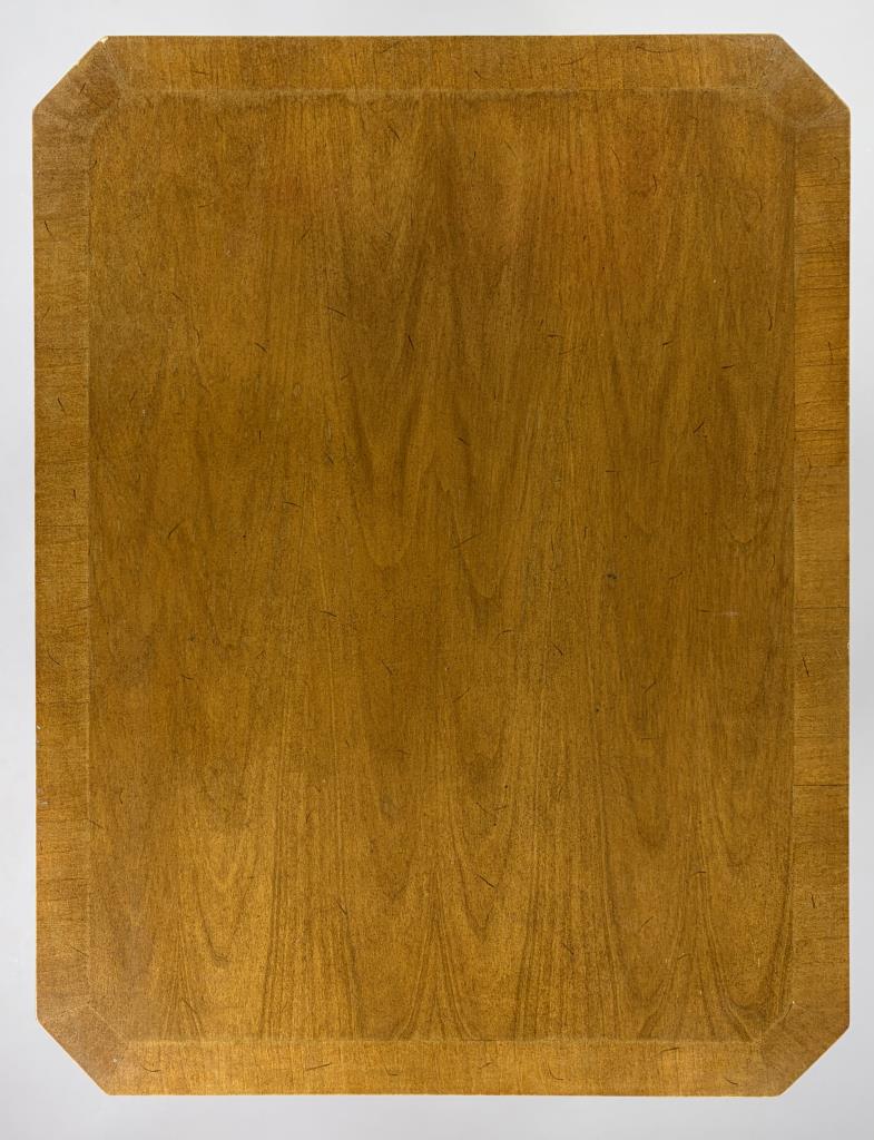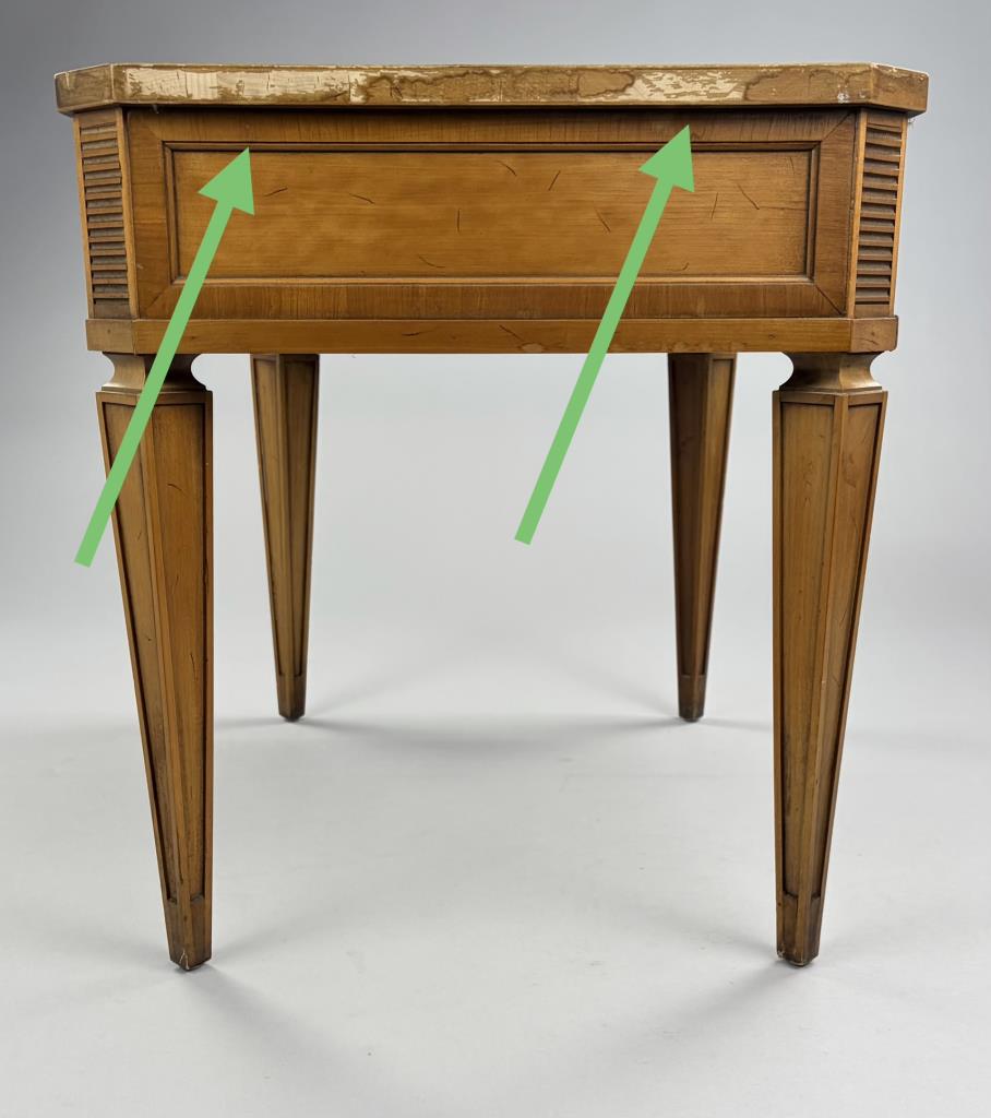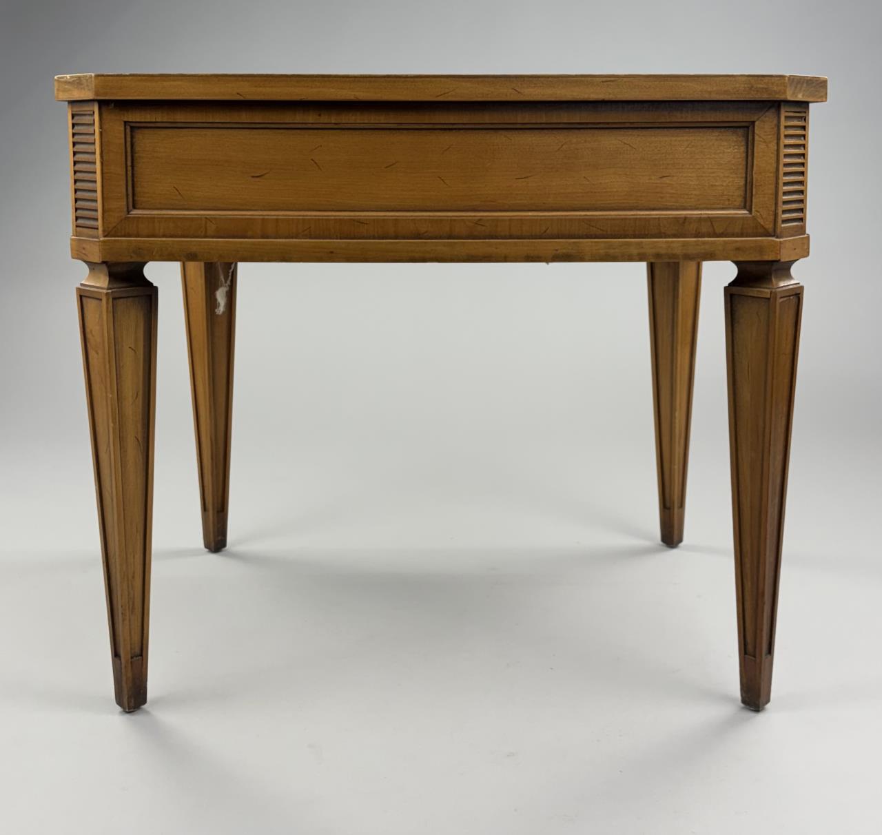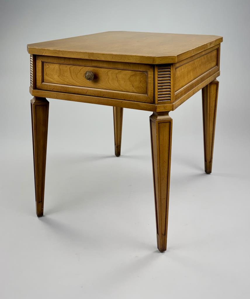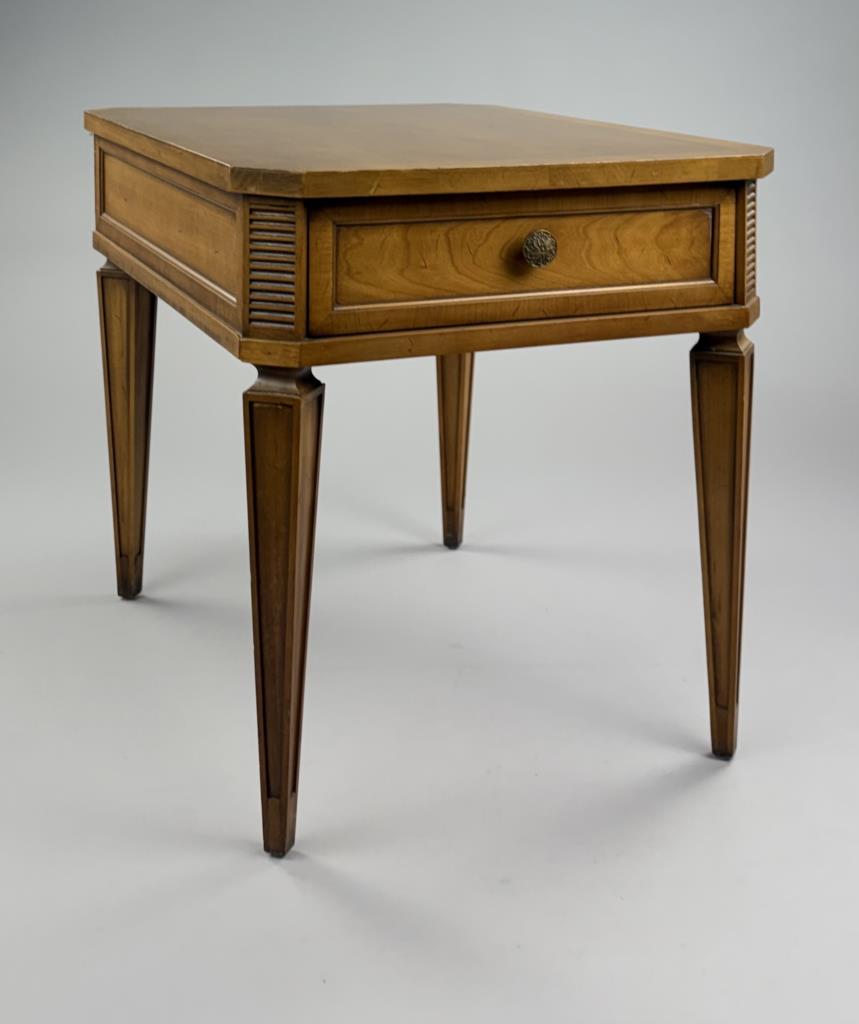 Drexel Furniture (Drexel, North Carolina), Mid-Century Modern neoclassical style single drawer end table, from the “Palazzo” collection, with horizontal ribbed corner panels and tapered legs, marked on inside and bottom of drawer, walnut, circa early to mid 1960s, 26″ x 20″ x 22-1/8″.