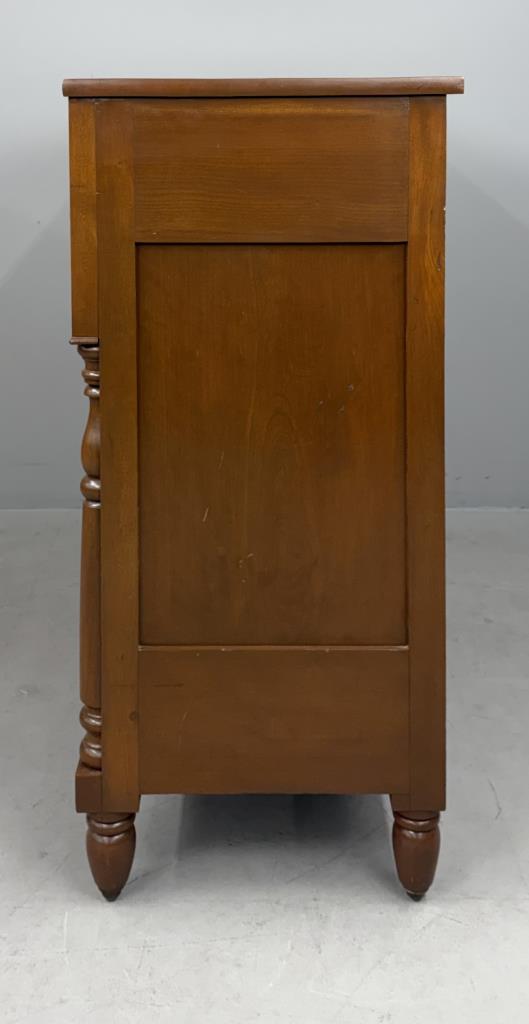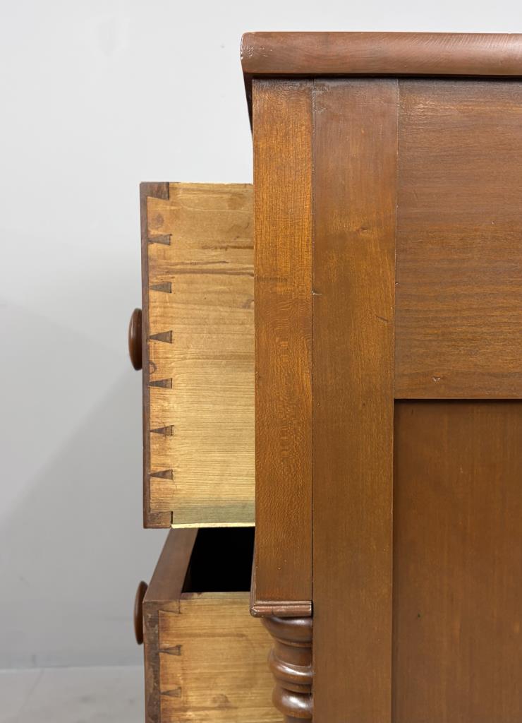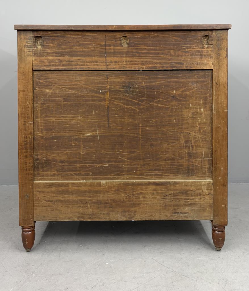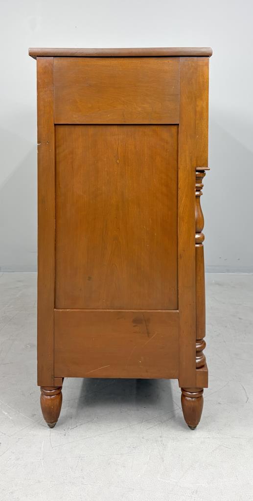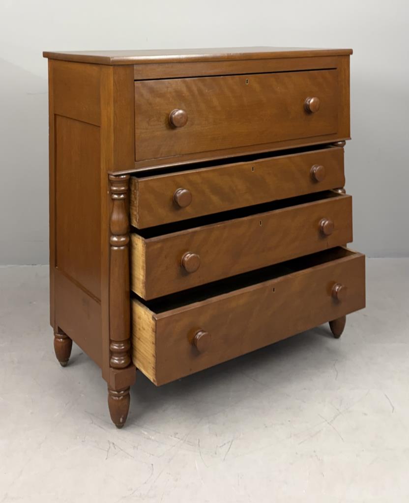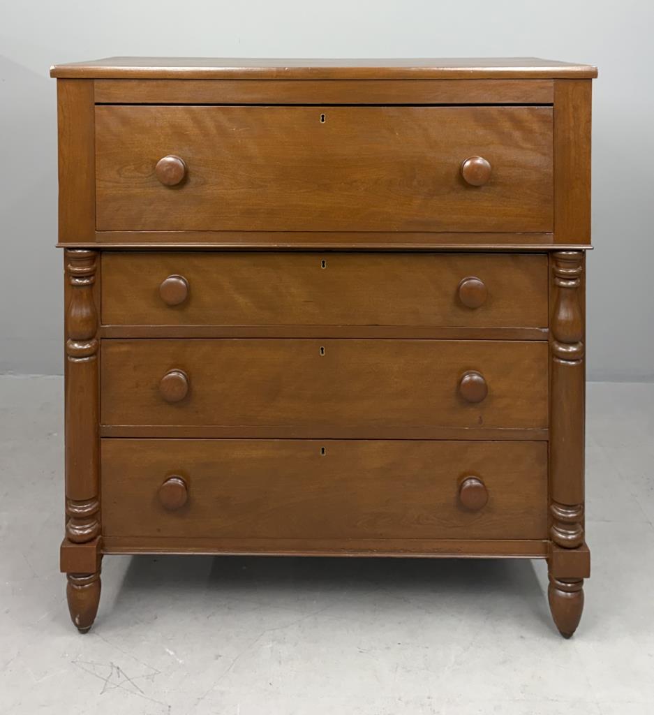 American Empire chest of drawers, with three graduated drawers under one overhang drawer supported by turned pilasters, cherry, circa 1830s – 1850s, 21-1/2″ x 42-5/8″ x 45-7/8″.