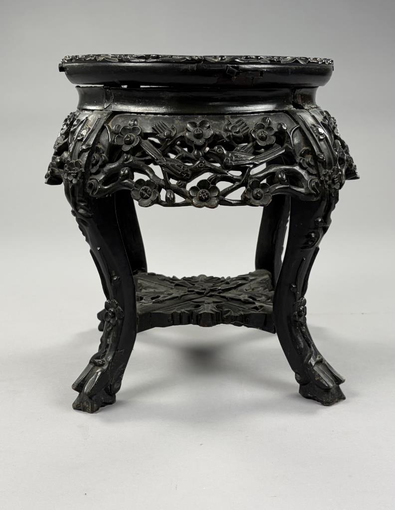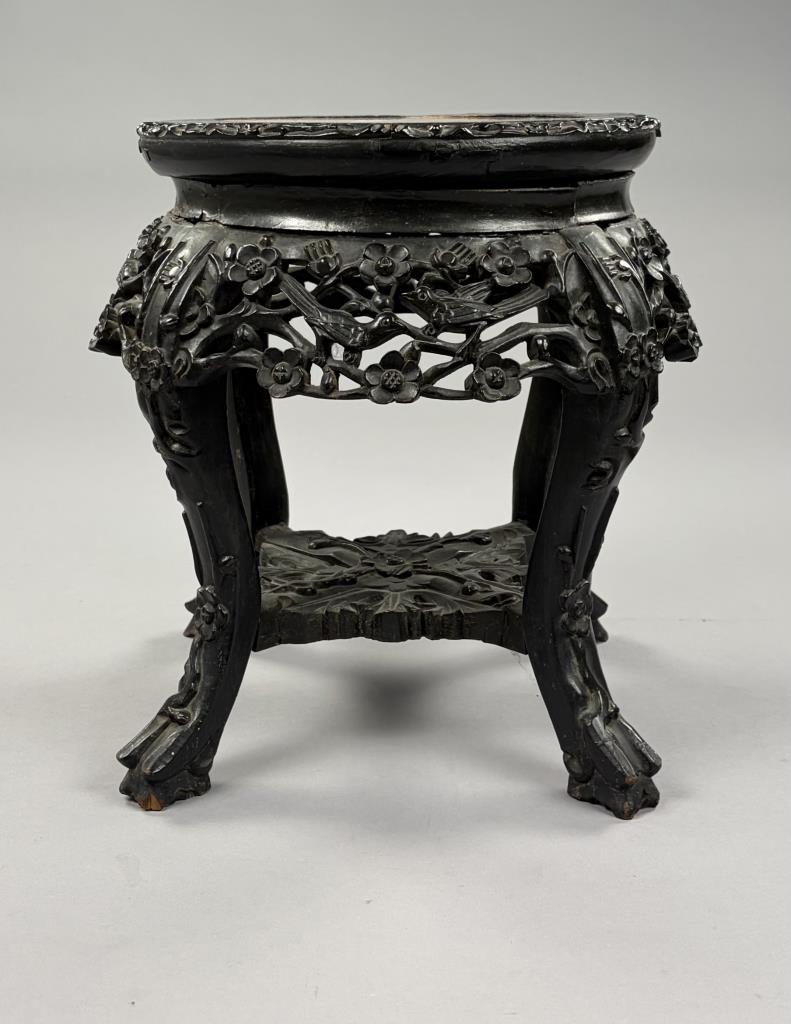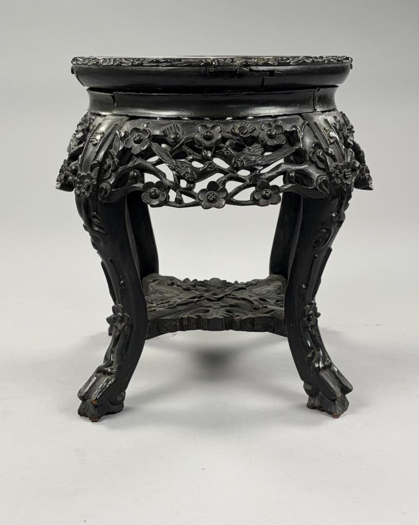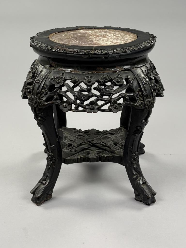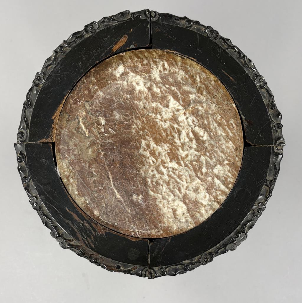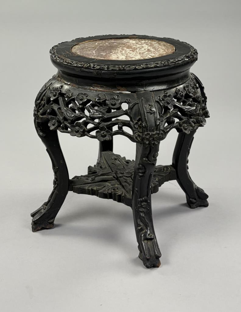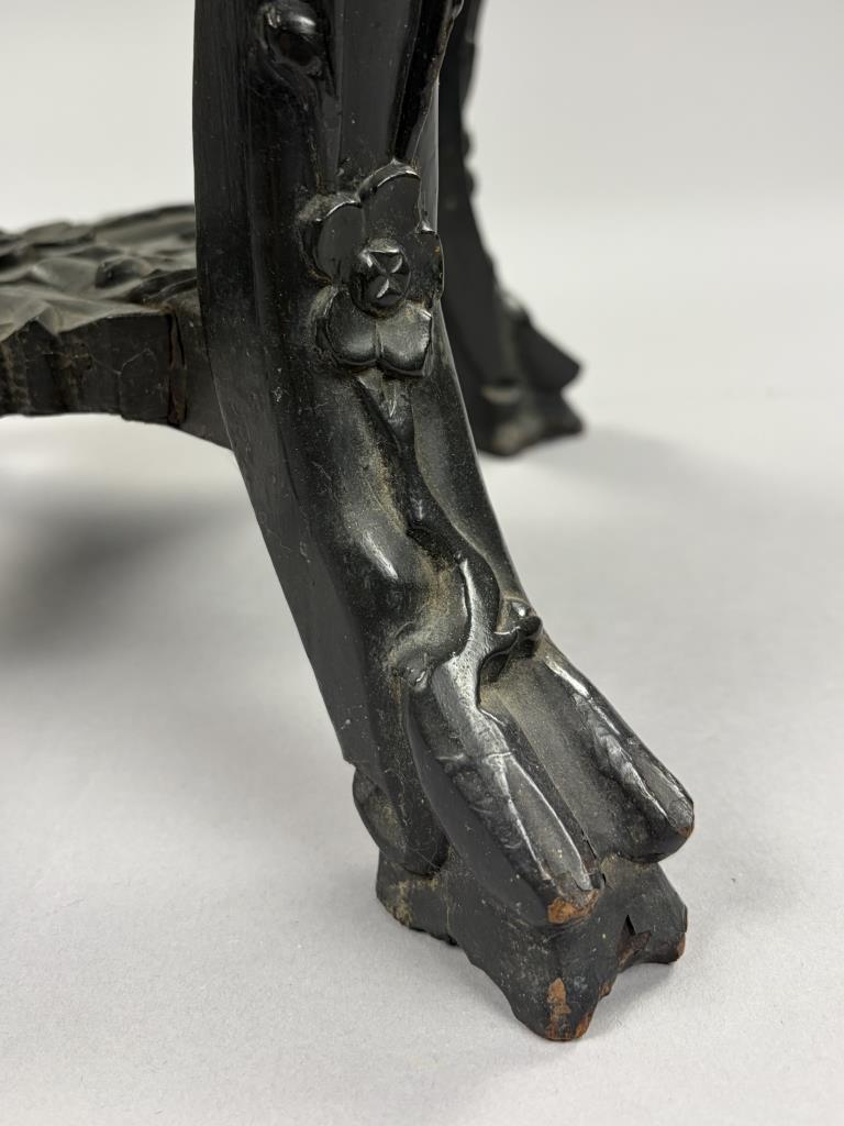 Antique Chinese carved and ebonized hardwood low table with insect rouge marble top, mortise and tenon pegged construction, late 19th / early 20th Century, 16″ (DIA) x 14-1/2″ (H).