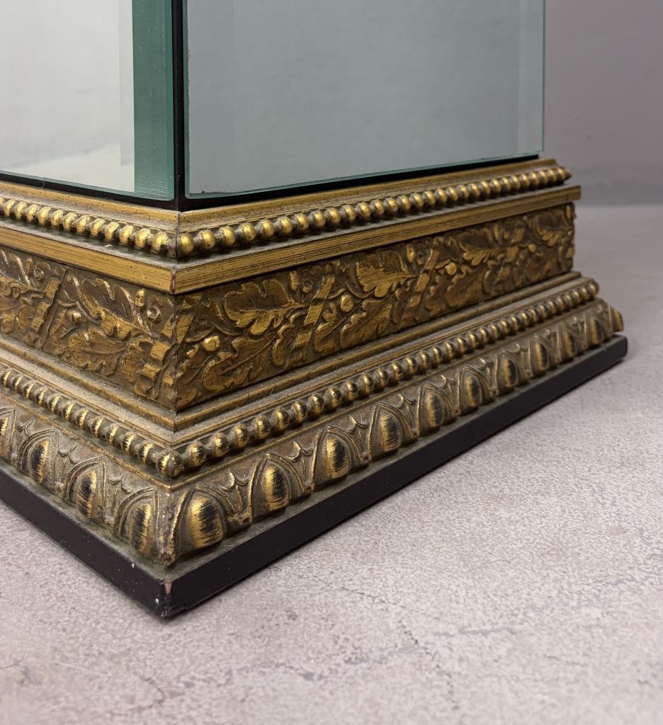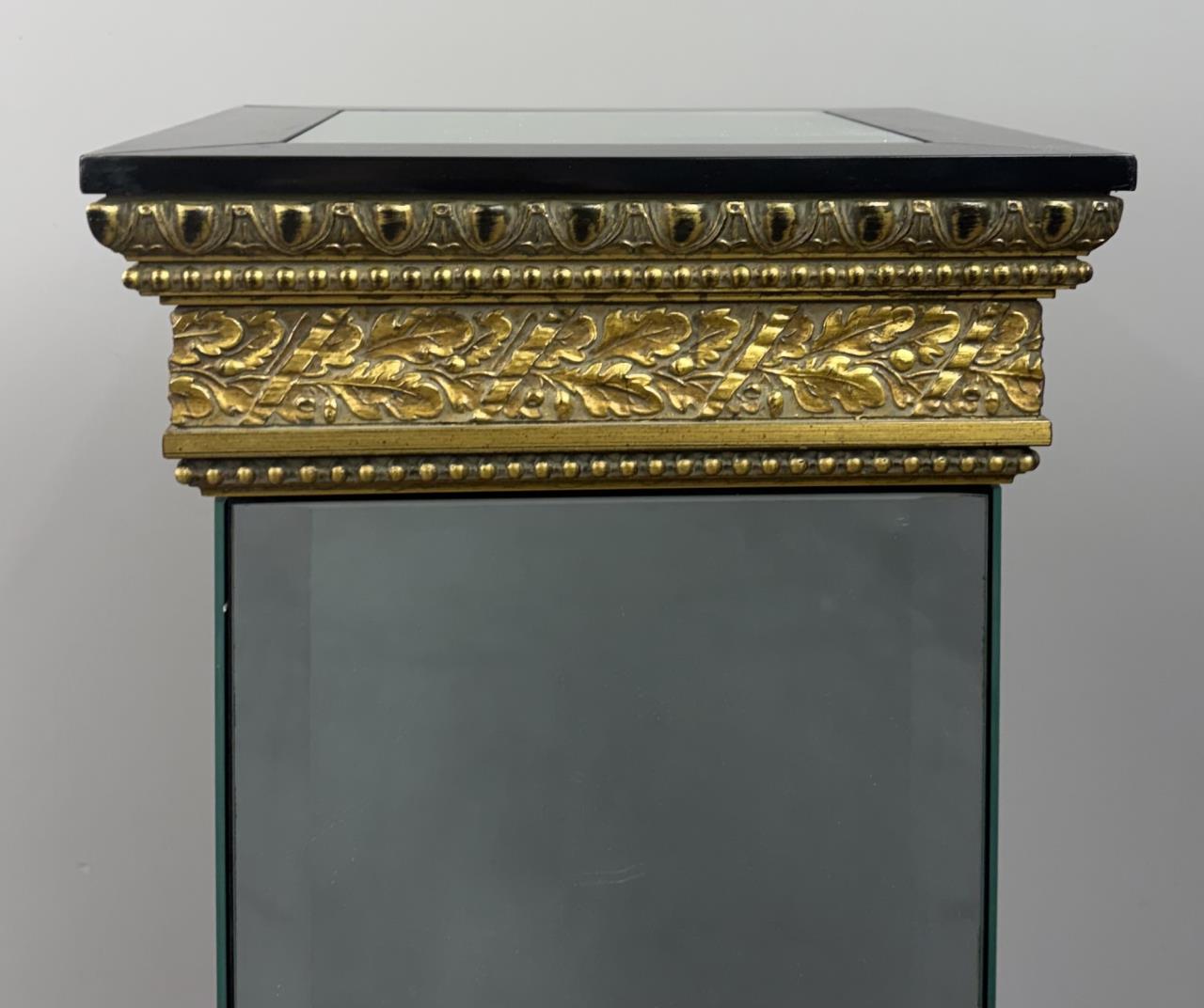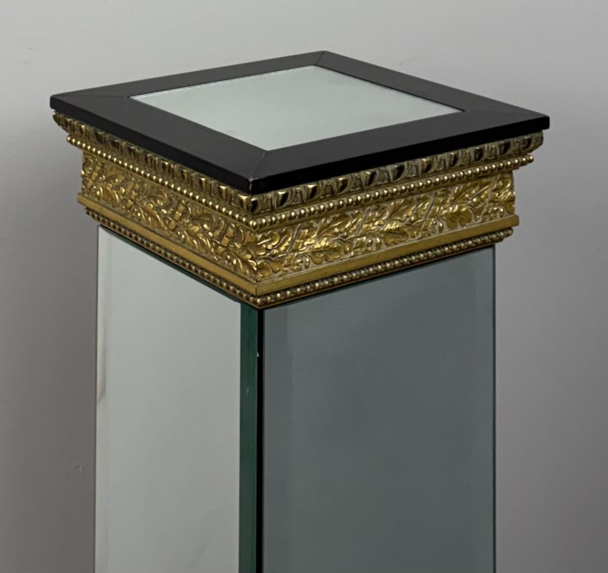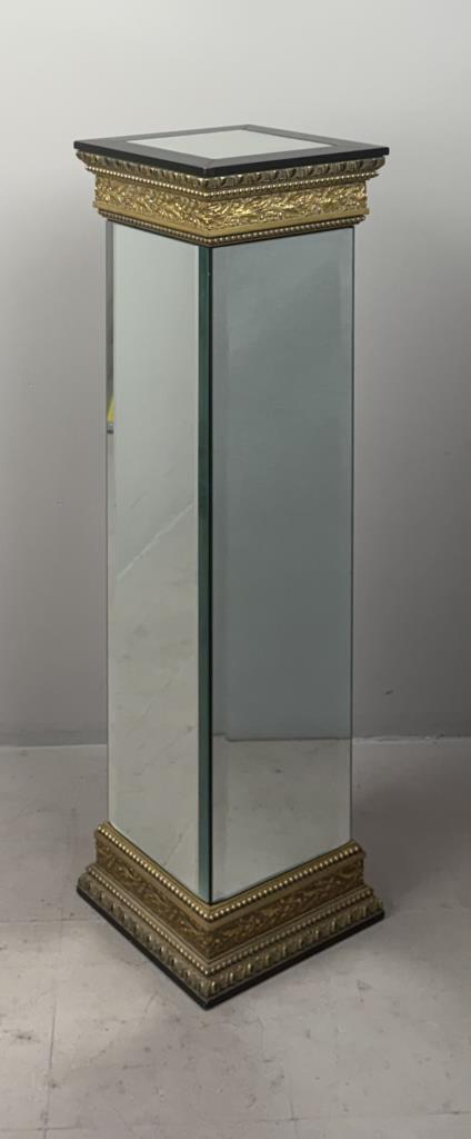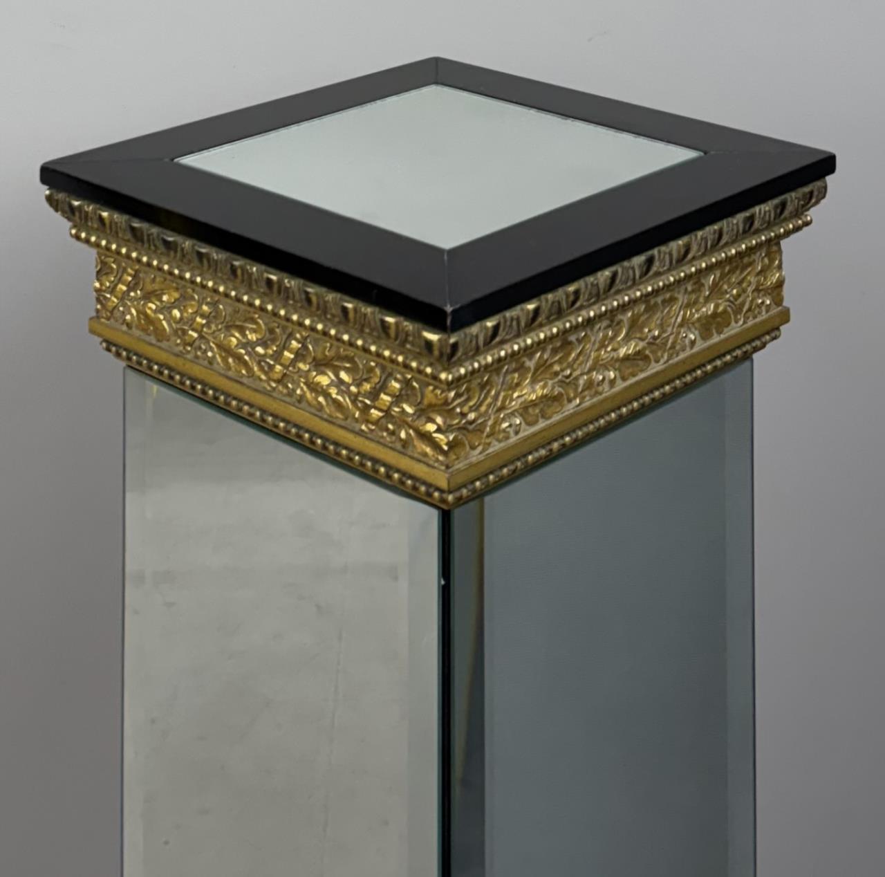 Hollywood Regency style, plinth, pedestal, or stand, bevelled mirror, gilt gesso, and ebonized wood, late 20th century,13″ x 13″ x 45-1/2″.