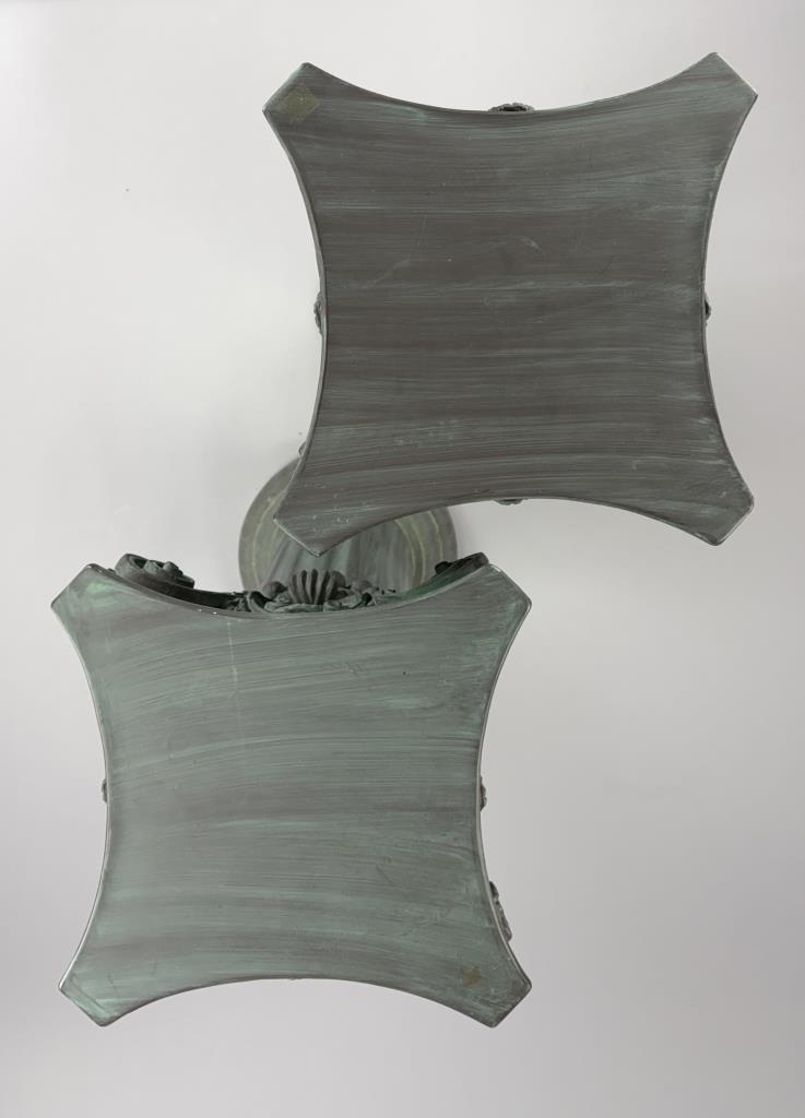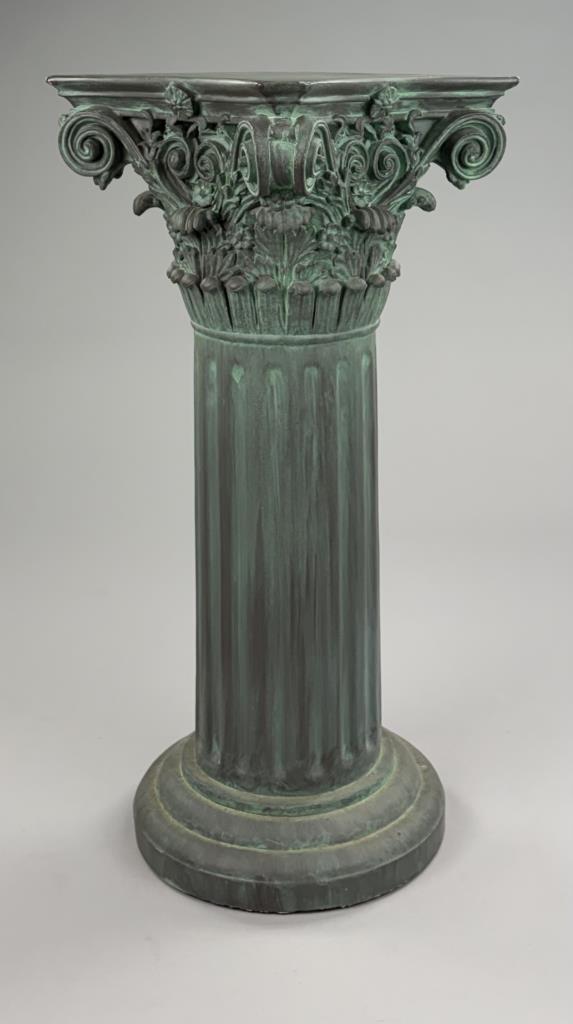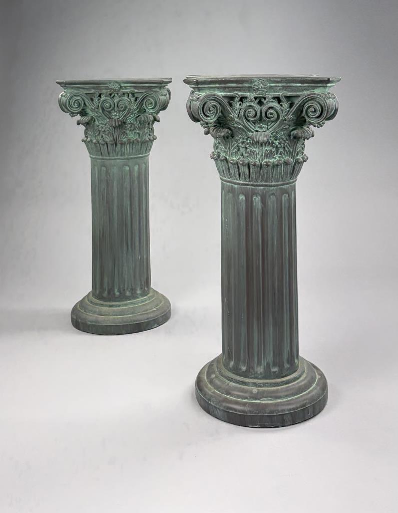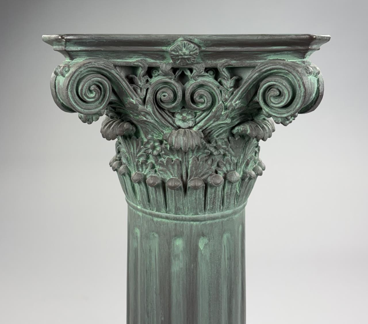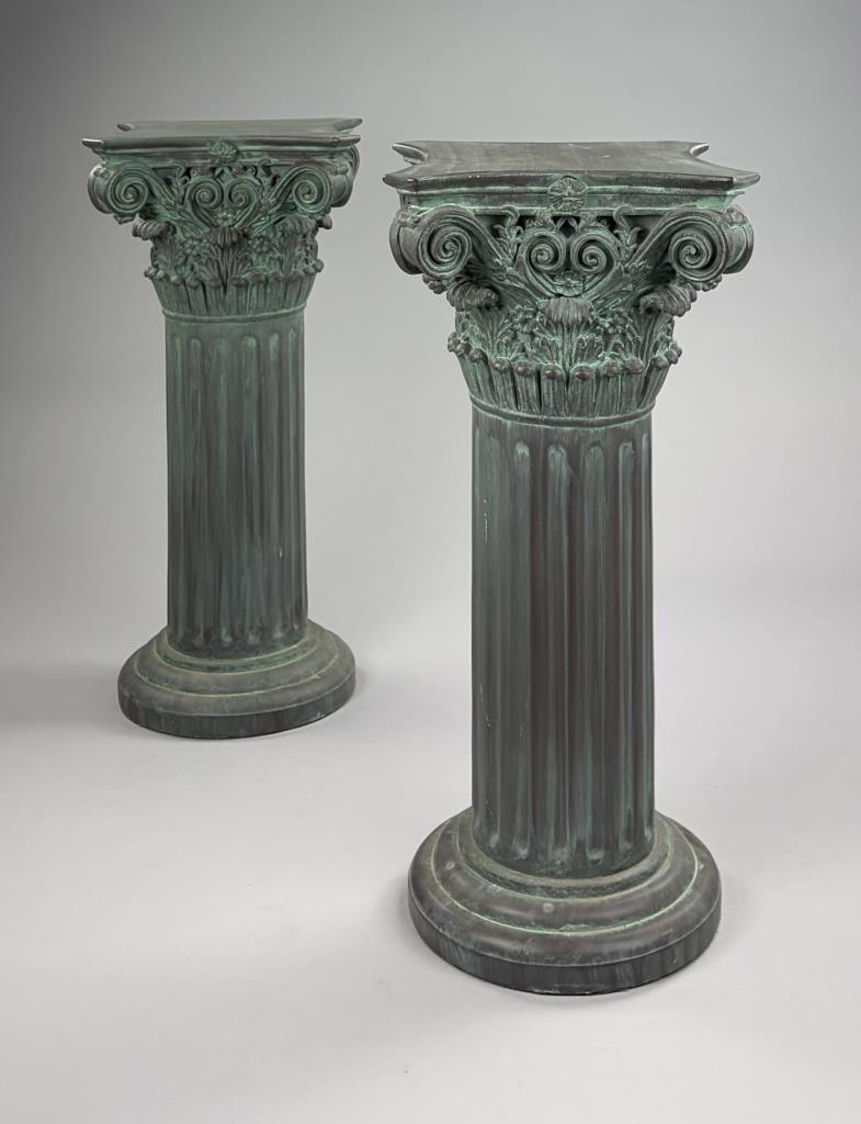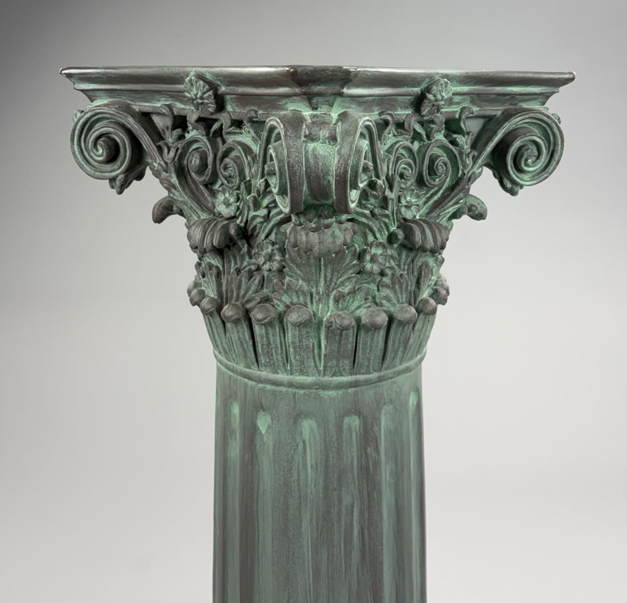 Pair of classical Corinthian style column pedestals, plinths, or stands, faux painted cast resin composite, both are marked on base “Universal Statuary 1999″ for the Universal Statuary Corporation (Chicago, Illinois), late 20th Century, 13-3/4″ x 13-3/4″ x 26-1/2”.