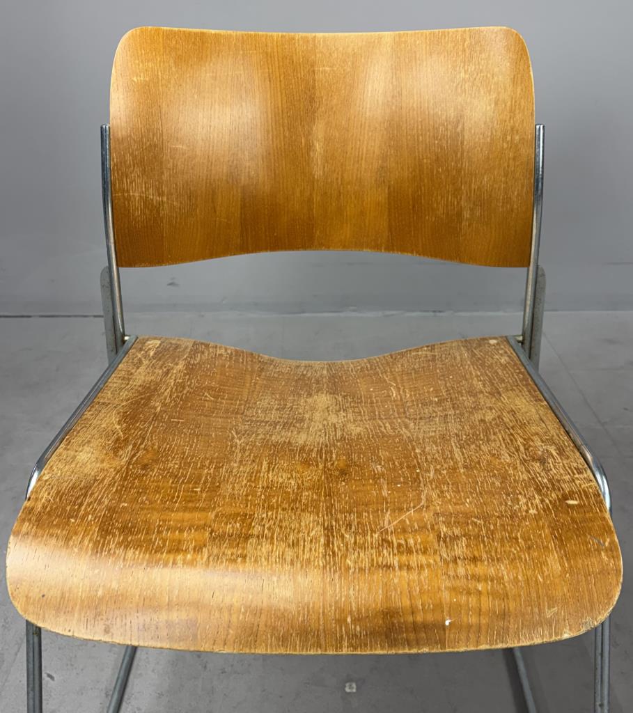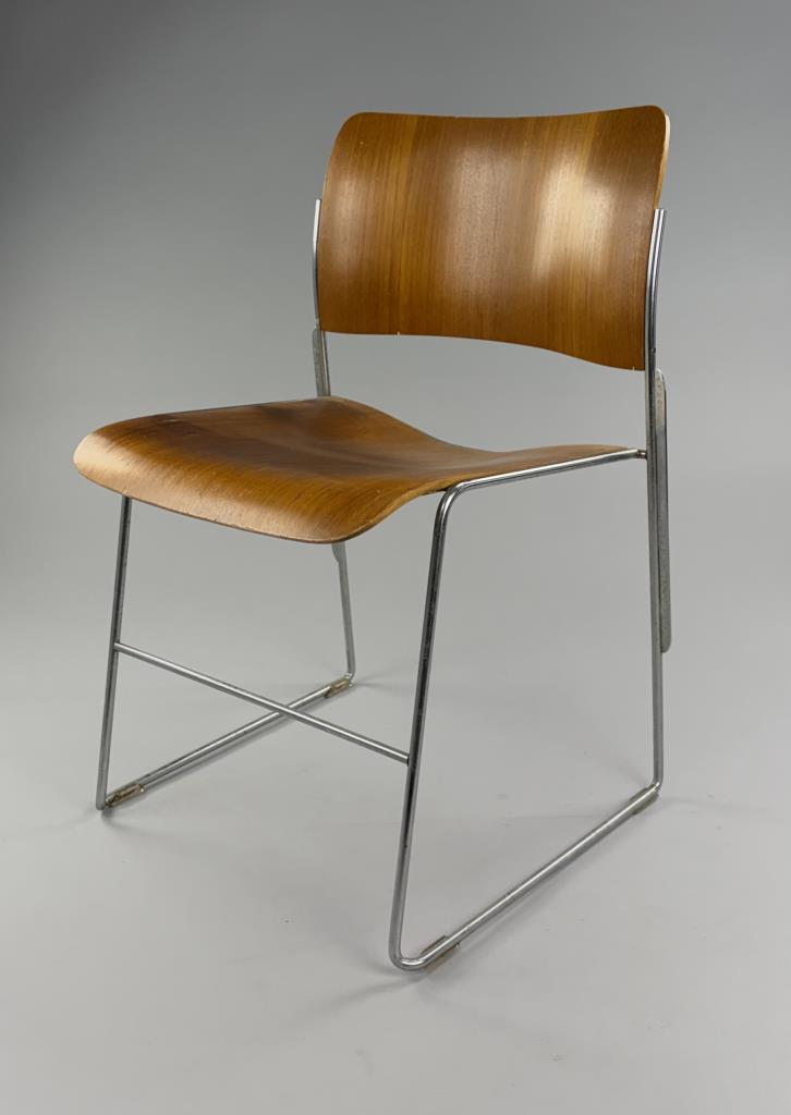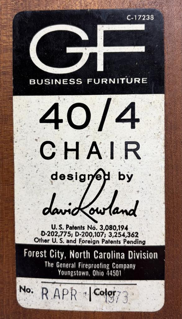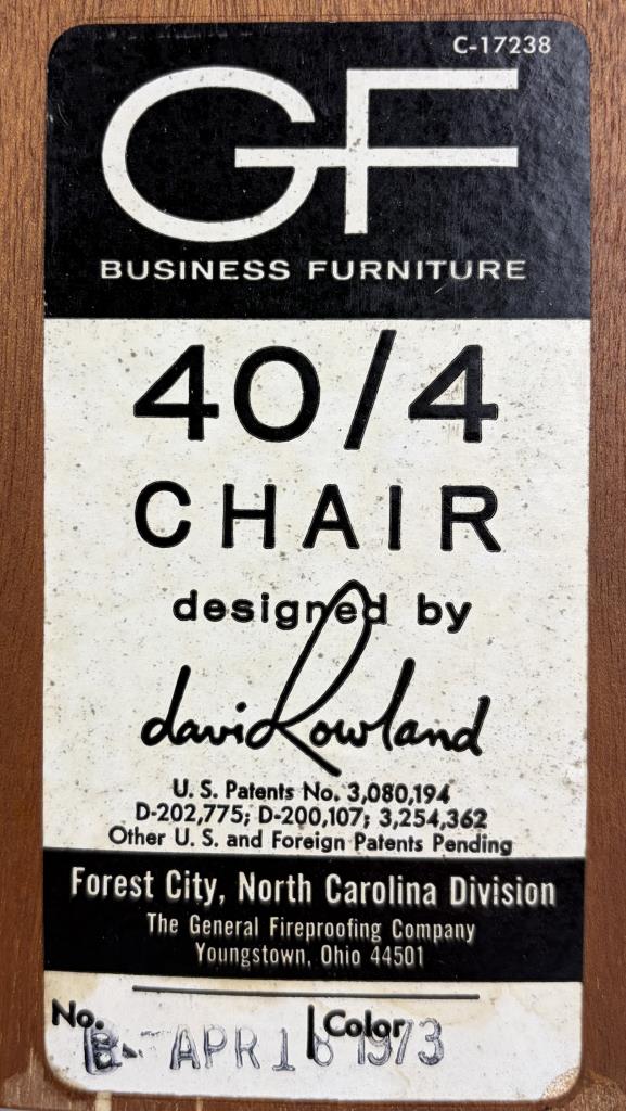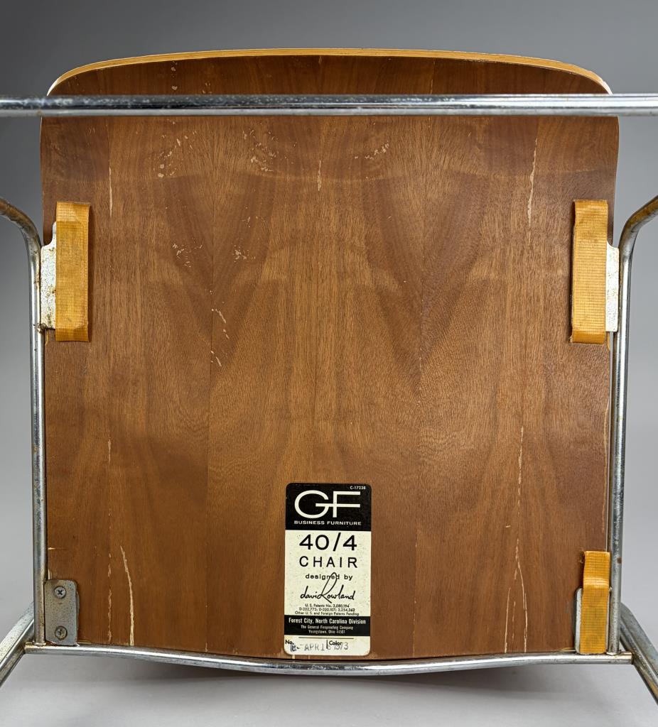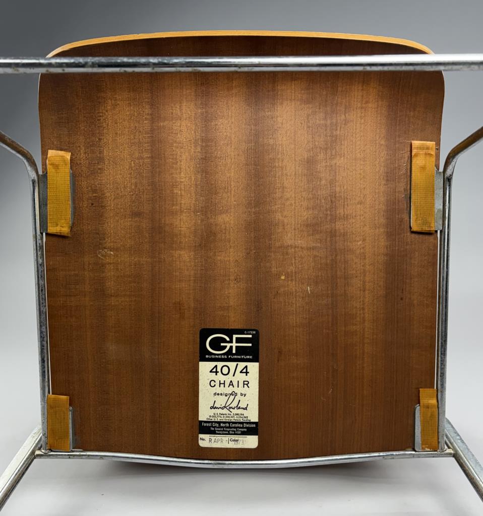 Pair of Mid Century Modern “40/4″ stackable dining or office chairs, designed by David Rowland in 1964 and produced by The General Fireproofing Company (Forest City, North Carolina), both chairs retain their original labels which are dated 1973, each measures 22″ x 20″ x 29-1/2”.