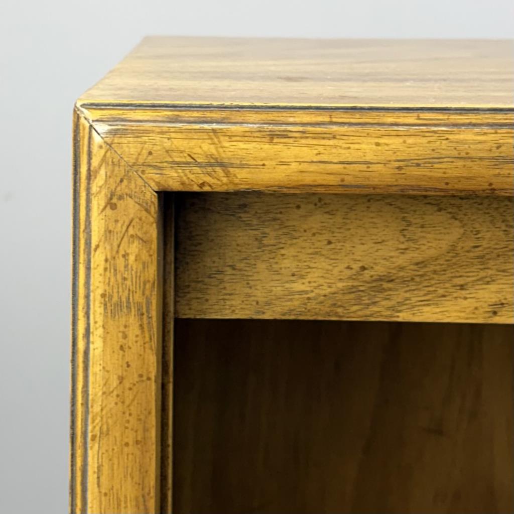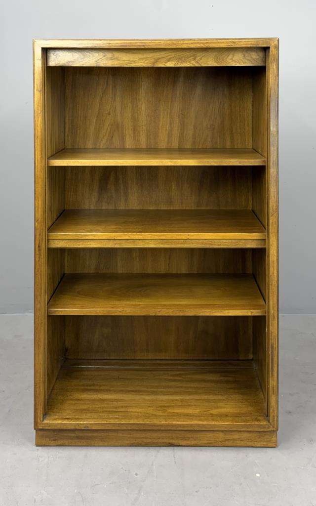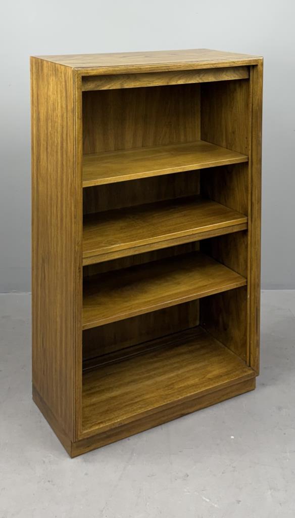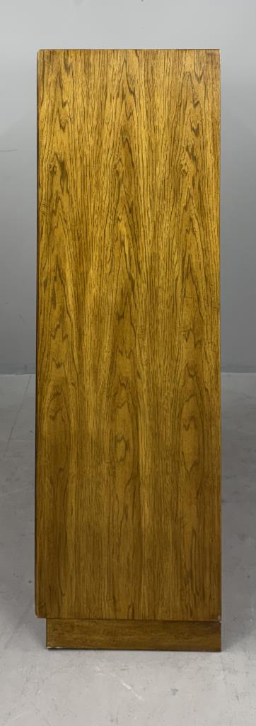 Drexel Heritage Furnishings (Drexel, North Carolina), originally illuminated, campaign style cabinet or bookcase (#990-970-2), from the “Consensus” collection, introduced in the 1970s and designed by Barney Flagg (American, active in the 1960s / 1970s), with two adjustable shelves and one fixed center shelf, flaxen pecan and oak veneer over engineered wood, 16″ x 30-1/4″ x 51″.